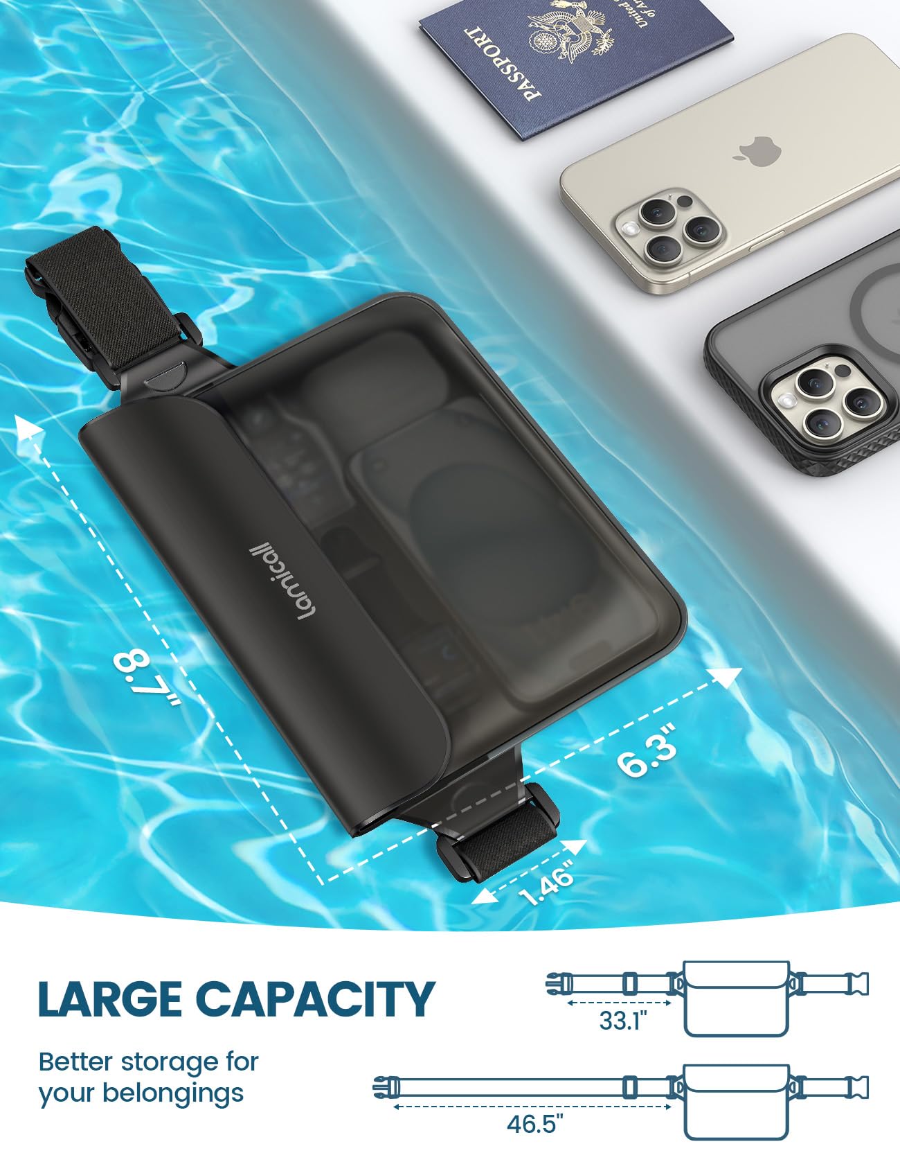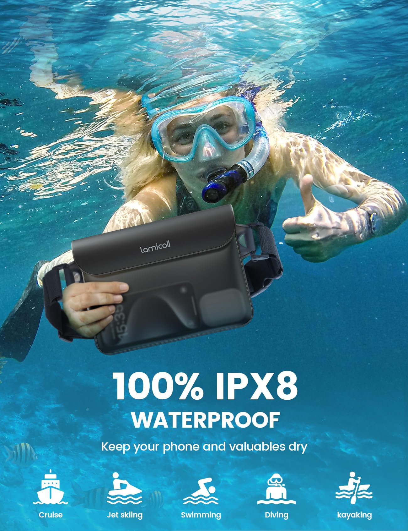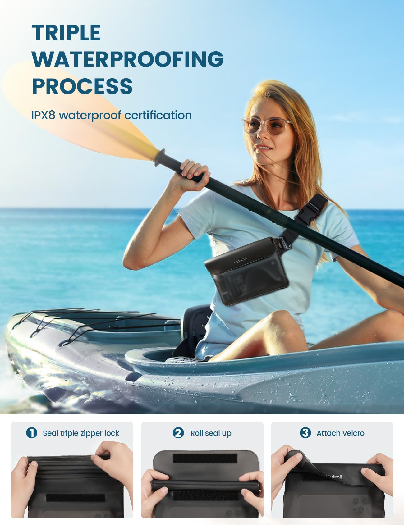 Triple Sealing Tech-100% Waterproof: Lamicall 2024 upgraded waterproof bag featuring superb waterproof seal. With a three-zipper closure system and folding Velcro at the top, it ensures a perfect seal to keep your phone and valuables safe and dry. The super waterproof seal allows you to enjoy boating, kayaking, fishing, hiking, surfing, camping without worrying about water and dust seeping in. Travel, Vacation Must haves.