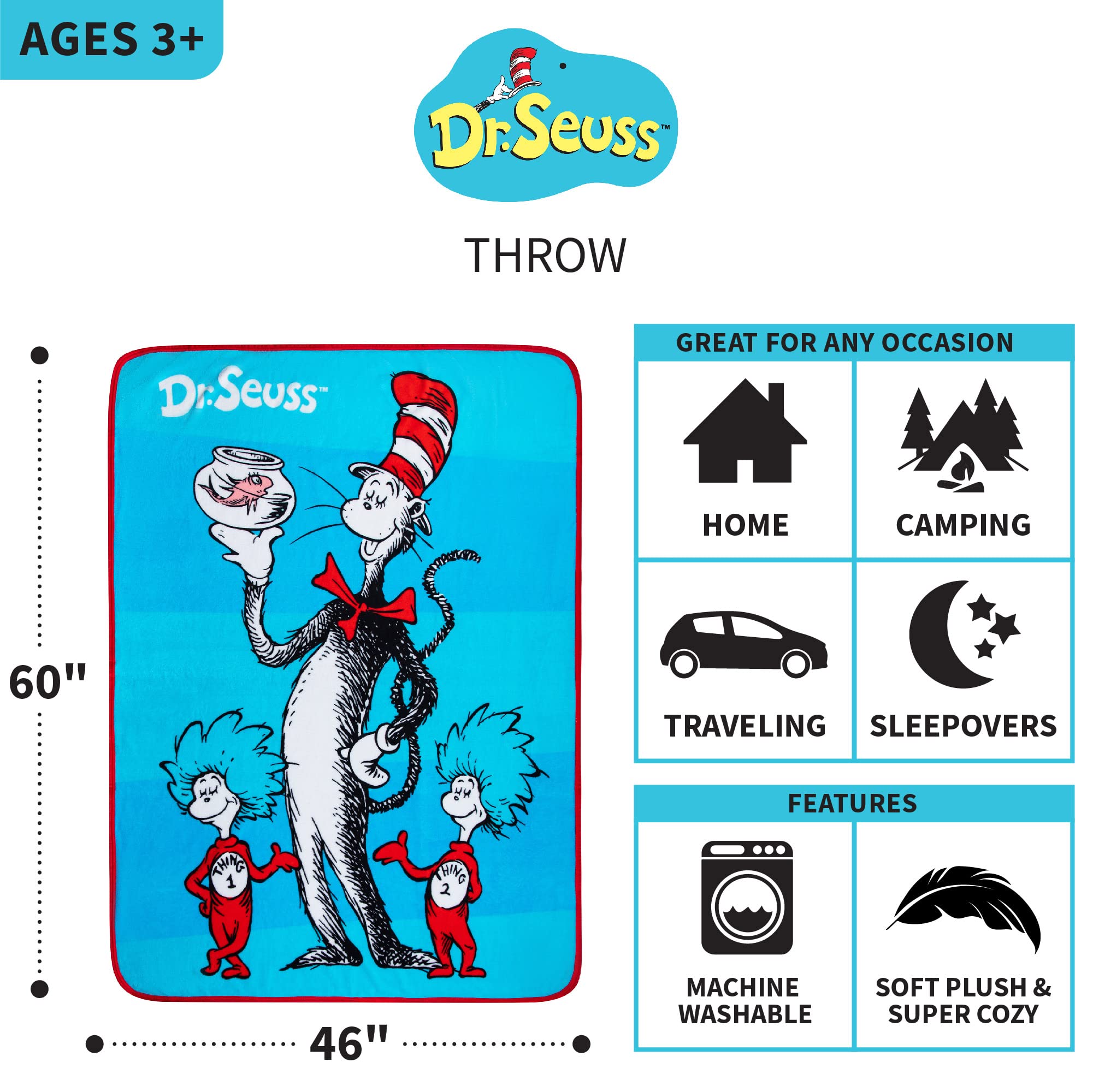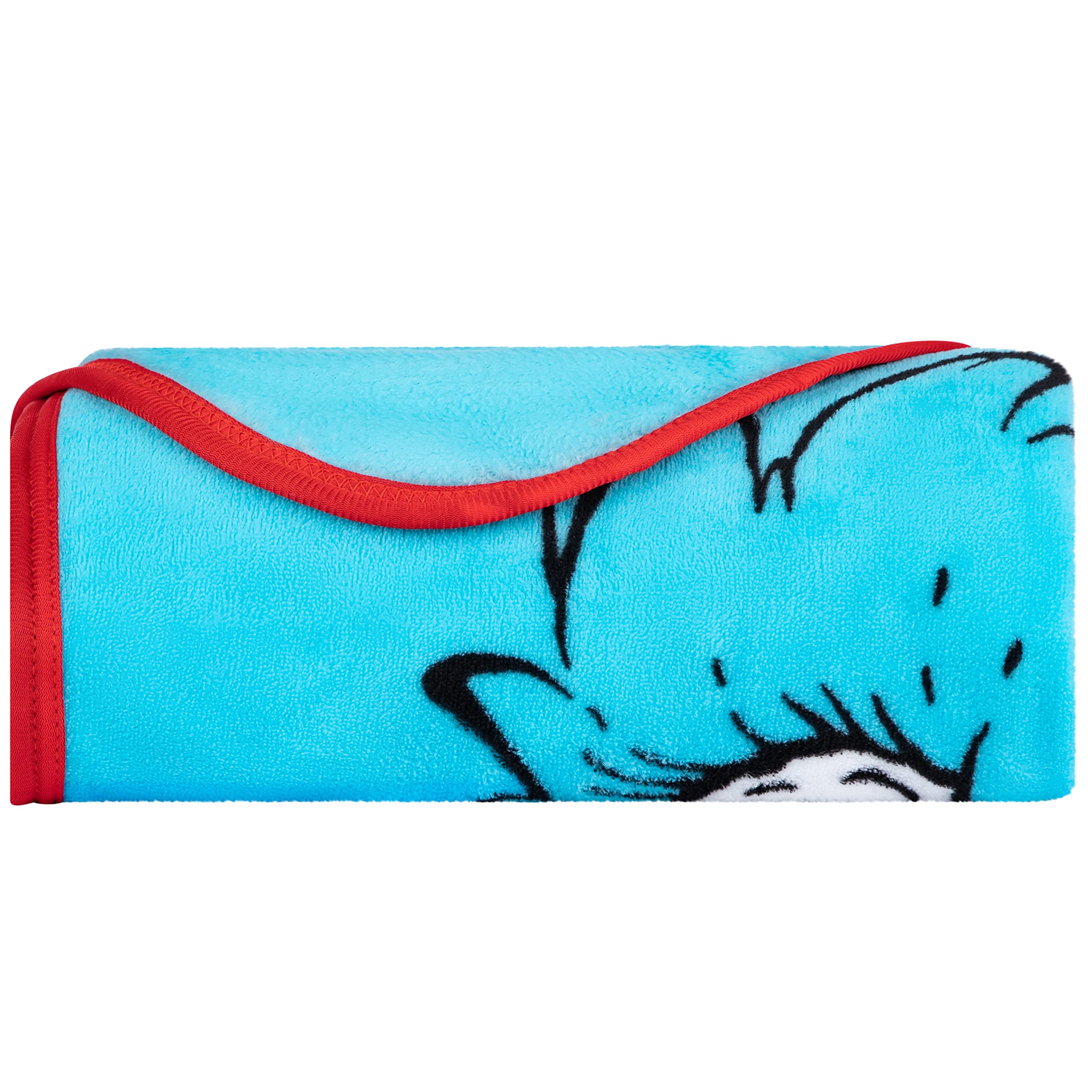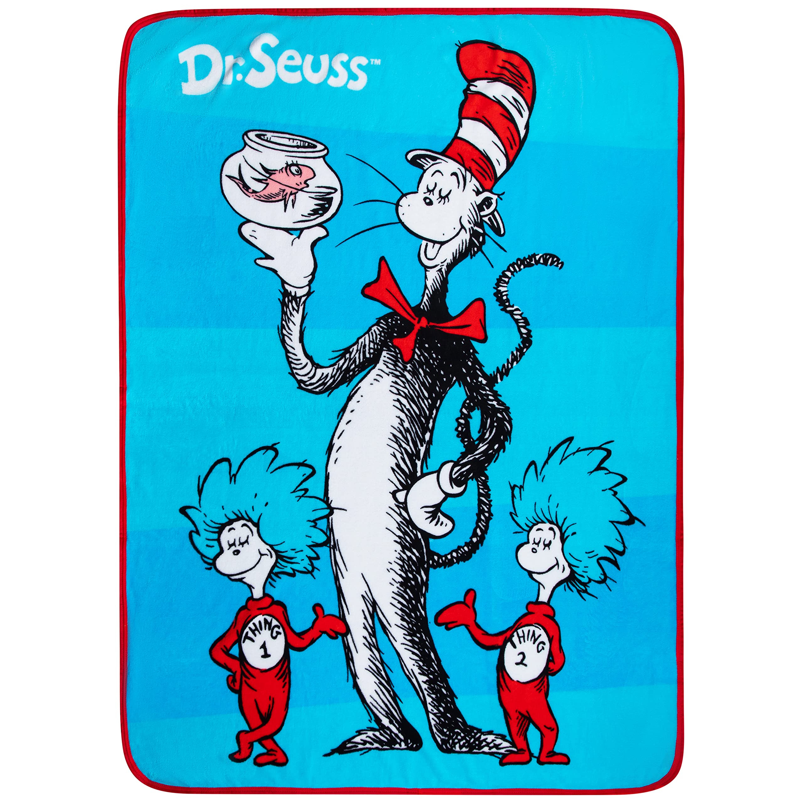 DR SEUSS CAT IN THE HAT DESIGN: The iconic Dr. Seuss character The Cat in the Hat and his companions Thing 1 and Thing 2 are ready for some cozy fun and adventure with this "Playful Cat" themed plush throw.