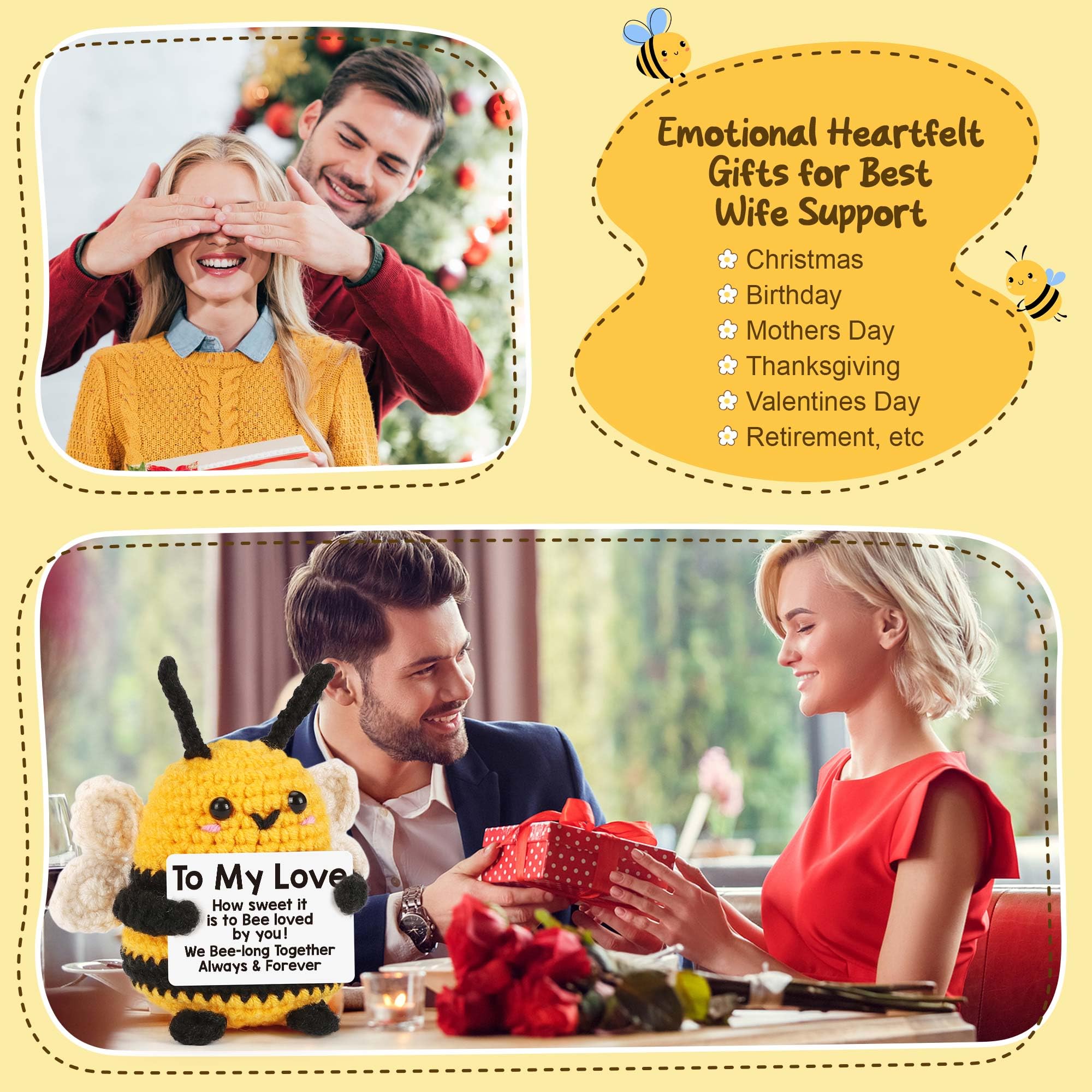 Positive Crochet Bee Emotional Gifts for Her, Romantic Valentines Day White Elephant Christmas Presents for Husband, Wife, Boyfriend, Girlfriend, Care Her Gifts Handmade Knitting Bee Doll