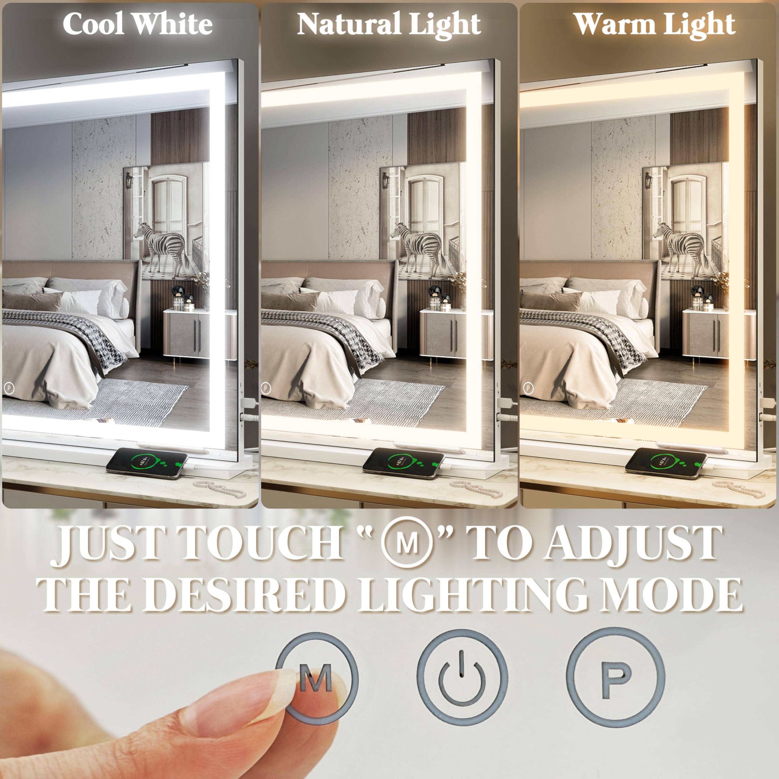 💗【Adjustable Brightness & 3-Color Lighting Modes】including cold light/daylight/warm light three color settings, the brightness of each color can be adjusted; simulating lighting in various occasions to meet personal makeup needs. "M" button on the left is used to change the light mode, the middle button is used to turn on and off, and the "P" button on the right is used to adjust the brightness.