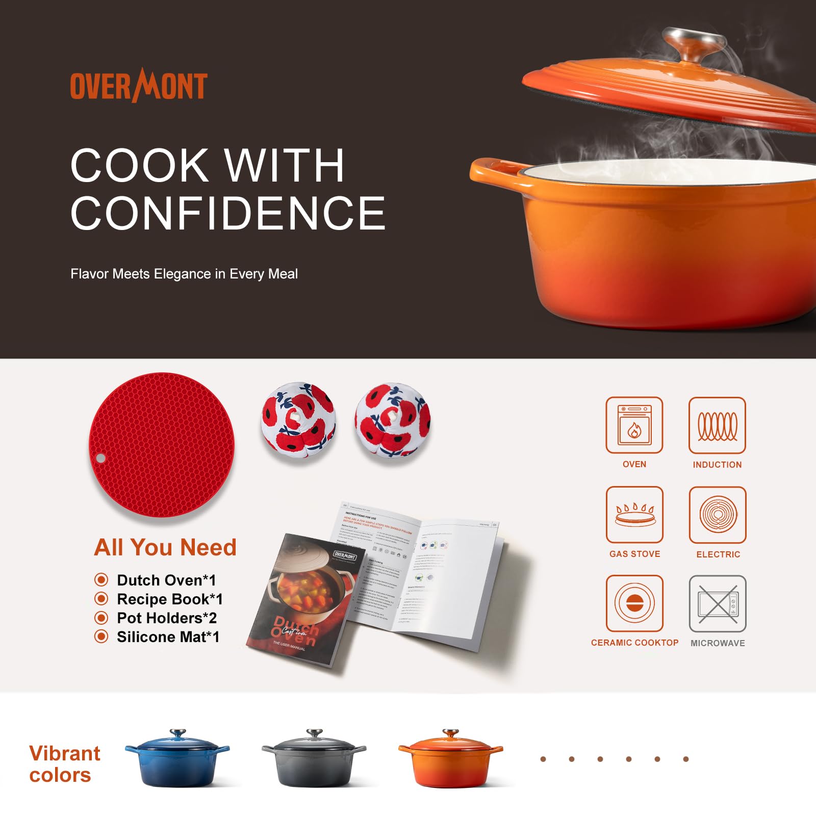 Elevate your cooking experience with the Overmont Enamel Cast Iron Dutch Oven, a culinary masterpiece designed for exceptional heat mastery, flavor preservation, and versatility. Whether you're a seasoned chef or a home cook, this Dutch oven is an essential addition to your kitchen, combining classic craftsmanship with modern upgrades for effortless cooking. Crafted from heavy-duty enamel cast iron, the Overmont Dutch oven ensures even heat distribution and remarkable heat retention, allowing for consistent cooking every time. The one-piece, solid construction provides unmatched durability, ensuring your Dutch oven lasts for years. The upgraded arched lid creates a micro-pressure environment, which enhances heat circulation, locking in the natural flavors of your ingredients. This unique design makes cooking more efficient and energy-saving, reducing cooking times while keeping your dishes tender and full of flavor. Say goodbye to dry or overcooked meals! The Overmont Dutch oven features an upgraded lid with water ripple-shaped raised condensation points that collect steam essence and evenly drip it back onto your food. Unlike traditional lids, where condensation runs down the sides, this innovative lid keeps your dishes moist, succulent, and packed with flavor. Additionally, the lid is cast as a single piece, providing a strong seal that effectively isolates steam from the knob. This feature prevents rust or water droplets from contaminating your food, ensuring both safety and pure, delicious flavors every time. Our Dutch oven is designed with both safety and convenience in mind. The widened, upward-angled loop handles provide an ergonomic grip for easy lifting, even when you're wearing oven mitts. No more struggling with awkward handles! The upgraded step-style lid knob increases the distance between the knob and the hot steam, reducing the risk of burns and making it safer to handle. The Overmont enamel Dutch oven is compatible with a wide range of stovetops, including gas, electric, and ceramic, giving you flexibility in your cooking methods. It’s also oven-safe up to 500℉, allowing for a variety of cooking techniques, from stovetop to oven baking. Whether you're making a slow-cooked stew or a roasted dish, this Dutch oven is perfect for any recipe. The Overmont Dutch oven features a smooth, flat enamel surface that makes cleaning effortless. Made from food-grade enamel, it’s non-toxic and free from PFOA and PTFE, ensuring a safe cooking environment. Its easy-to-clean surface means less time spent scrubbing and more time enjoying your delicious meals. Looking for the ideal gift? The Overmont Enamel Cast Iron Dutch Oven is an exceptional choice. This premium set comes beautifully packaged and includes a detailed user manual, 10 delicious recipes to inspire your culinary journey, two protective cotton heat-resistant caps, and a heat-resistant pad. The lid’s surface texture has been optimized for a distinctive brand look, making it a unique and thoughtful gift for Christmas, birthdays, weddings, housewarmings, or any special occasion. Whether you're gifting it to a culinary enthusiast or adding it to your own kitchen, this Dutch oven is sure to impress.