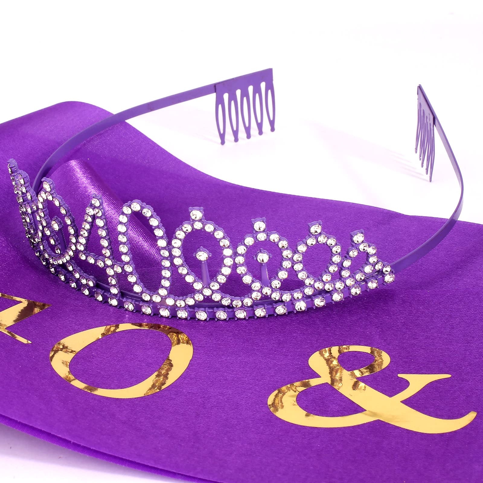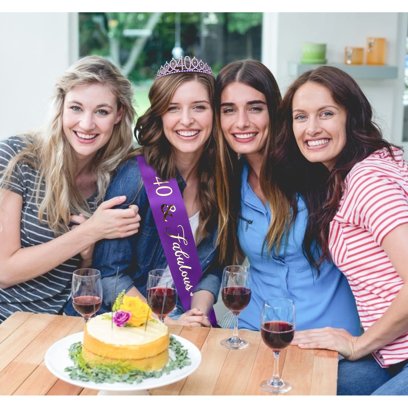 The Perfect 40th Purple Birthday Decorations for Women: "40 & Fabulous" birthday sash + rhinestone 40 purple tiara.