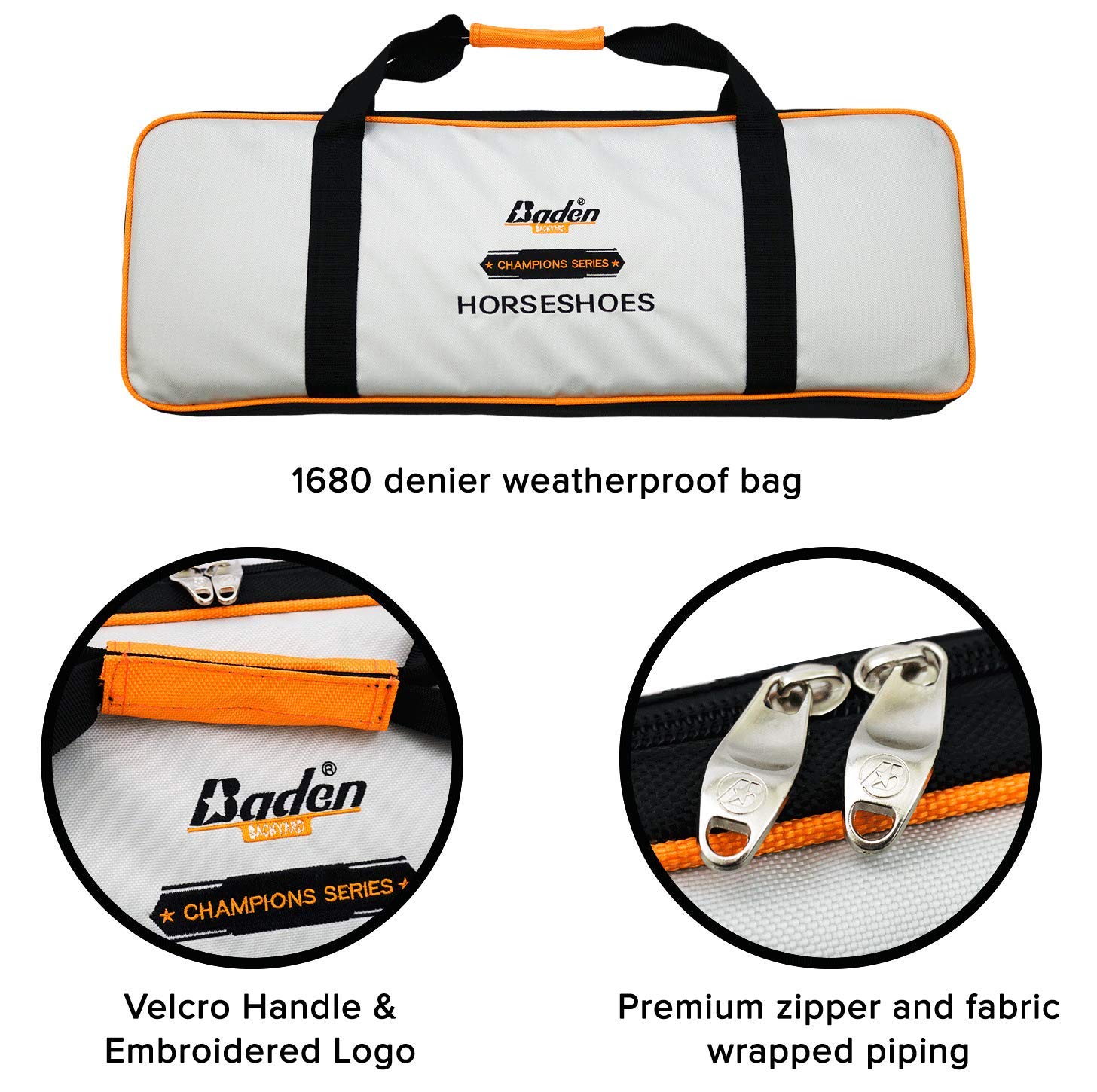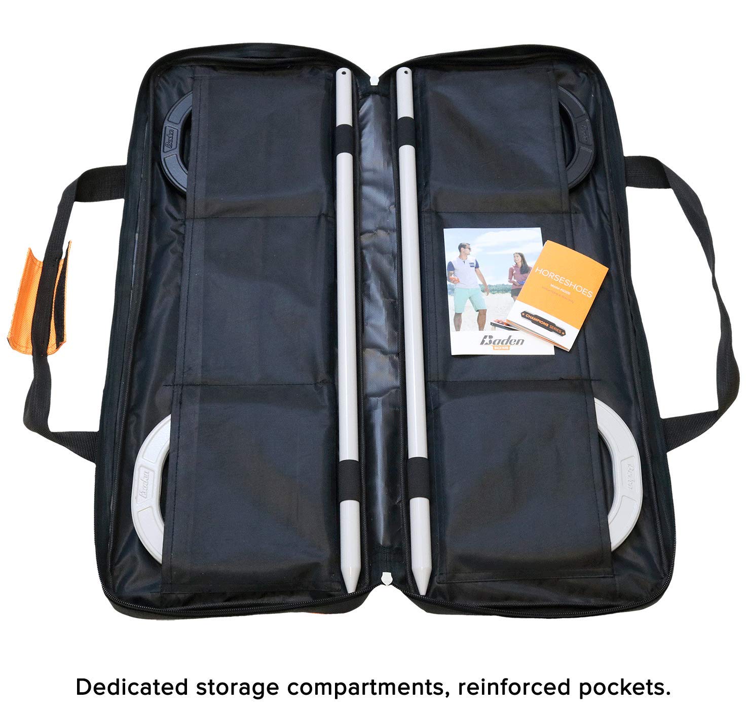 Set comes in 1680 denier durable nylon bag with reinforced pockets, dedicated storage compartments for horseshoes and stakes, and Velcro handle for easy carrying