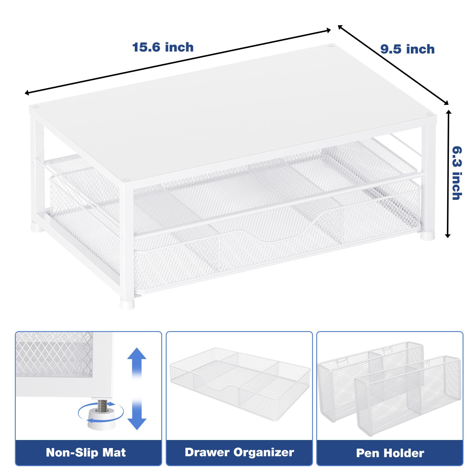 【Save Space】:This 2-Tier monitor stand with drawer and 2 hanging pen holders provides ample storage space to keep your office supplies and office desk accessories neatly organized and easily accessible, keeping your workspace tidy and improving your sense of well-being