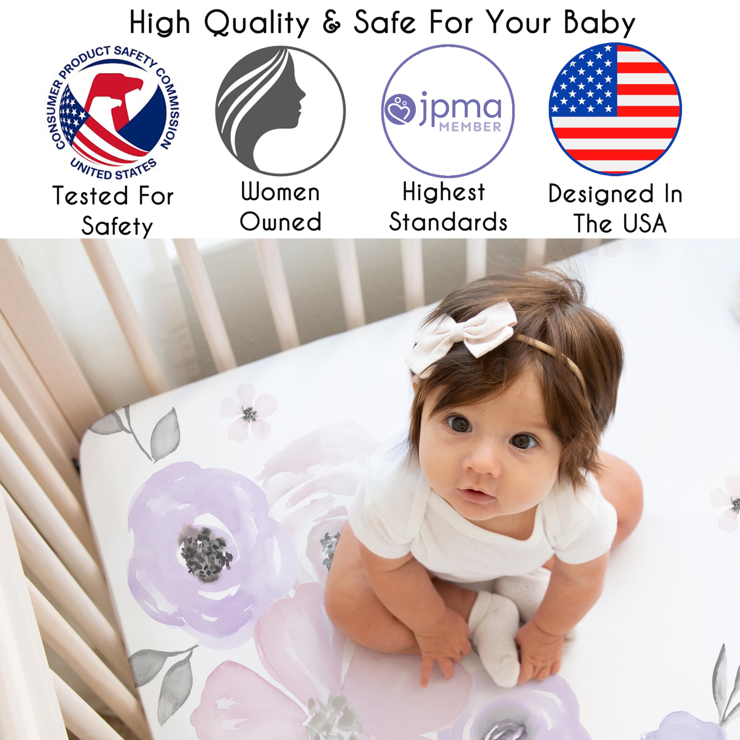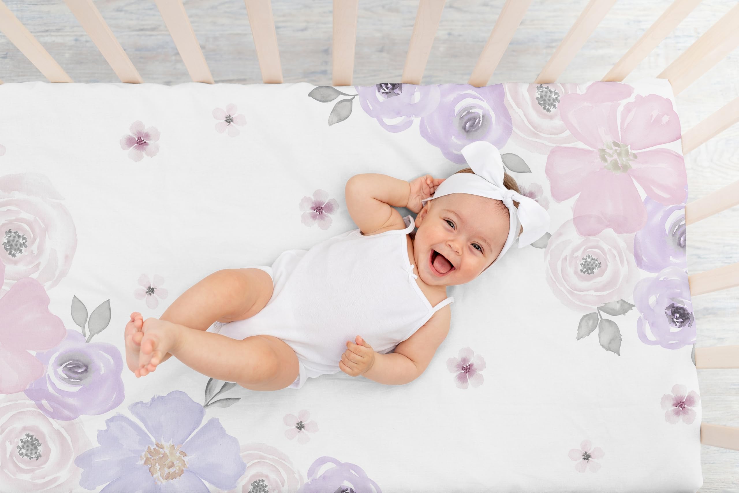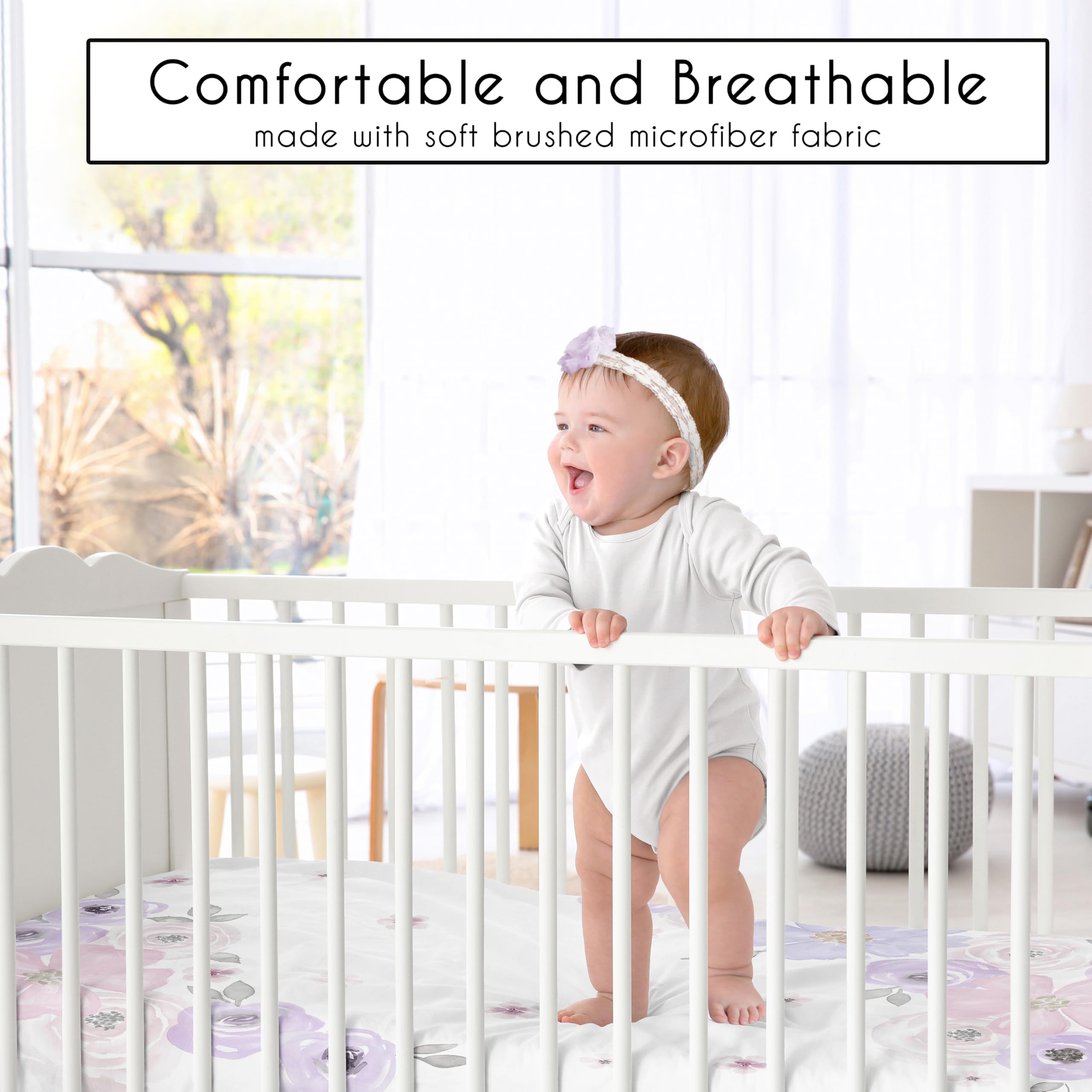 SNUG FIT: Includes (1) Fitted Crib Sheet 52in. x 28in. x 8in. Our newborn standard crib sheets fit snugly, with premium elastic sewn around the entire bottom edge for a secure fit on most standard sized cribs and toddler beds, to reduce shifting and bunching. This brushed microfiber crib sheet features an exclusive design of purple lavender & grey shabby chic, boho, farmhouse, bohemian, garden, watercolor flower, floral print and is gentle on delicate skin to foster a soothing sleep environment.
