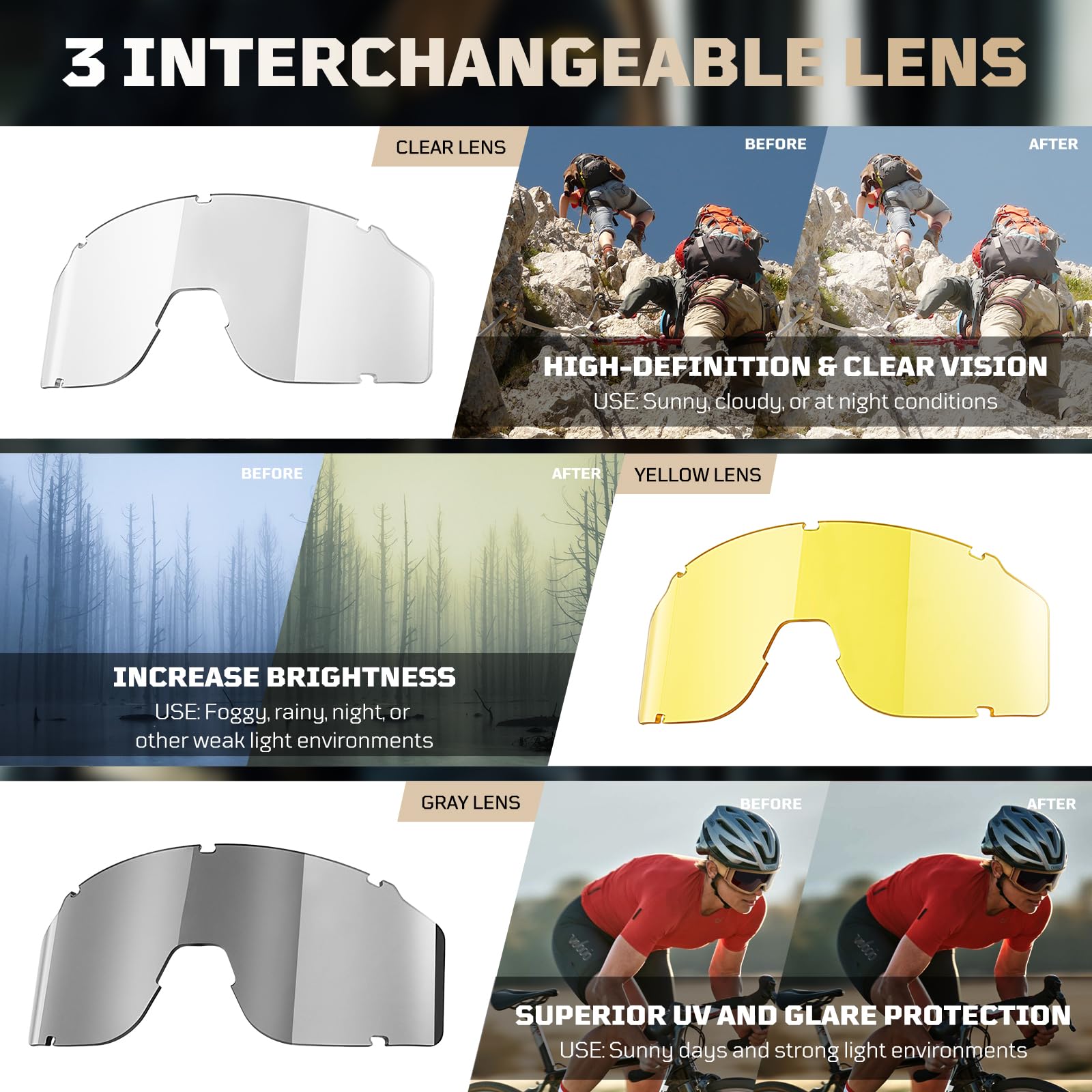 3 Interchangeable Lenses: Equipped with three easily replaceable lenses, these glasses ensure clear vision in all weather and light conditions, adapting seamlessly to diverse environments