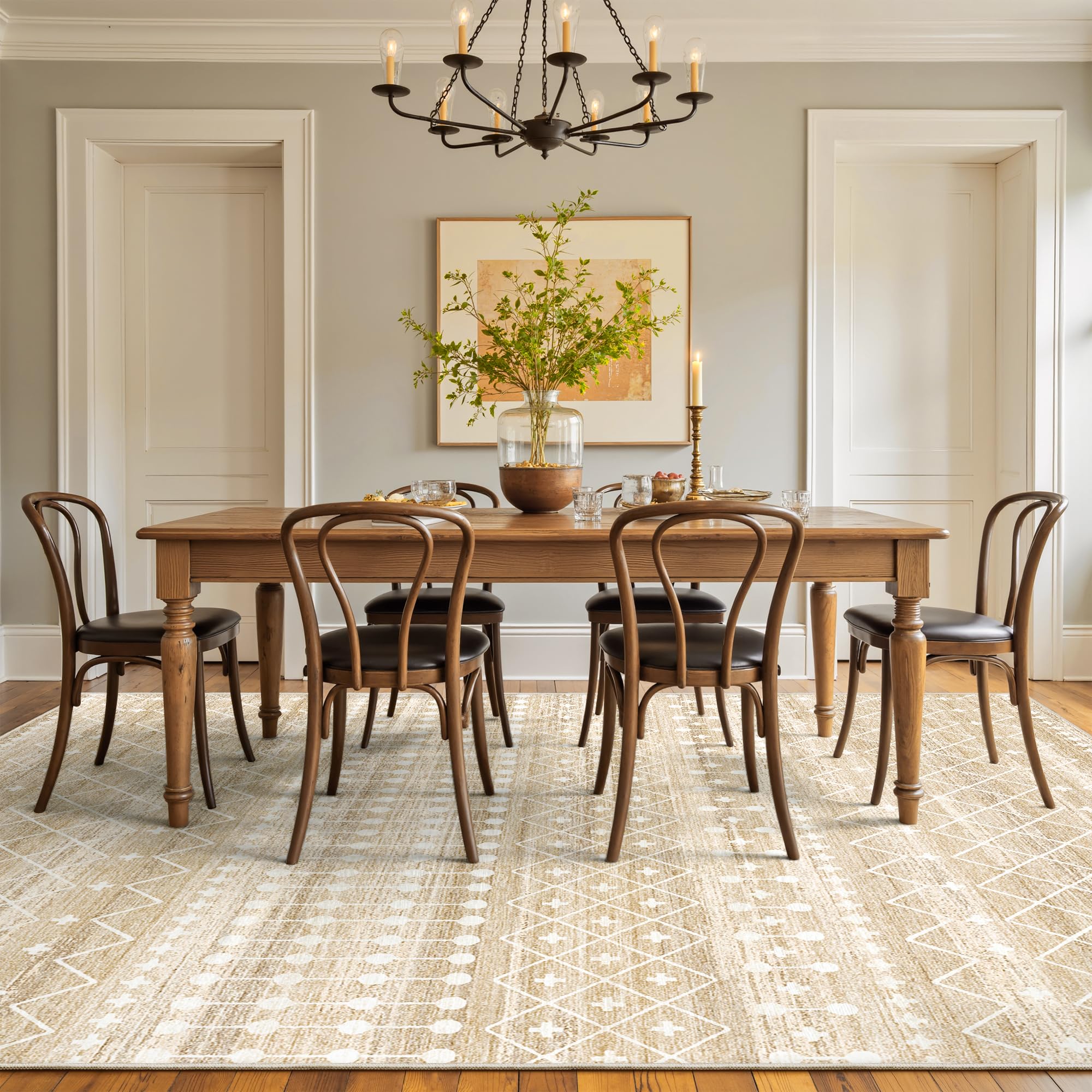 Moroccan-Style Design: This area rug features a Moroccan-inspired pattern, combining geometric lines and shapes that effortlessly complement any interior design style.