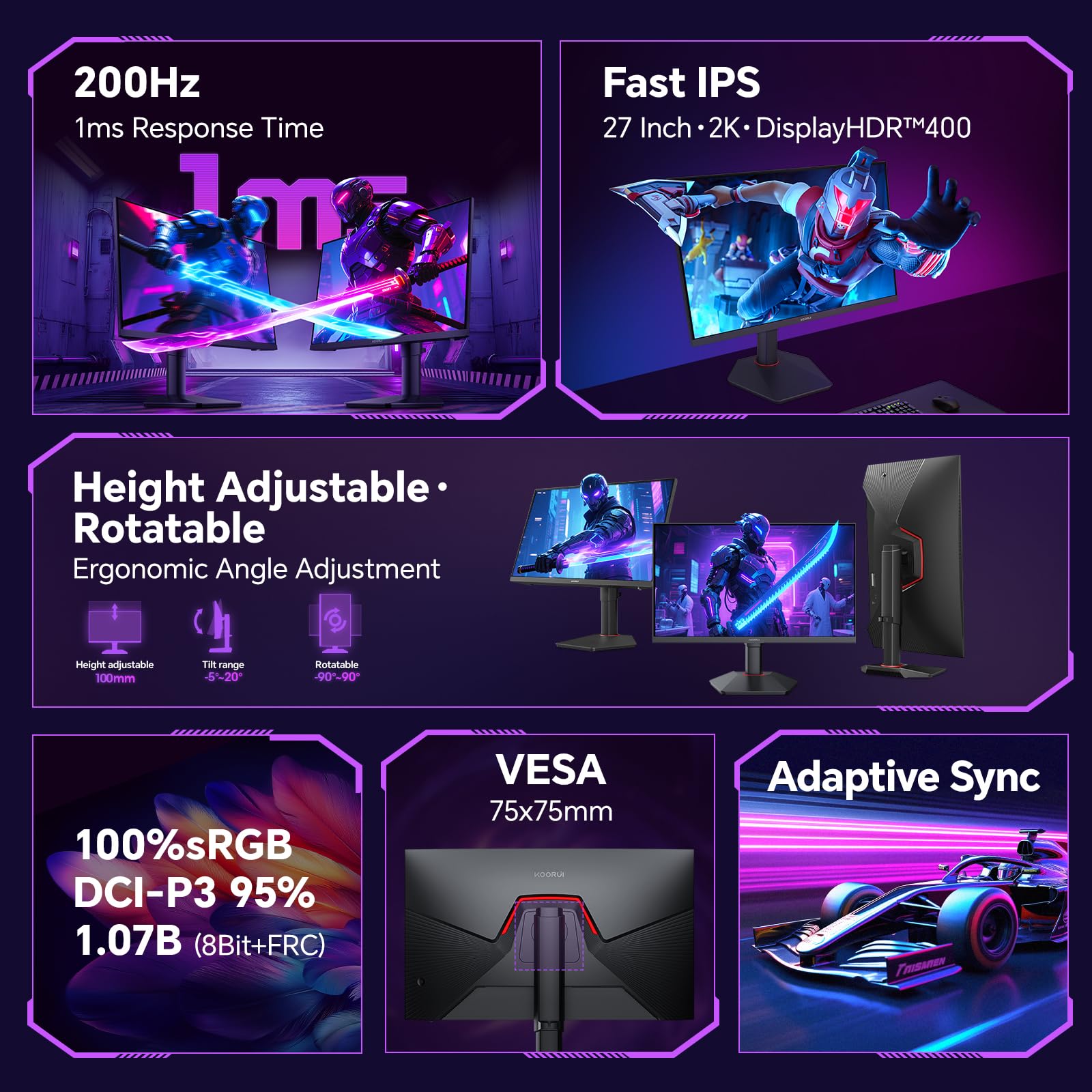 Fast IPS and HDR400 Technology: The KOORUI G2722P monitor is equipped with a Fast IPS panel, offering a wider viewing angle and more accurate color performance. With a 178° wide viewing angle, the image remains sharp and vibrant from any perspective. HDR400 technology further enhances brightness and contrast, making dark areas more detailed and bright areas more vivid, resulting in a more realistic visual effect.