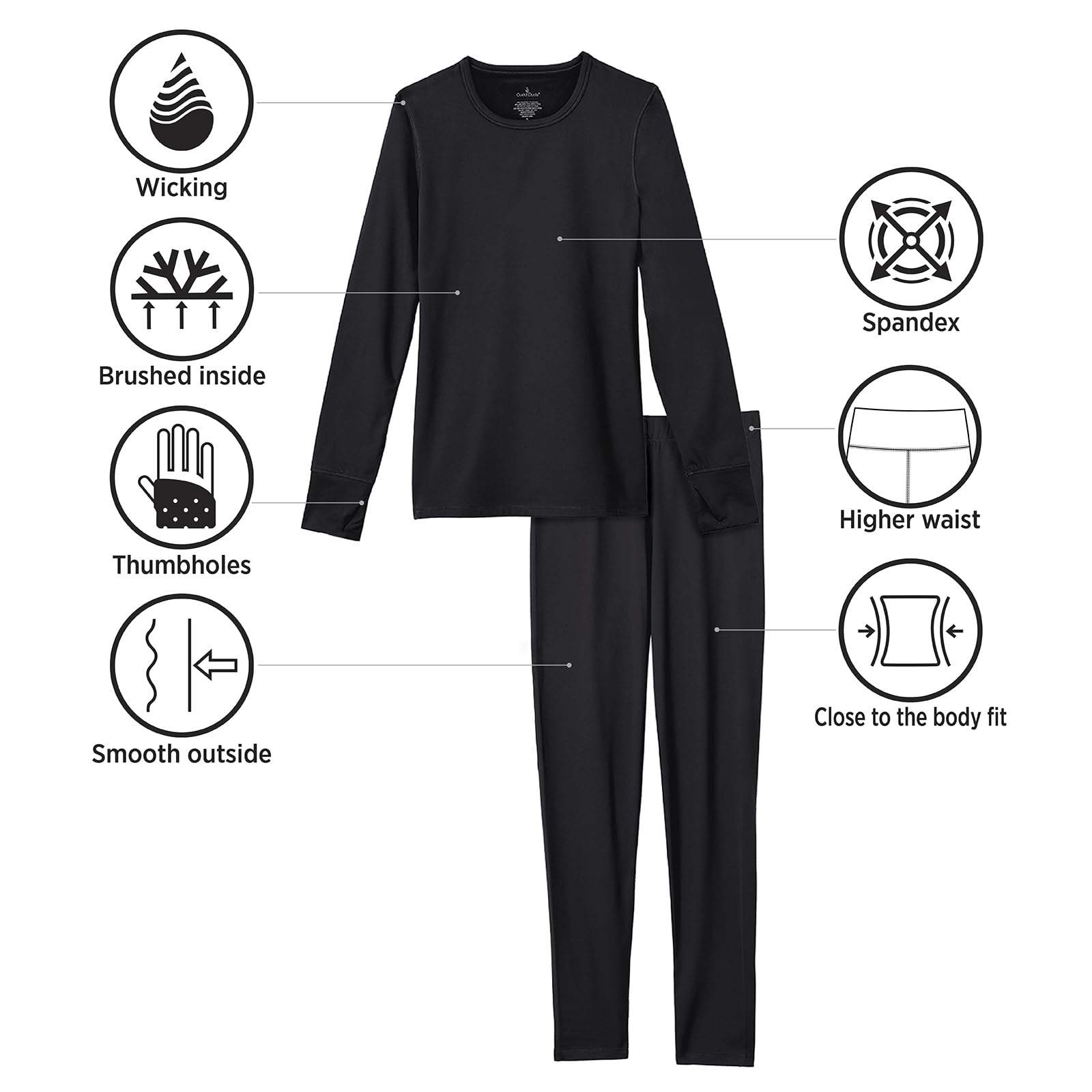 COLD-WEATHER READY: With a fabric weight of 235 GSM, this heavyweight thermal set for women is perfect for colder days. It’s warmer and more substantial than our lightweight everyday active base layer set. The brushed fleece interior helps retain body heat, while moisture-wicking and breathable fabric technology work together to absorb and evaporate moisture - keeping you warm, dry, and comfortable all day long.