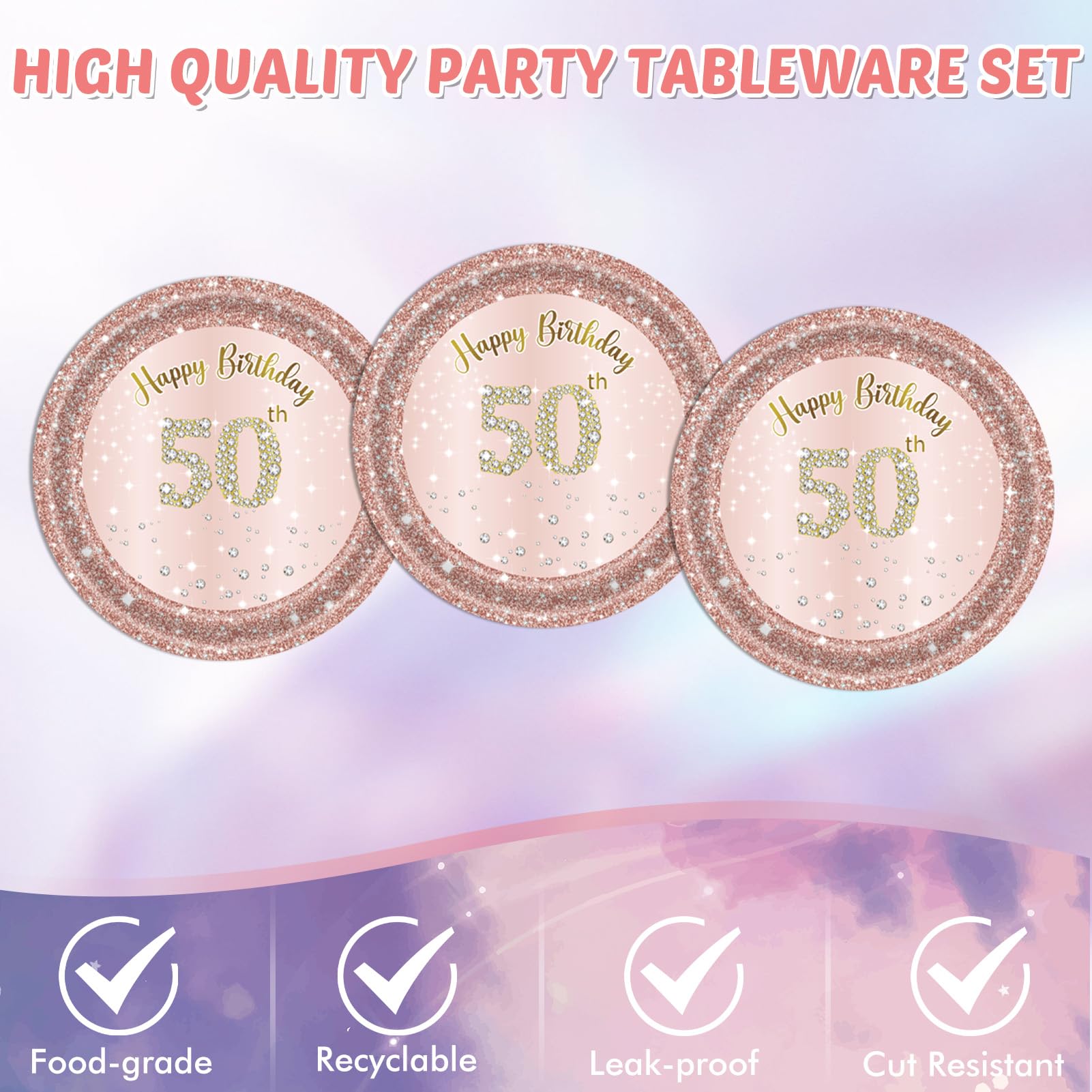 【Why choose us:】 We are a company specialized in ladies party supplies. "Women" is a great word. The world is a better place because of women. So we have planned a series of products for female friends. Our beautifully designed 50th party decoration tableware for women combines convenience, quality and style.Our 50th birthday party supplies are perfectly adapted to every occasion.Whether you're hosting a surprise party for a loved one or planning your own milestone celebration, 50th Birthday is the best choice to make sure that you have happy 50th birthday decorations to make your party event unforgettable. [Package Contents:] 20Pcs x 7'' 50th Rose Gold Birthday Plates 20Pcs x6.5'' 50th Rose Gold Napkins 1Pcs x 50th Rose Gold Tablecloth