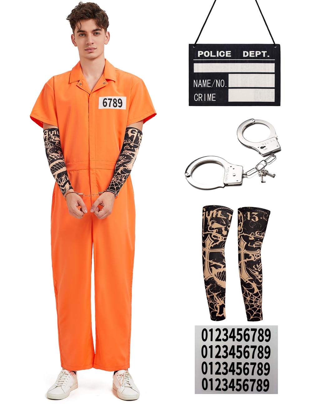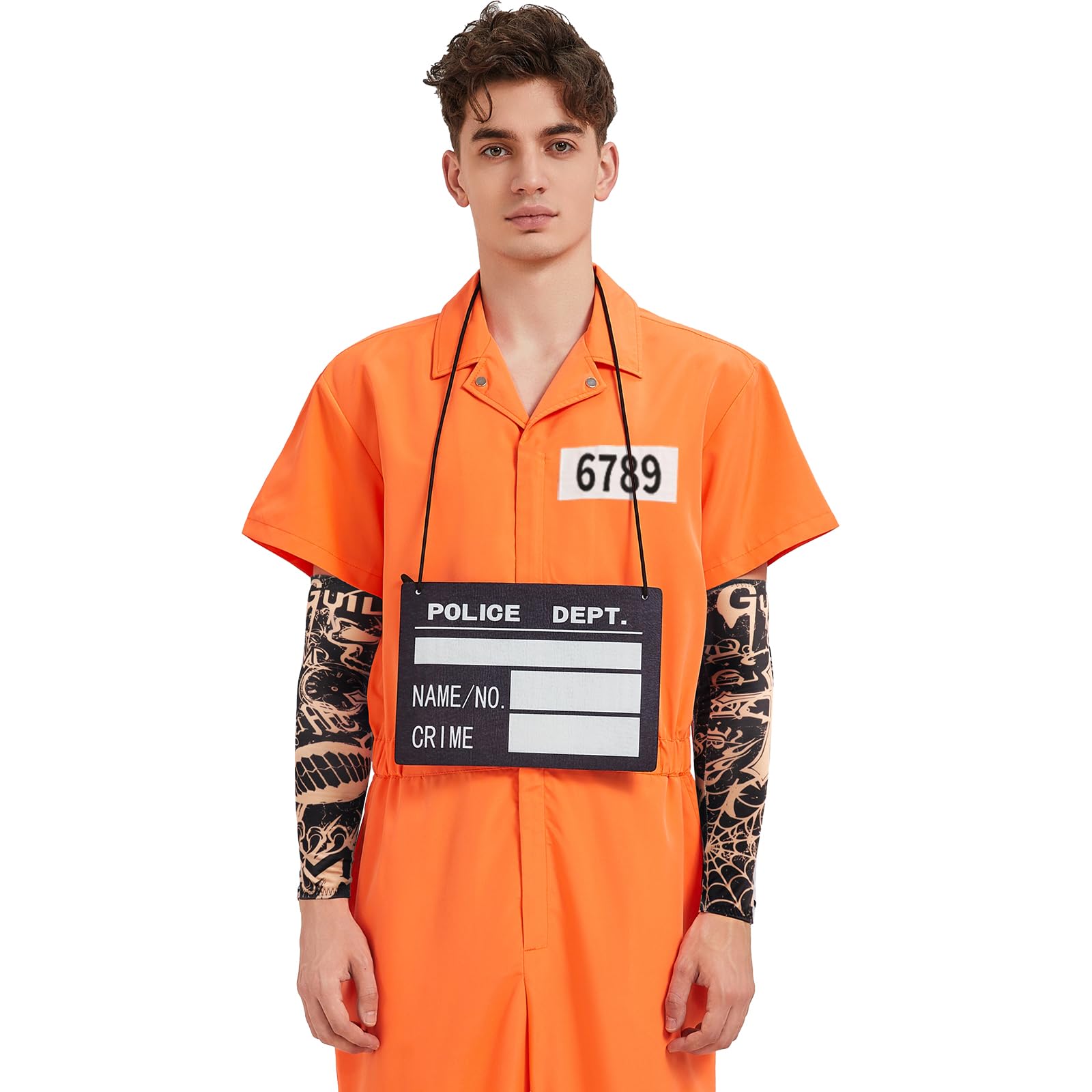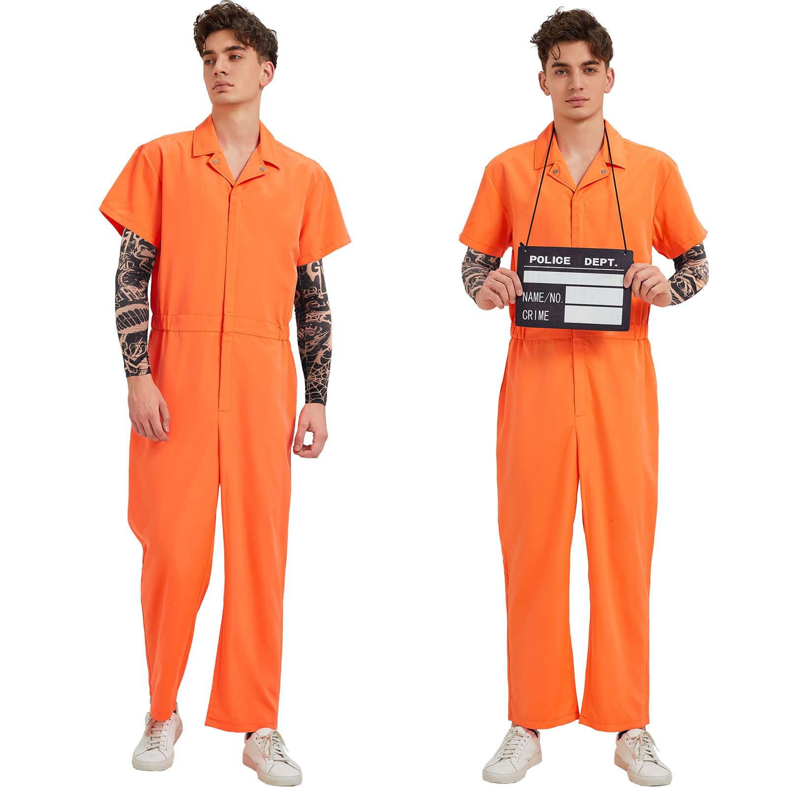 Prisoner Jumpsuit Set Include:1*orange prison jumpsuit,2* tattoo arm sleeves,1*number stickers,1*nameplates.Perfectly recreate the prison style of prisoners.Tattoo Sleeves are excellent accessories for daily life,parties,halloween,night outings,sports,bars,stage performances, etc.
