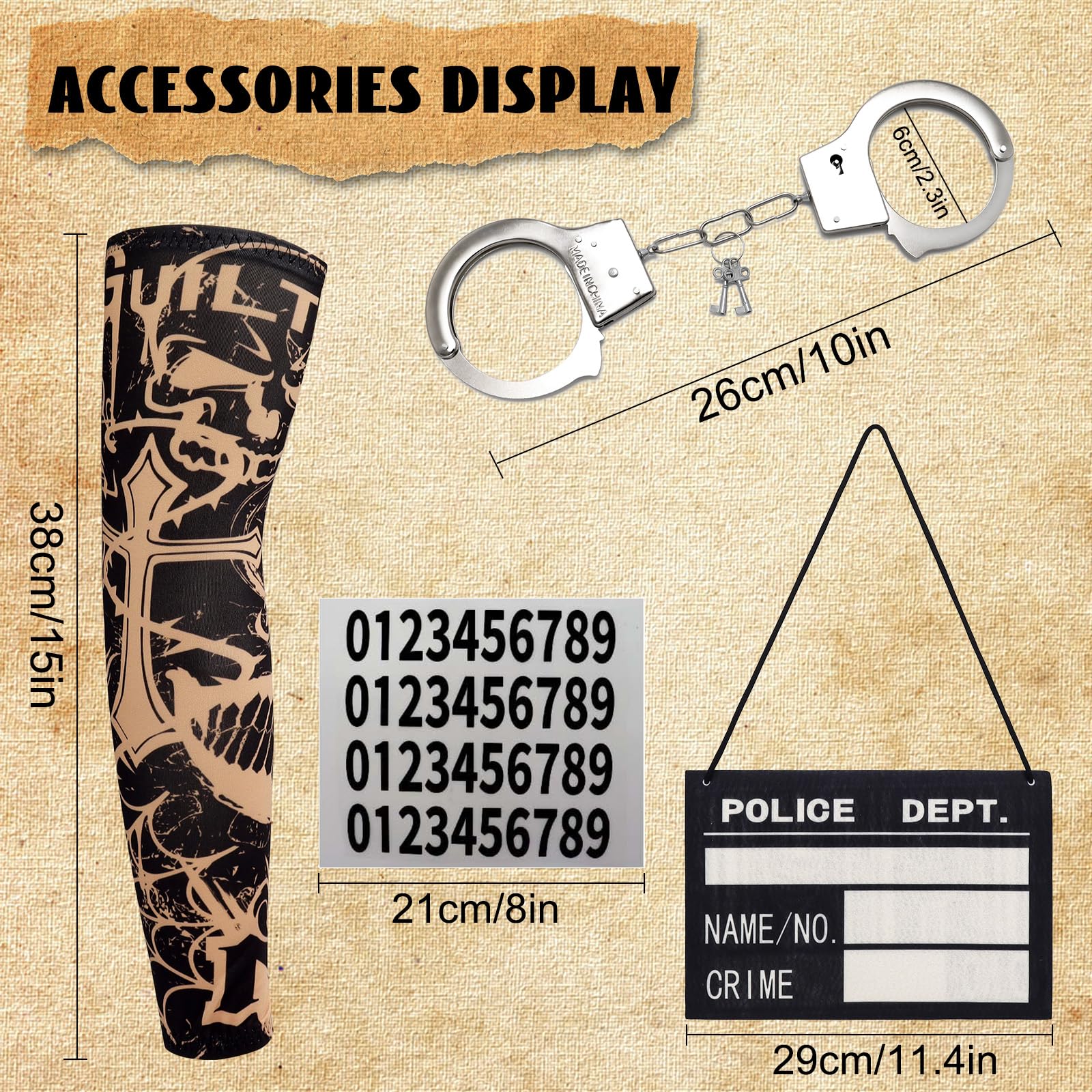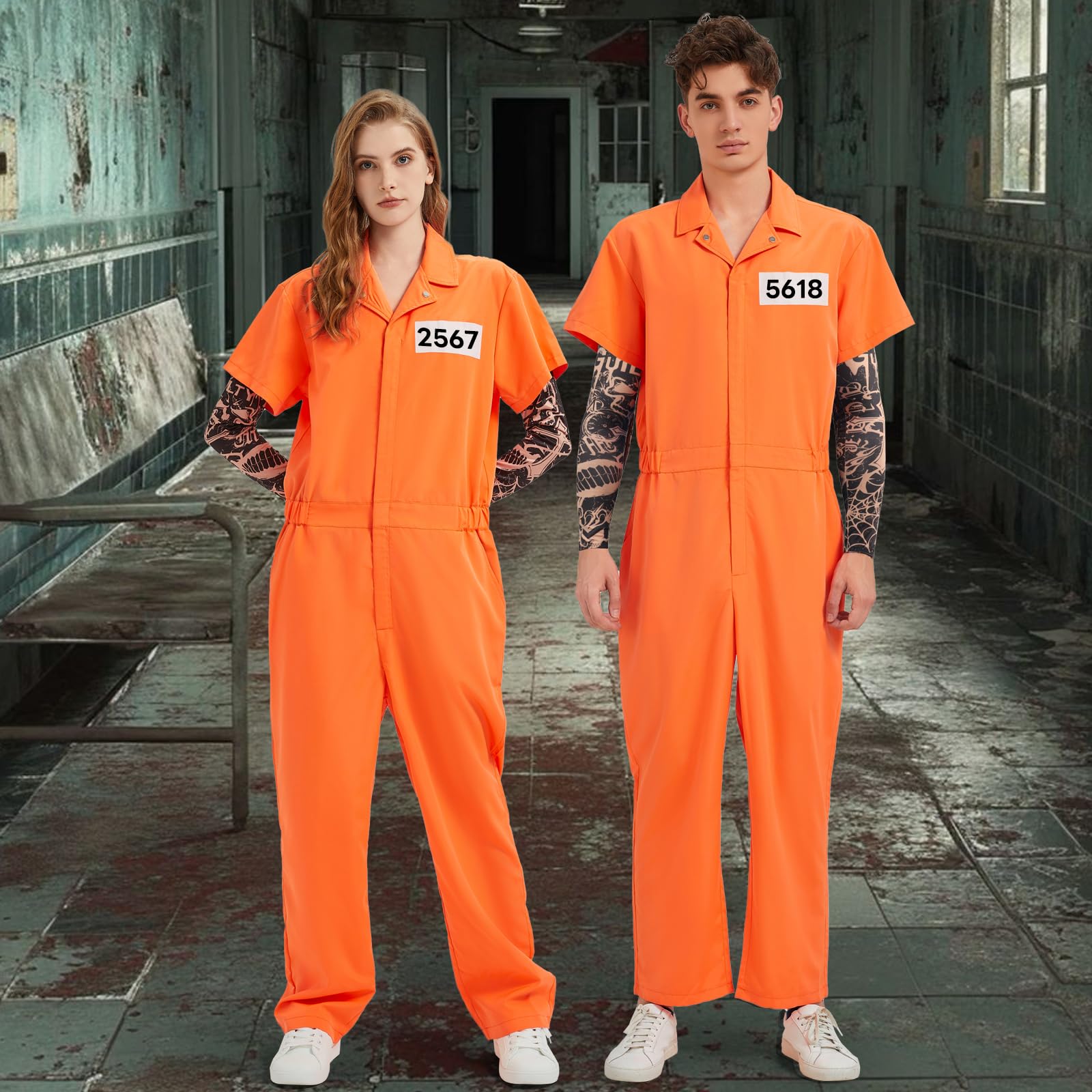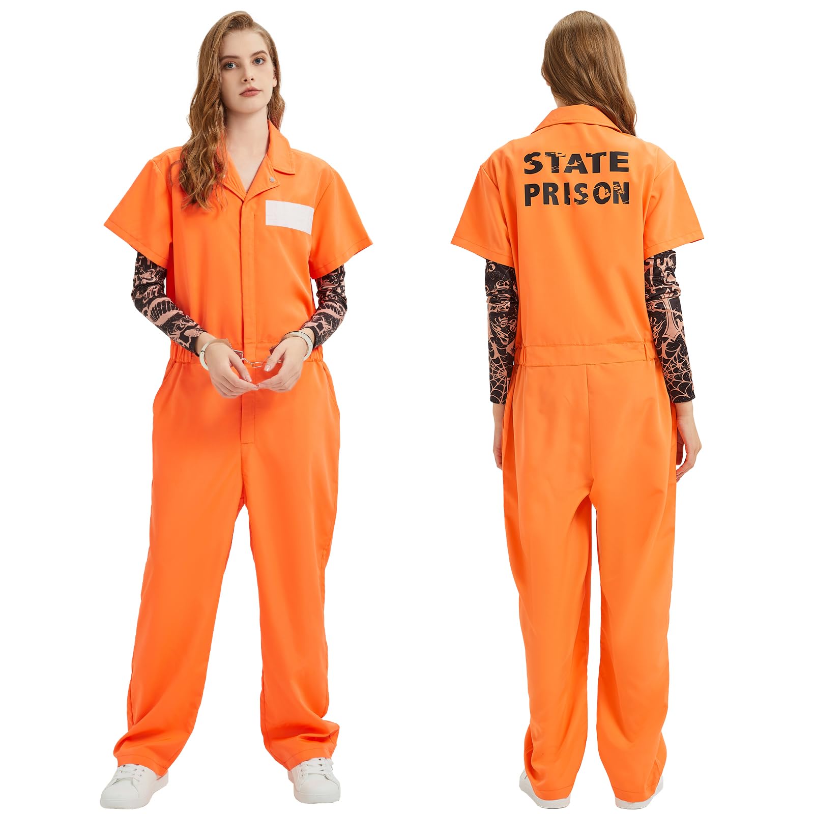 Prisoner Jumpsuit Set Include:1*orange prison jumpsuit,2* tattoo arm sleeves,1*number stickers,1*nameplates.Perfectly recreate the prison style of prisoners.Tattoo Sleeves are excellent accessories for daily life,parties,halloween,night outings,sports,bars,stage performances, etc.