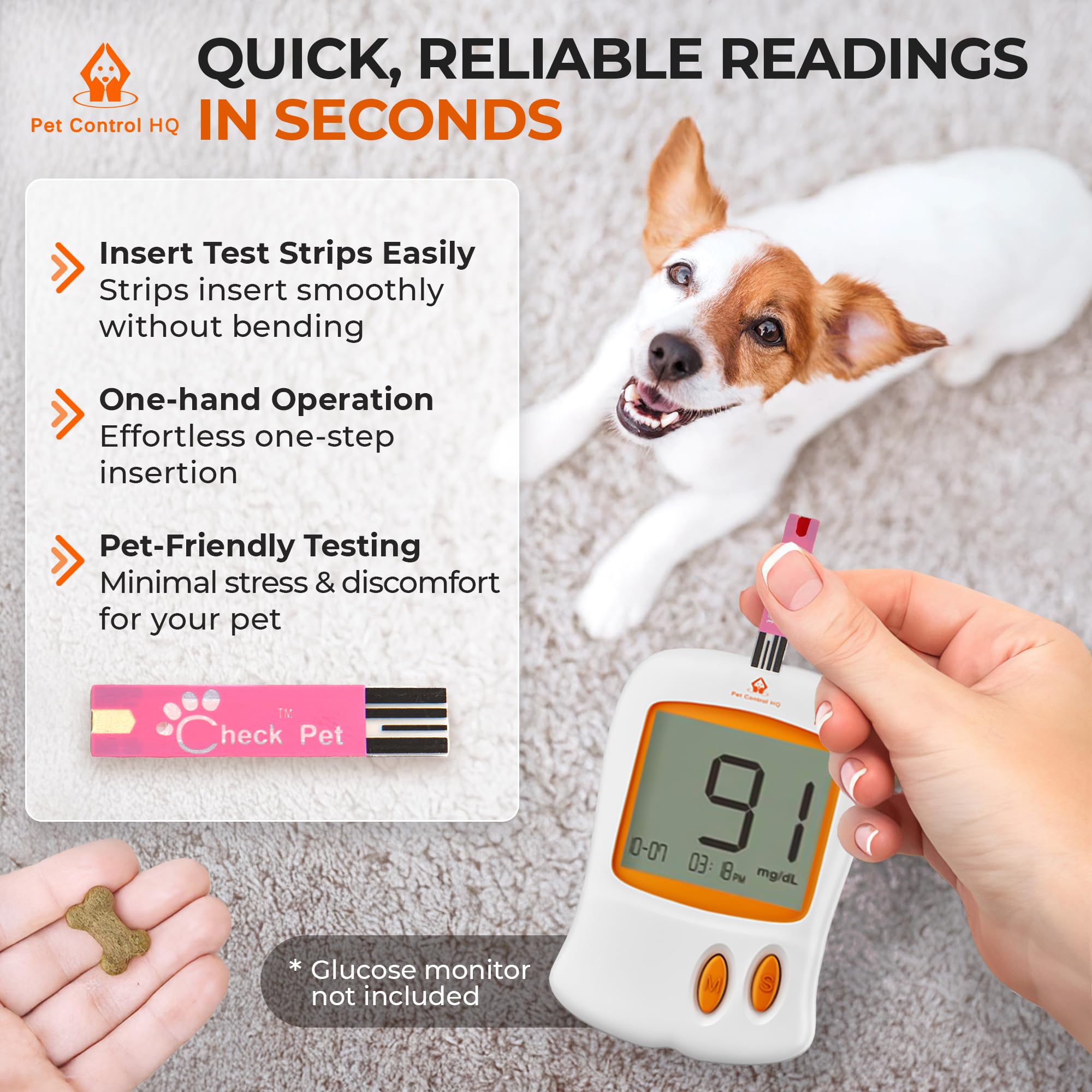 Pet-friendly glucose test strips: Blood glucose testing is hard on your furry friend (and you), which is why Pet Control HQ’s pet test strips for diabetes are designed to give you lab-accurate results with the least amount of blood of any brand available; Use the diabetic test strips in your Pet Control HQ 2 Code-Chip Glucose Monitor for testing that’s easy on pets who are not fans of being poked - in fact, many say their animals never even squirm or wiggle