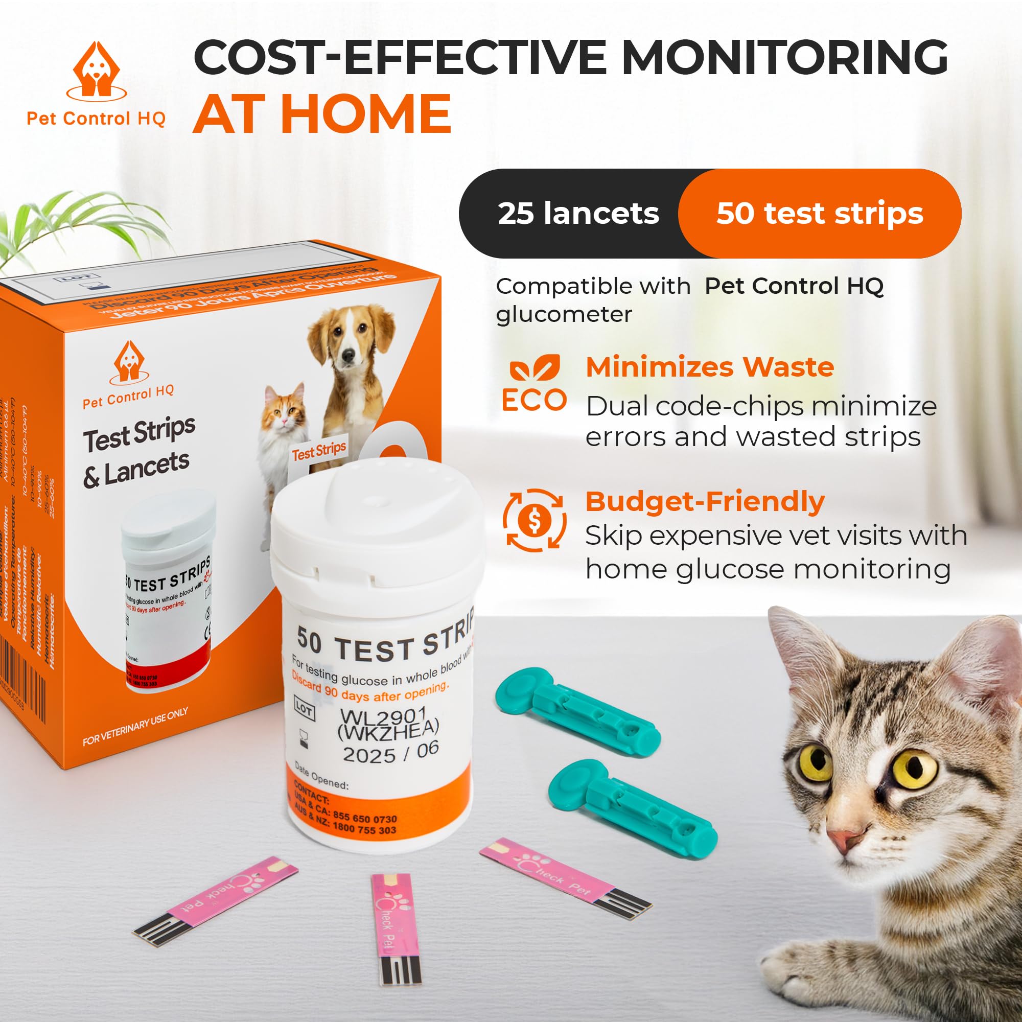 Save money with bundled strips & lancets: The team at Pet Control HQ understands that buying glucometer strips can add up (especially with bad readings from low-quality strips) which is why we’re proud to be the only company offering U.S.A. bundles of our lab-accurate test strips (50) and lancets (25) designed specifically for the Pet Control HQ glucose monitor for Dogs & Cats - now you’ll never have to risk your loved one’s health just to save money
