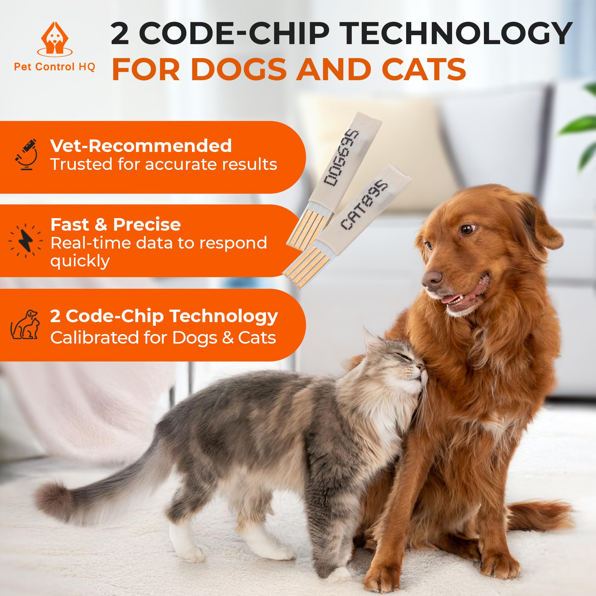 Two code-chip technology for dogs & cats: Insulin levels differ in cats and dogs. That’s why your cat and dog blood sugar test kit uses our unique 2-code-chip glucose test strips (one chip calibrated for your K9, the other for your kitty). Pet Control HQ dog and cat glucose test strips with 2 Code-Chips give Pet Parents confidence to take care of their diabetic pooches and kittens - providing fast results and accurate blood glucose levels