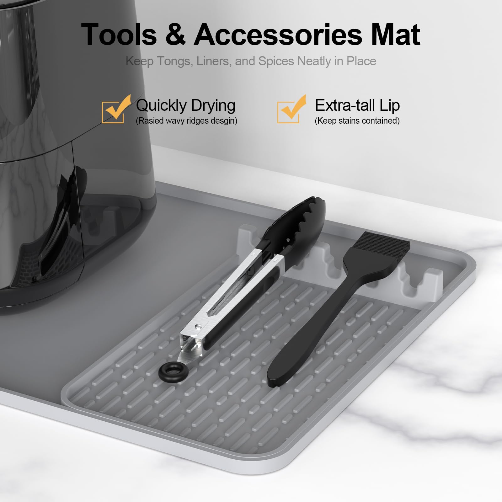 Discover the perfect blend of protection, organization, and minimalist design with Garolue's premium silicone heat-resistant mat set. Specially crafted for modern kitchens, this modular two-piece set includes a spacious 24x16" silicone base mat and a detachable tool holder—offering both heat protection and functional storage in one elegant solution. At the heart of our design is versatility. The large mat fits seamlessly under air fryers, microwaves, toasters, and ovens, shielding your countertops from burns, scratches, and heat marks. Meanwhile, the smaller silicone pad keeps everyday tools like oil brushes, tongs, and spatulas neatly organized—reducing clutter and enhancing your workflow. Designed with universal compatibility in mind, our heat-resistant silicone mat works with leading brands such as Ninja, Cosori, Chefman, Toshiba, and more. The non-slip, non-stick surface is also ideal for coffee makers, juicers, mixers, and other countertop appliances, making it a must-have for any cooking station. Every detail is engineered for convenience. The raised edge design helps trap spills and drips, while the smooth, waterproof surface cleans effortlessly—just wipe or rinse. And withstanding temperatures up to 450°F, this silicone countertop mat offers durable, long-lasting protection in even the busiest kitchens. As part of Garolue’s silicone-based home essentials line, this mat reflects our commitment to functional design, durability, and ease of use.Whether you're protecting surfaces or organizing your space, this two-in-one solution brings order, safety, and style to your kitchen.