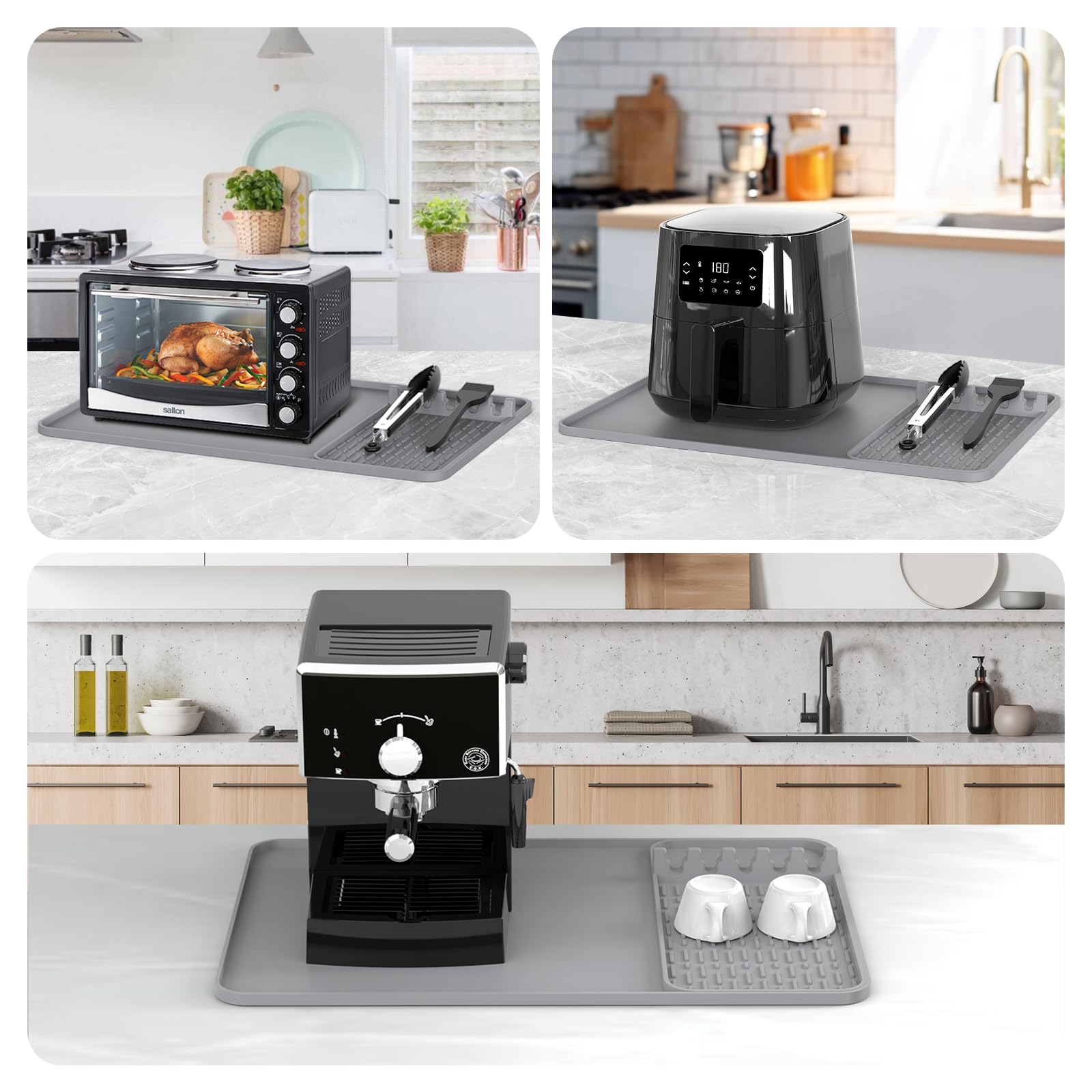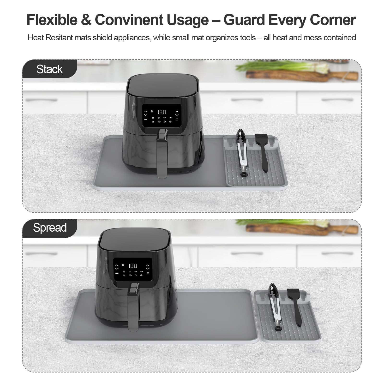 Modular Two-Part Design – Countertop Protection & Tool Storage: This heat resistant mat includes a large 24x16" base mat for placing air fryers, microwaves, or ovens, providing full countertop protection against heat and scratches. A smaller detachable silicone hot proof pad is built for holding utensils like tongs, oil brushes, or other kitchen tools. Use both mats together for complete protection, or separately to suit your layout.A must-have for heat safety and efficient kitchen organization.