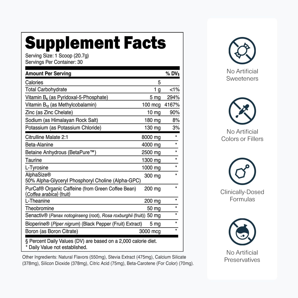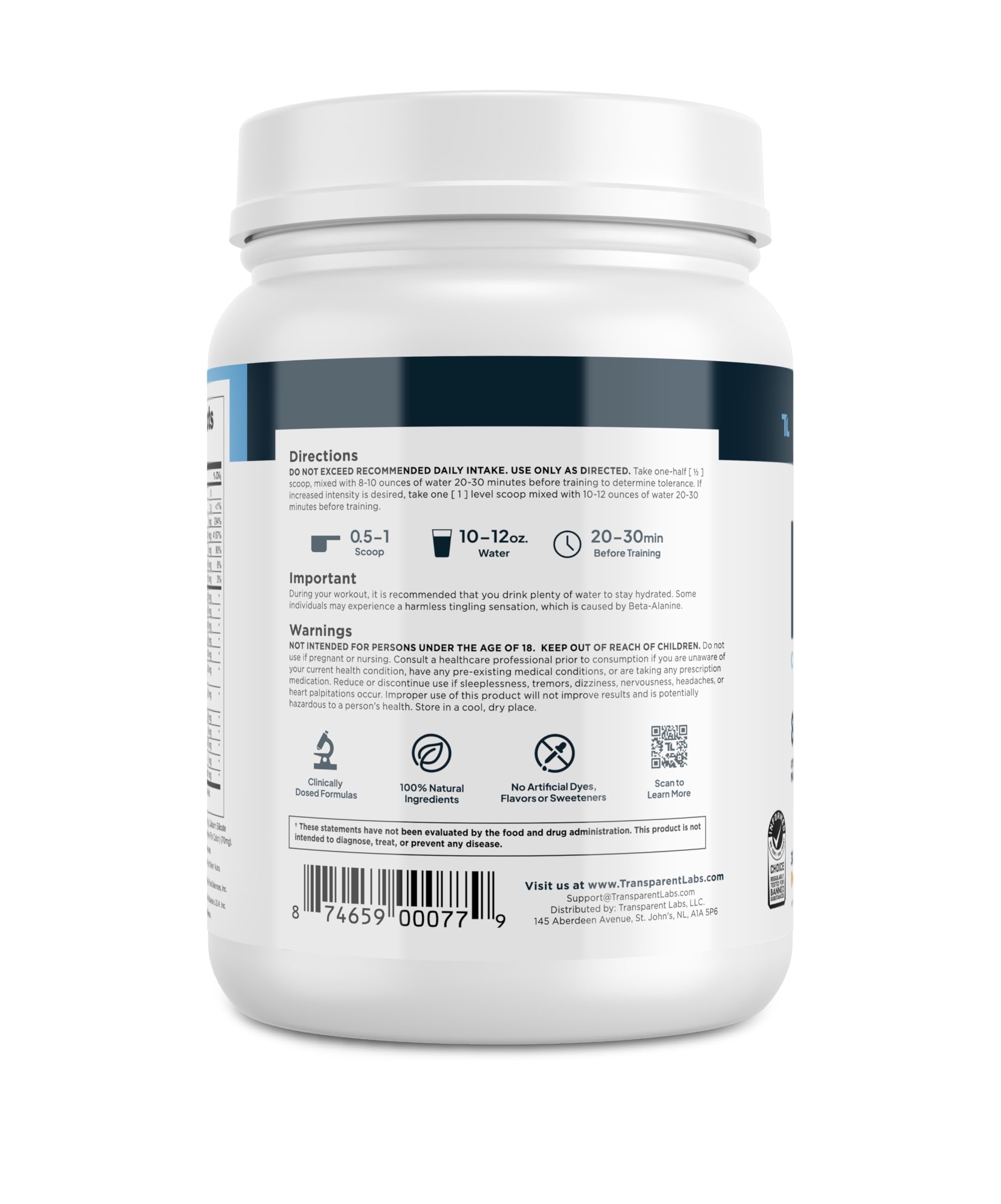 Science-Backed Formula: Transparent Labs Bulk Pre-workout is distinguished by its extensive, evidence-based formula that includes key ingredients such as Citrulline Malate, Beta-Alanine, Betaine Anhydrous, Taurine, L-Tyrosine, AlphaSize Alpha-GPC, and more. This carefully crafted blend is designed to provide a holistic boost to your workout performance, ensuring you have the necessary tools to push your limits and achieve your fitness goals.