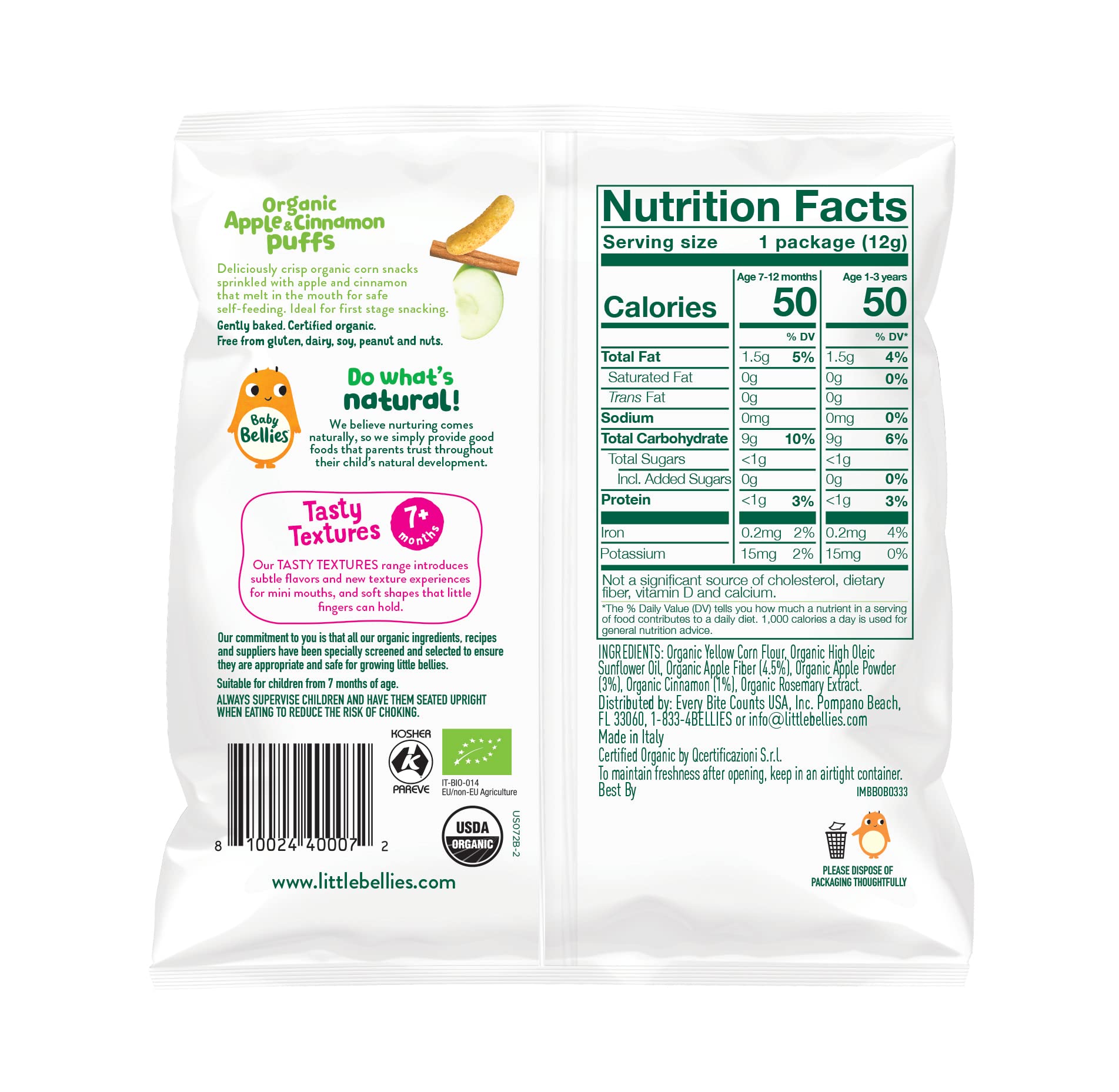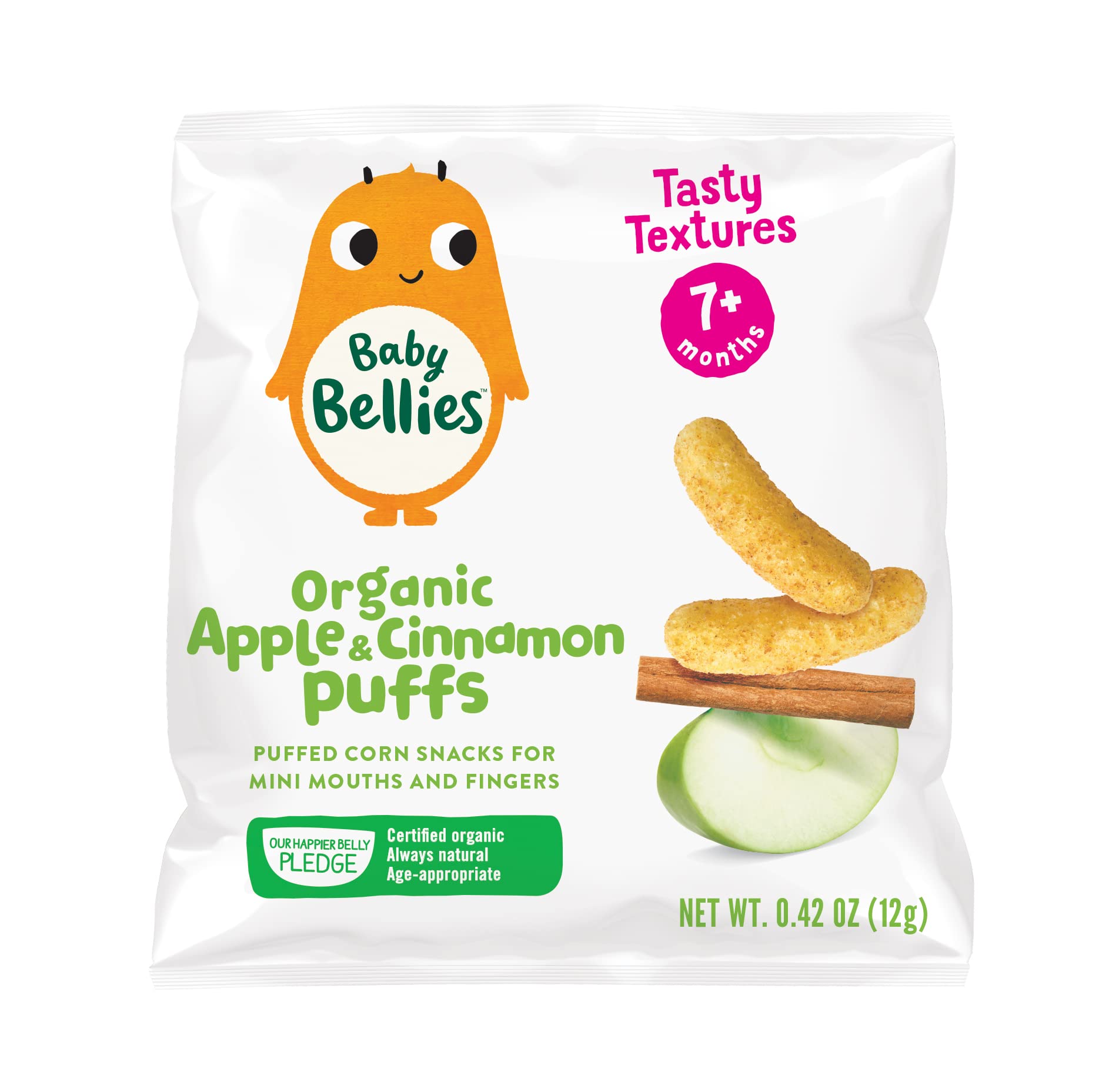 Organic Apple and Cinnamon Puff Snacks: These organic soft puffed corn snacks are sprinkled with apple and cinnamon, they melt easily in the mouth to encourage safe self-feeding; Suitable for children from 7 months of age