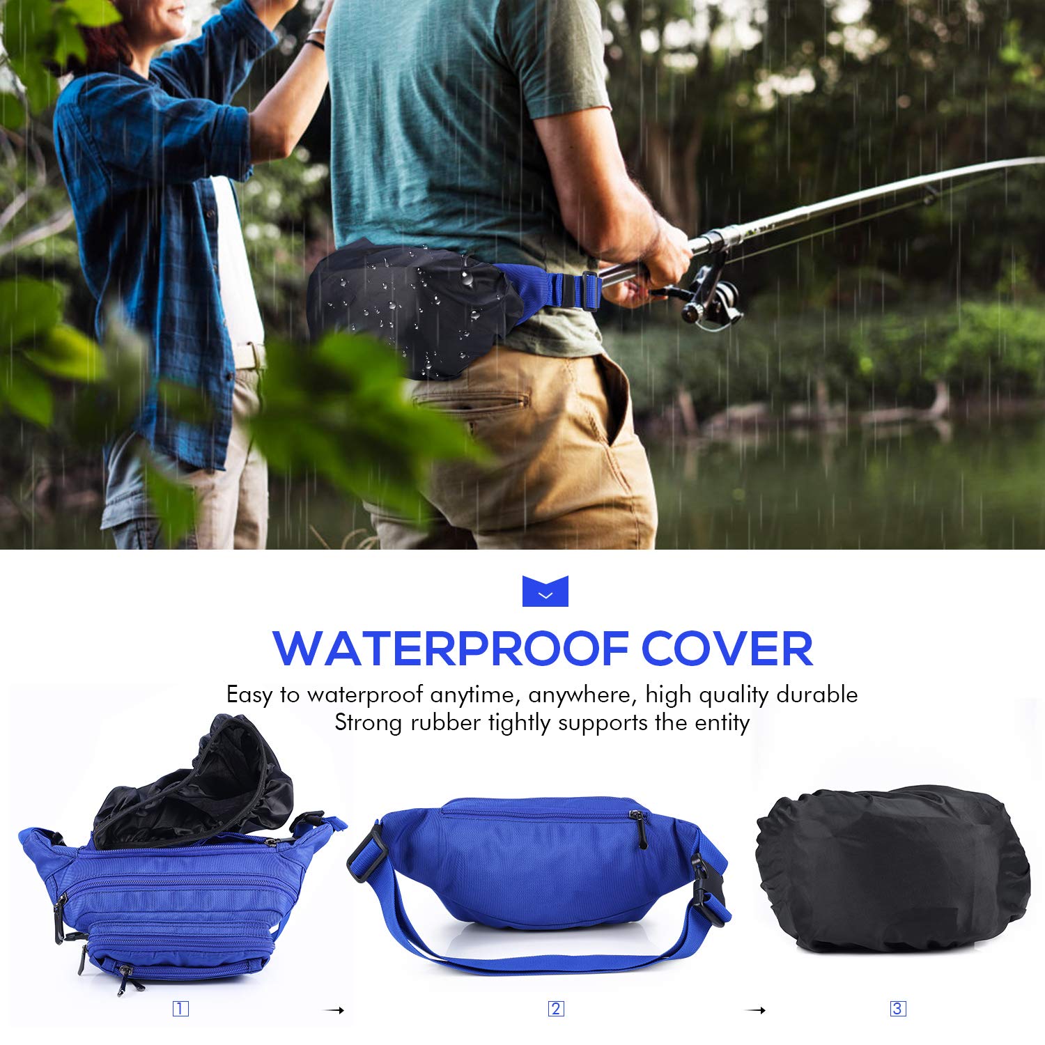 【6 MULTI-POCKET DESIGN】Our fanny packs for women & men will keep your hands & pockets free! 5 zipper pockets of different sizes and a hidden zipper pocket design, hidden zip perfect give your valuables extra security, all your needs. The largest pocket can easily accommodate a standard water bottle. A zippered exterior pocket located behind the waist band with Rain Cover it can better protect important items in rainy days.