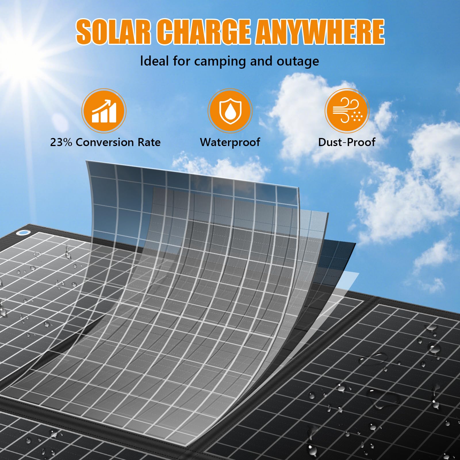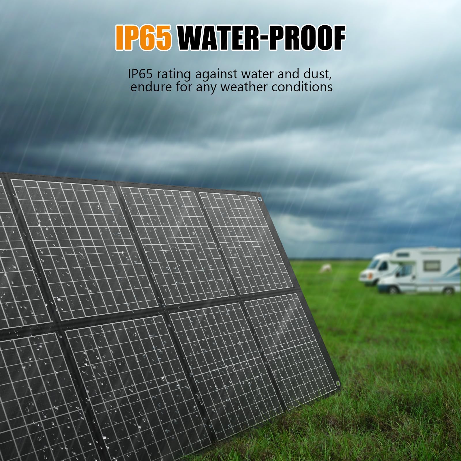 ✅DURABLE AND WATERPROOF: This Portable Solar Panel Uses Advanced Integrated Laminating Technology, High-Quality Etfe Material, Uv-Resistant Eva, And High-Efficiency Solar Cells. Our Solar Panles Has Ip65 Dustproof And Waterproof Functions.However, The Control Box Is Not Waterproof,In Order To Prolong The Lifespan Of 100watt Solar Panel, Please Don'T Soak It Into Water.