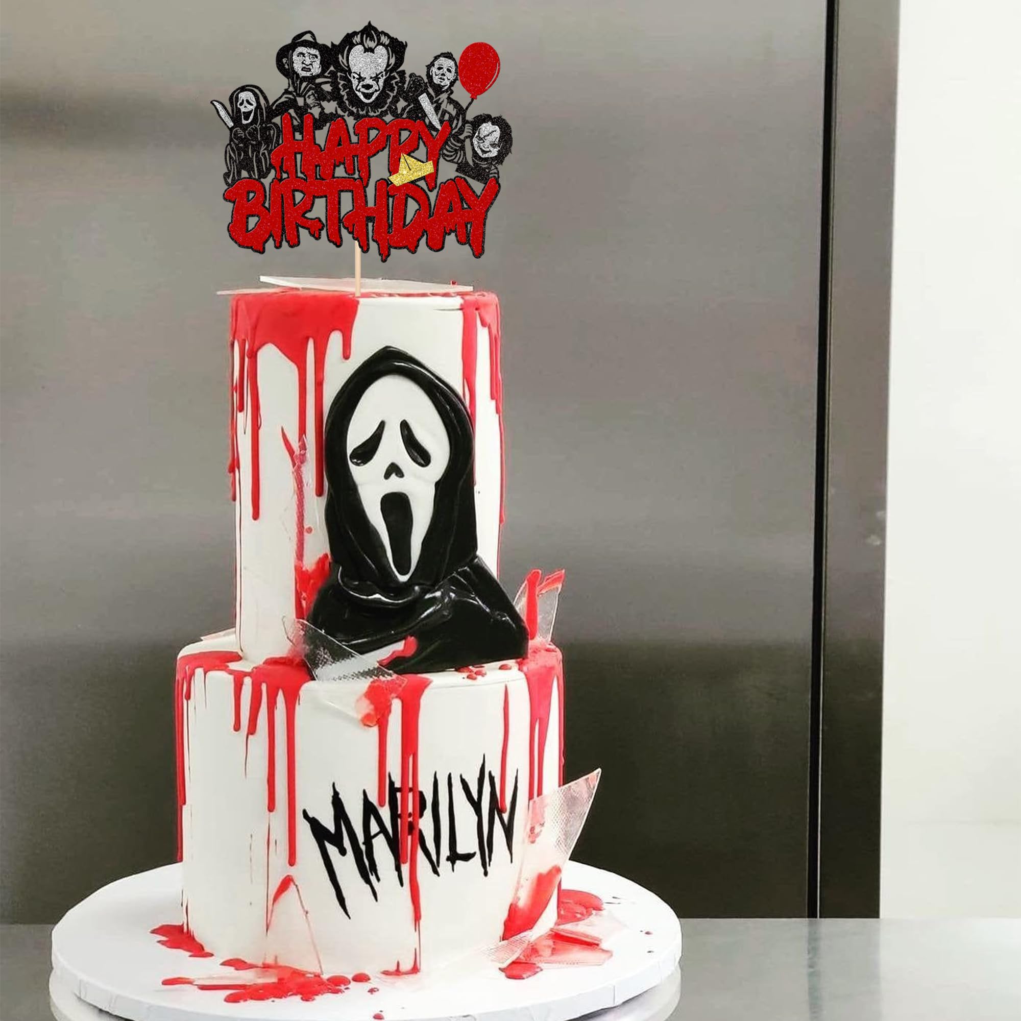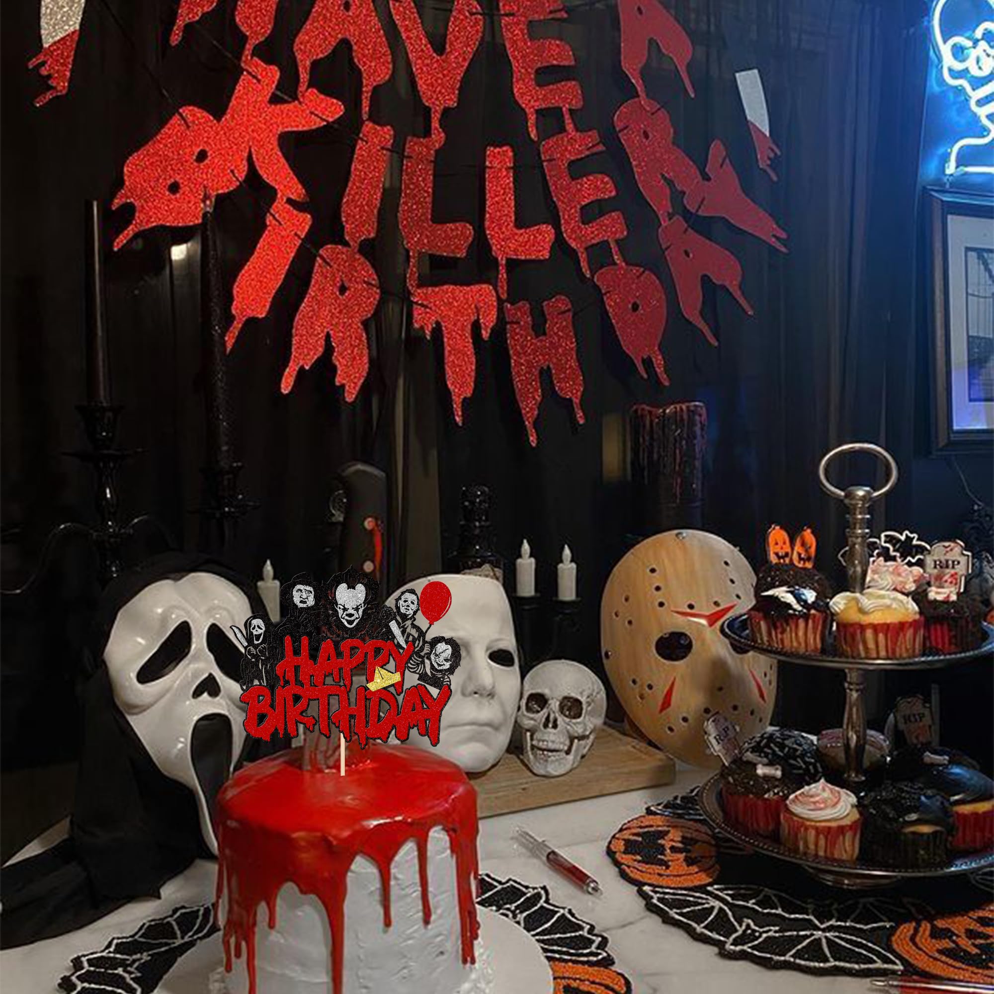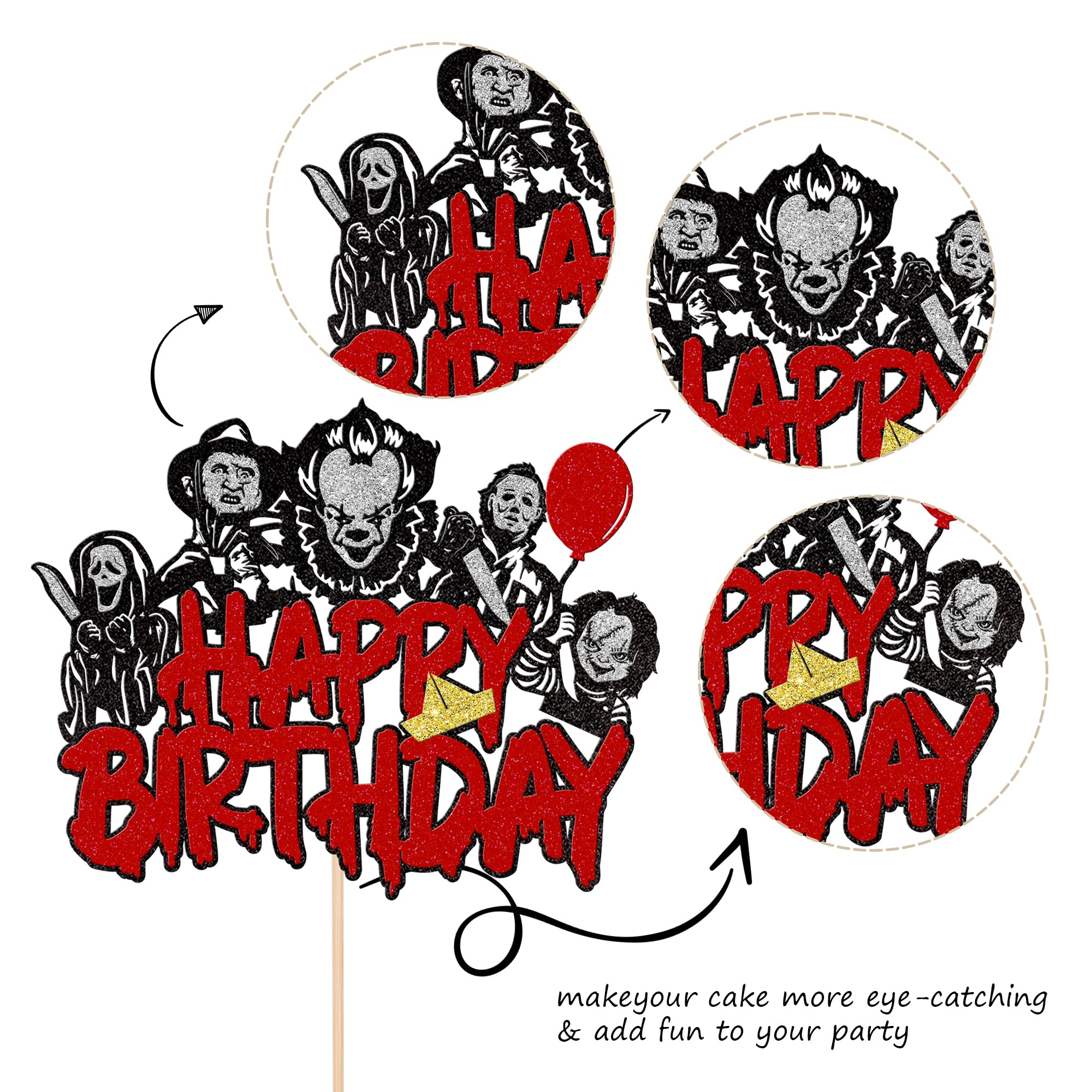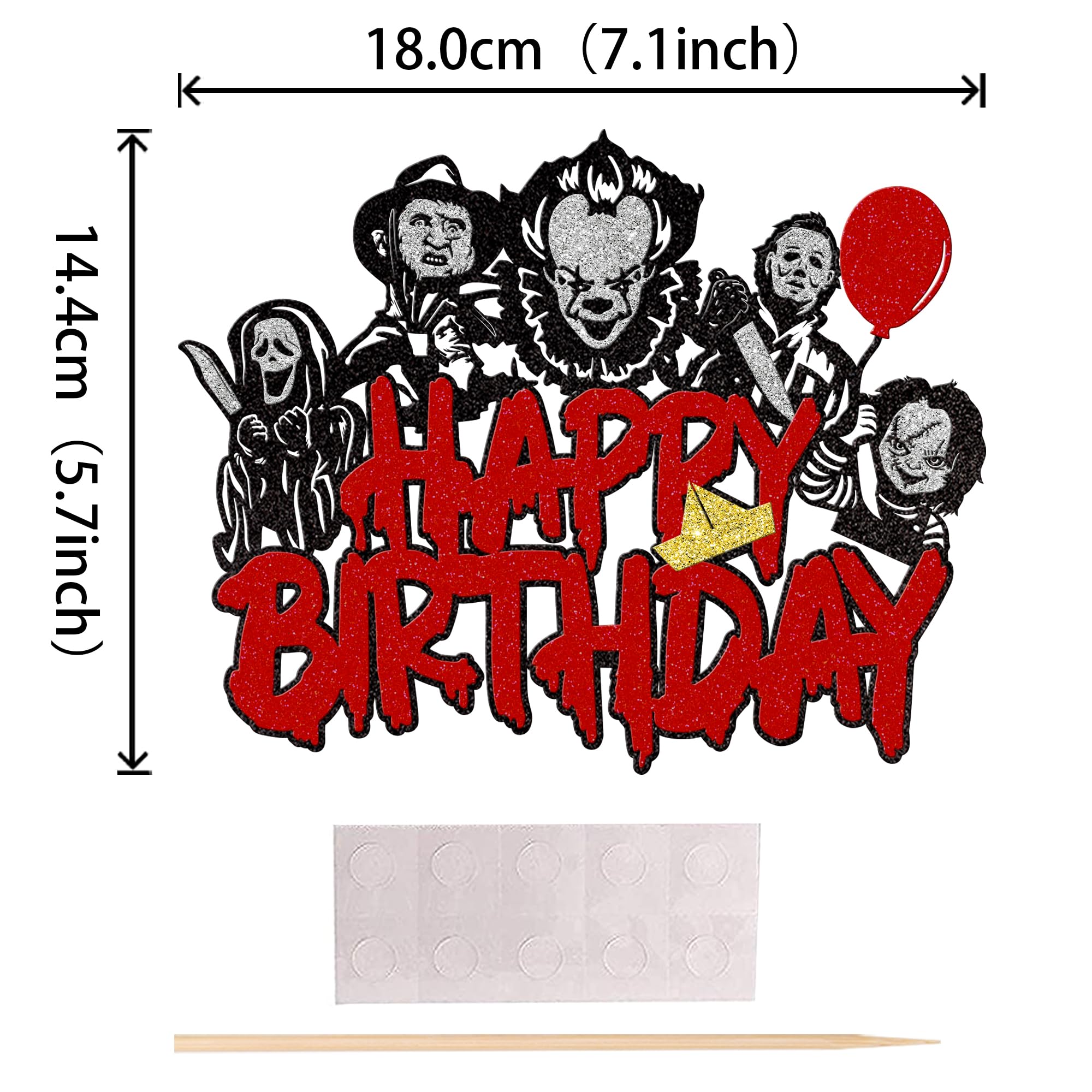 Horror Classic Have a Killer Themed Happy Birthday Cake Topper for Horror Movie Theme Kids Men Women Birthday Halloween Party Cake Decorations Supplies perfect for horror calssic movie theme birthday party, have a killer themed birthday theme party, halloween theme party cake decorations supplies. Pack of 1 pcs. The size is W 7.1 inch * H 5.7 inch / W 18 cm * H 14.4 cm ( without stick ) Made of high quality paper card stock and food grade sticks,thick and sturdy. This cake topper is one side glitter, another side is white, and this is intended for decoration only, please do not put them in oven or microwave. If the item you received has any defects, please contact us for refund.we will deal with it within 24 hours.