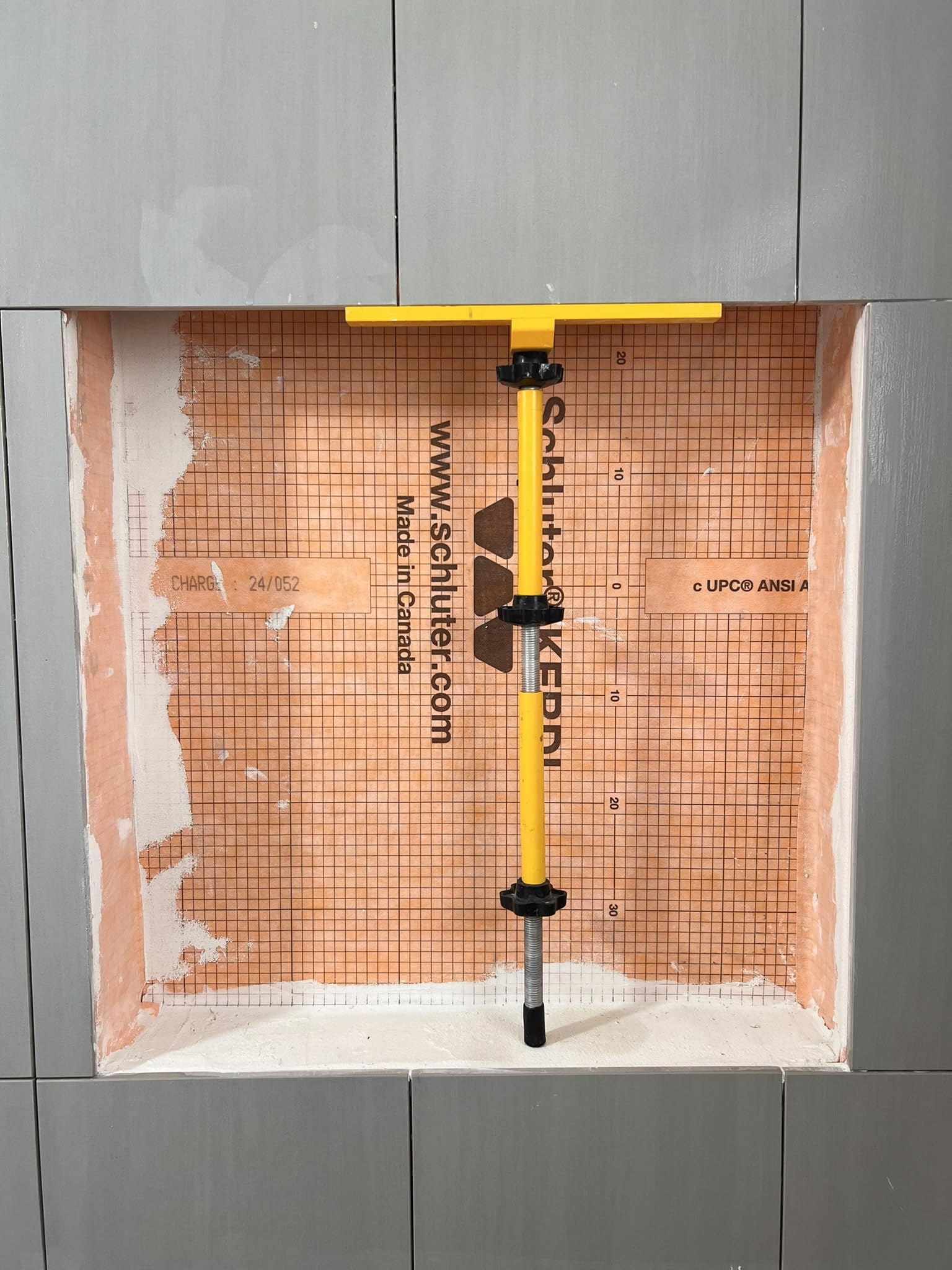 【ADJUSTABLE & EXPANDABLE DESIGN】 The fixture plate opens to 3 ½ inches, fitting most niche depths while allowing height adjustment of the 11-inch holding plate for precise tile placement. For wider niches, windows, doors, or medicine cabinets, pair multiple kits for seamless installation. The improved model now allows attaching multiple extended legs for even higher surfaces, making it the ultimate solution for larger jobs!