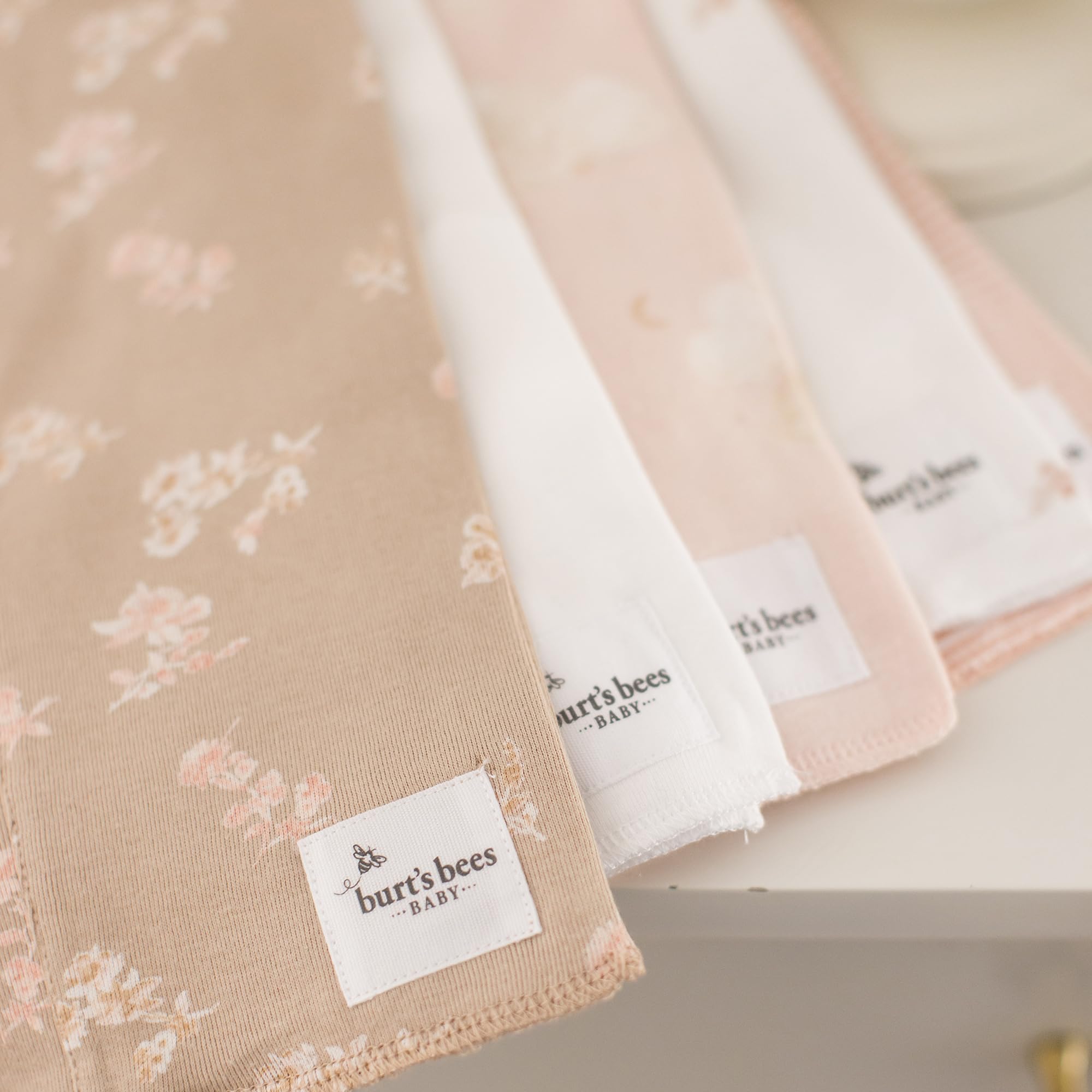 The Burt's Bees Baby Infant Burp Cloths are crafted from 100% organic cotton to offer an exceptionally soft touch for your baby's delicate skin. As a new parent, you will find this set of burp cloths to be indispensable for your baby. This 5-pack of burp cloths boasts maximum absorbency, efficiently soaking up spills and dribbles to keep you and your baby dry and comfortable during feedings. The generously sized cloth means you have ample protection for your shoulder or lap. The organic cotton burp cloths feature a convenient tri-fold design that gives you three layers of protection when you need it the most. Not only are these burp cloths functional and the perfect accessory for everyday baby care, but they also feature adorable prints. Their versatile designs fit seamlessly into any nursery theme, making them an excellent gift for any parent or parent-to-be. The easy-care organic burp cloths are machine washable and grow softer with each wash, ensuring long-term usability. Whether you are searching for baby girl burp cloths, baby boy burp cloths or gender-neutral burp cloths, our versatile burb cloths for babies are designed to meet the dynamic needs of parenting. Certified by CU 831717, 2024 and manufactured according to GOTS standards.