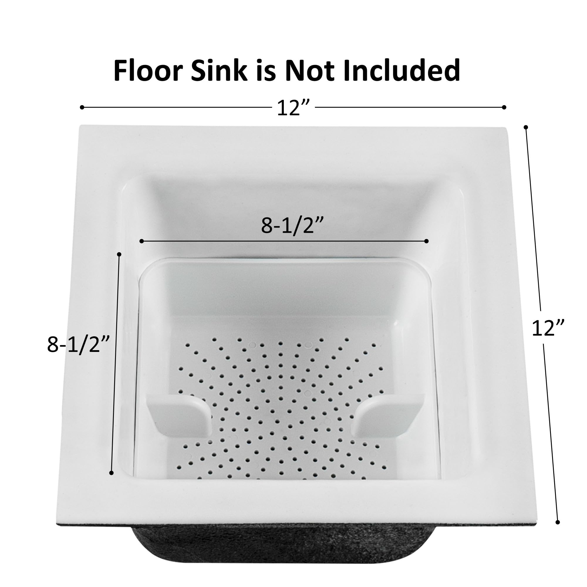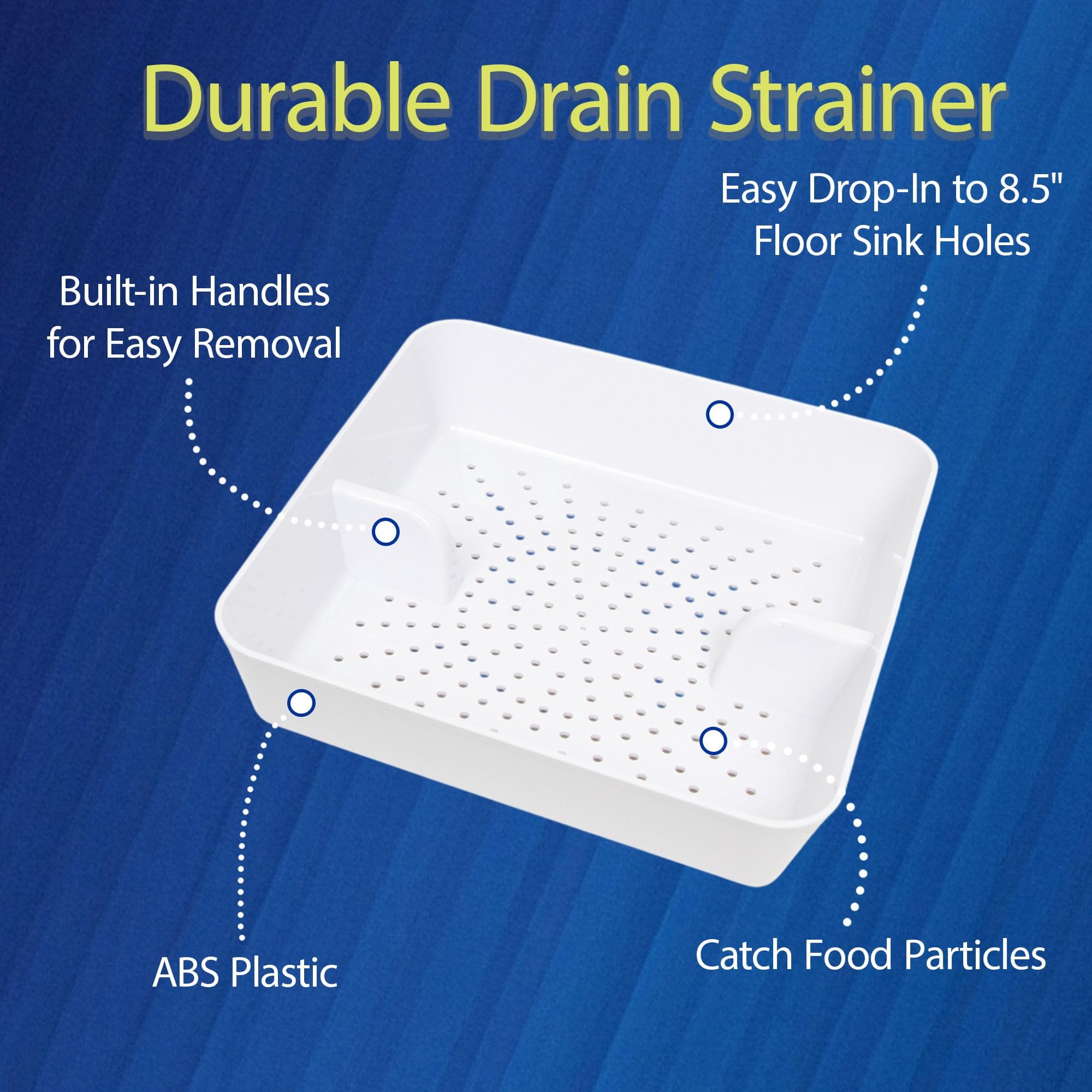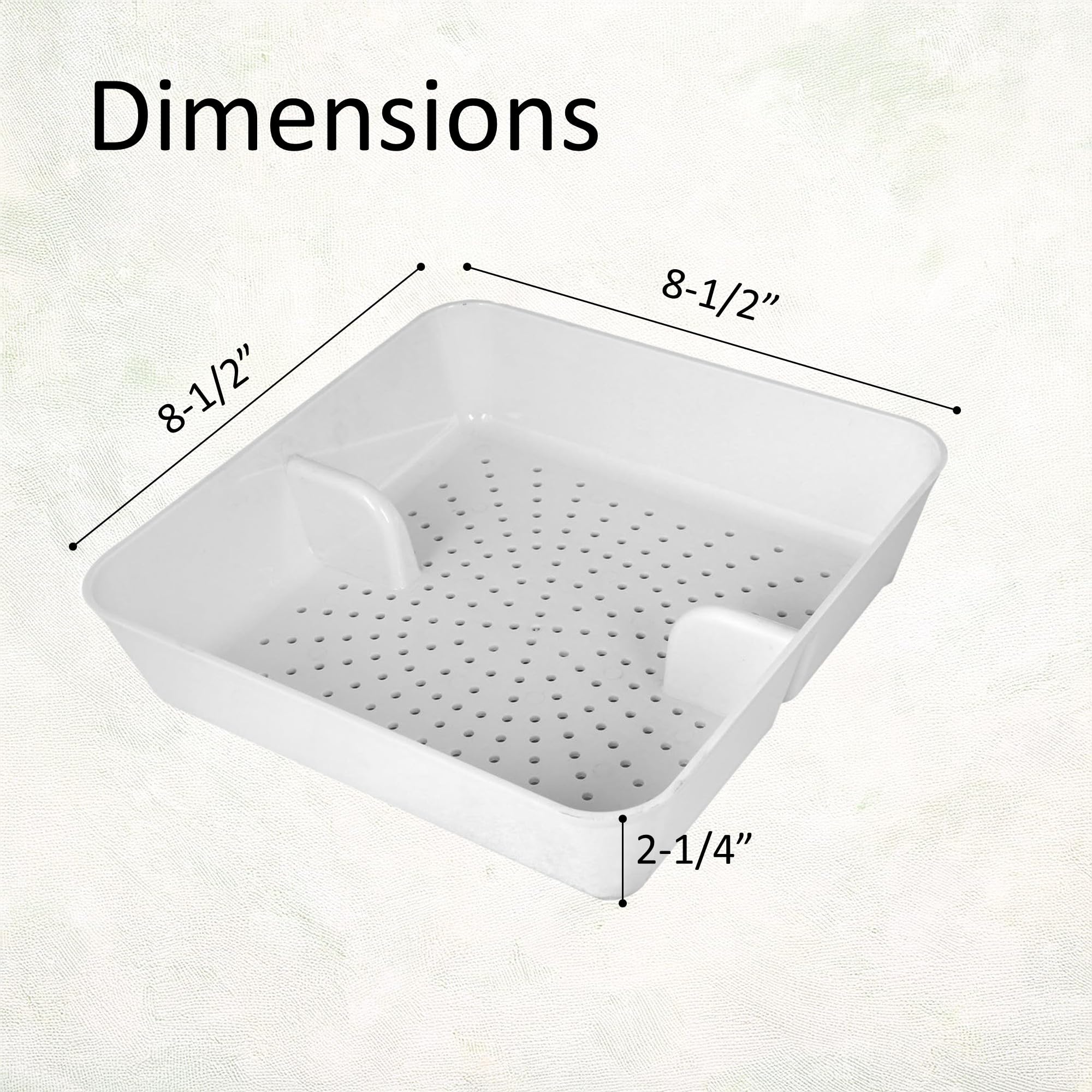 [Easily Removable]- Notches on the side of the strainer make the device easily removable. Overall Dimensions: 8-½” W x 8-½” L x 2-¼” H.