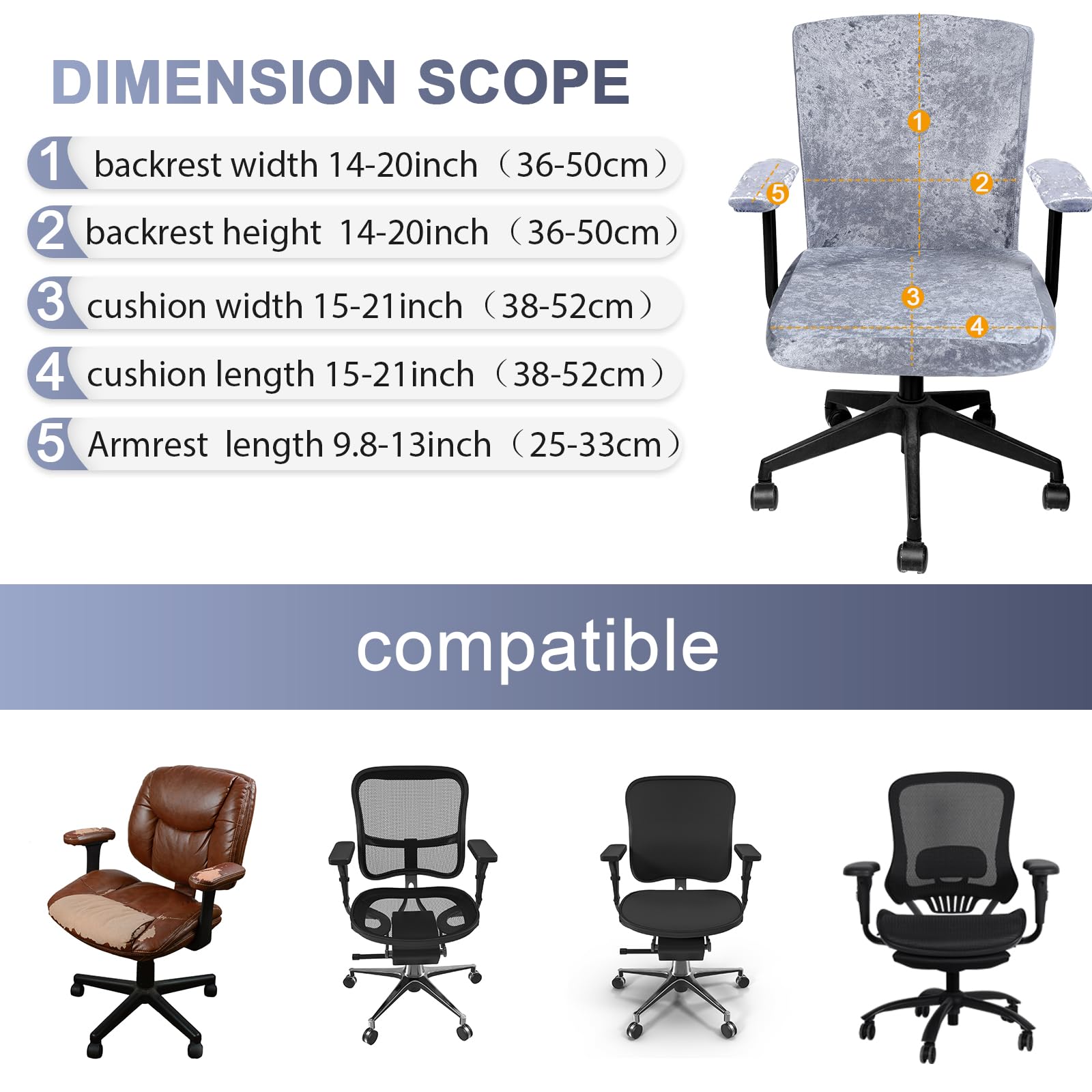 Size Information: this office chair seat cover is about 38 cm/ 14.96 inches to 48 cm/ 18.9 inches wide, and the length of it is also about 38 cm/ 14.96 inches to 48 cm/ 18.9 inches; And office chair back cover is about 38 cm/ 14.96 inches to 46 cm/ 18.11 inches wide, about 38 cm/ 14.96 inches to 48 cm/ 18.9 inches high; Please carefully check the detailed size information in the shown pictures, and also measure your seat before purchase
