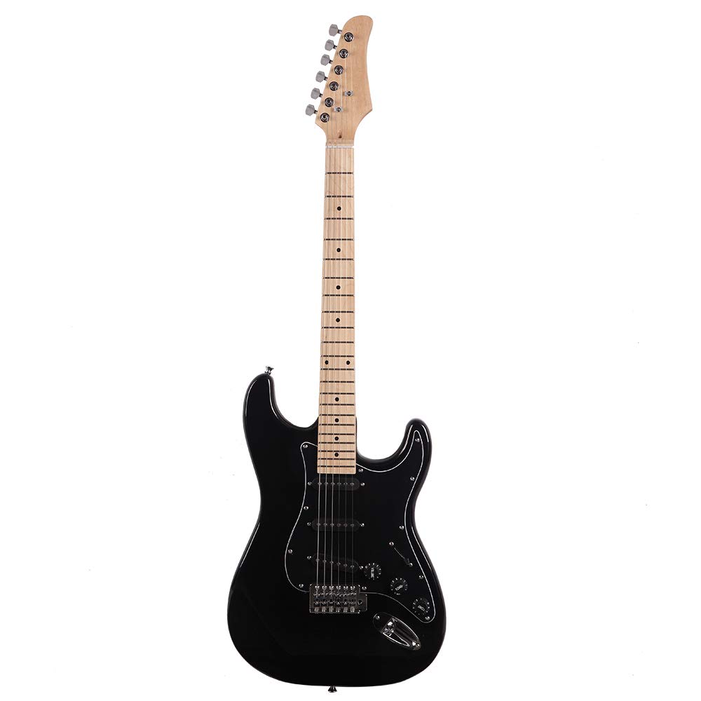 Specifications: 1. Style: Electric Guitar 2. Face Material: Basswood 3. Back Material: Basswood 4. Side Panel Material: Basswood 5. Neck Material: Maple 6. Fingerboard Material: Maple 7. Tuning Peg Material: Metal 8. Nut Material: Plastic 9. Bridge Material: Plastic 10. String Winder Peg Tool: Enclosed Machine Head 11. Guitar Color: Black 12. Number of Frets: 22 13. Guitar Dimensions: (39.37 x 12.99 x 2.36)" / (100 x 33 x 6)cm (L x W x H) 14. Guitar Weight: 106.89oz / 3030g 15. Amplifier Dimensioins: (9.84 x 9.84 x 4.33)" / (25 x 25 x 11)cm (L x W x H) 16. Amplifier Weight: 82.89oz / 2350g 17. Nut Width: 1.656 in. (42 mm) 18. Scale Length: 25.5" 19. Orientation: Right Handed 20. Number of Strings: 6 21. Speaker Power: 20W Package Includes: 1 x Guitar 1 x Guitar Bag 1 x Strap 1 x Guitar Amplifier 1 x Power Wire 1 x Tool 1 x Plectrum 1 x Tremolo Bar
