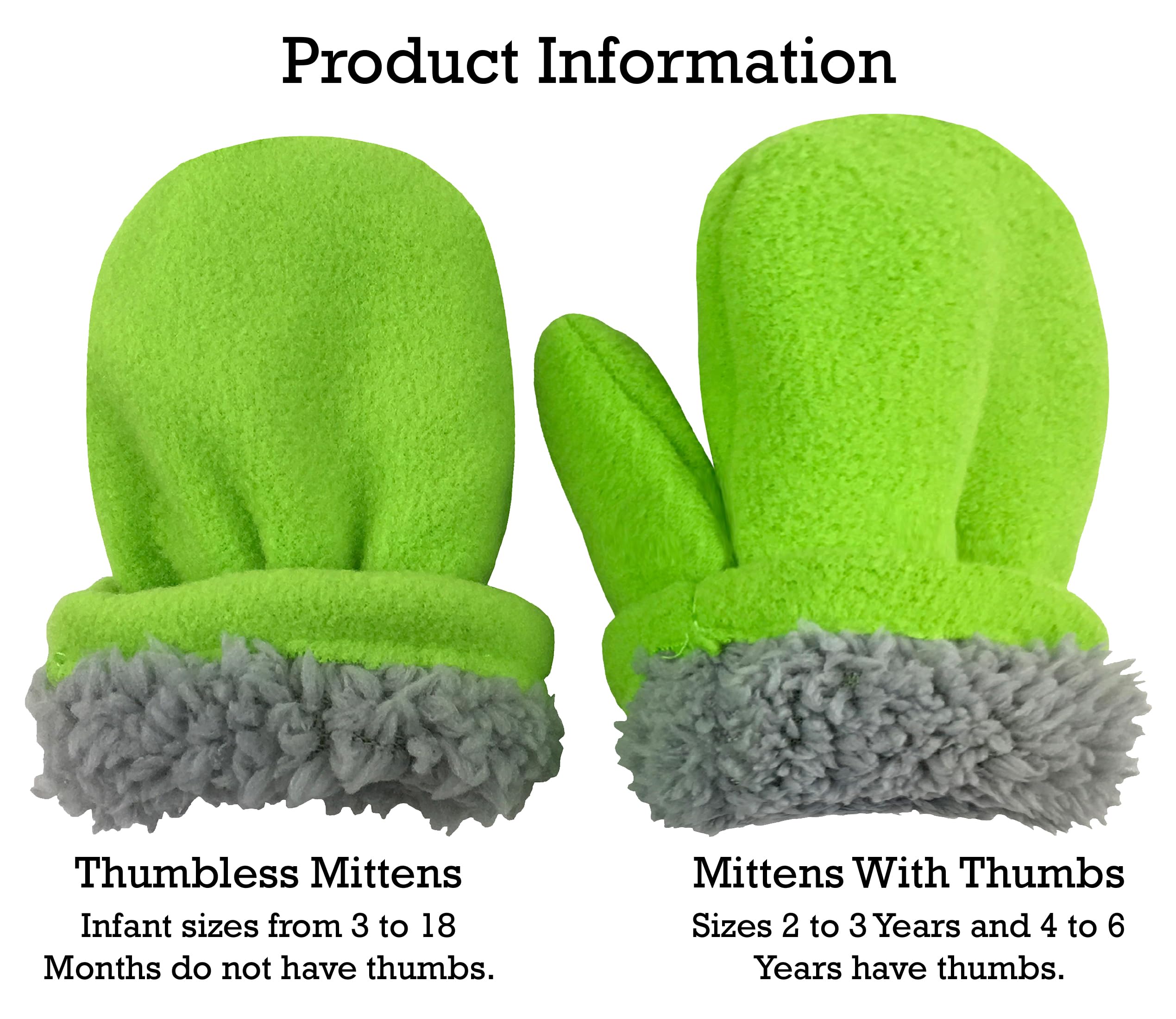 BOYS, GIRLS AND INFANT SIZING INFORMATION: The fingerless winter mittens are available in 4 little kids, toddler and baby sizes. For the smaller infant sizes of 3-6 months and 6-18 months, the mittens do not have thumbs (they are thumbless). For the larger toddler and child sizes of 2-3 years and 4-6 years, the mittens have thumbs.