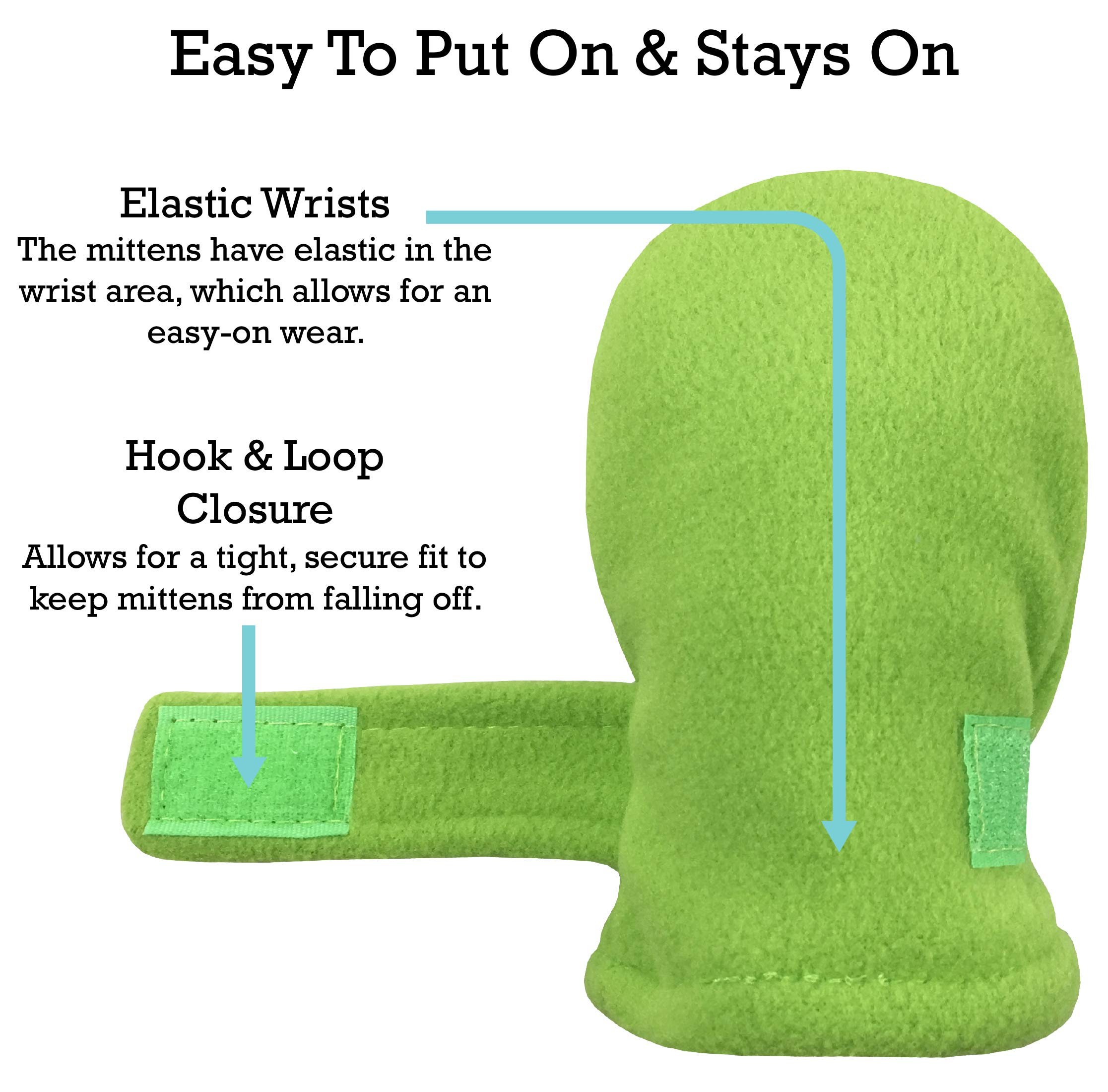 BABY & TODDLER GLOVES THAT ARE EASY TO PUT ON: The infant and toddler mittens are designed with elastic in the wrist area, which widens and allows for an easy-on fit on your childrenβs hands. The hook and loop closure allows for a tight, secure fit to keep the mittens from falling off baby and little kidβs hands. These are great for first-time mitten wearers and active little kids who love running around outdoors in the cold weather!
