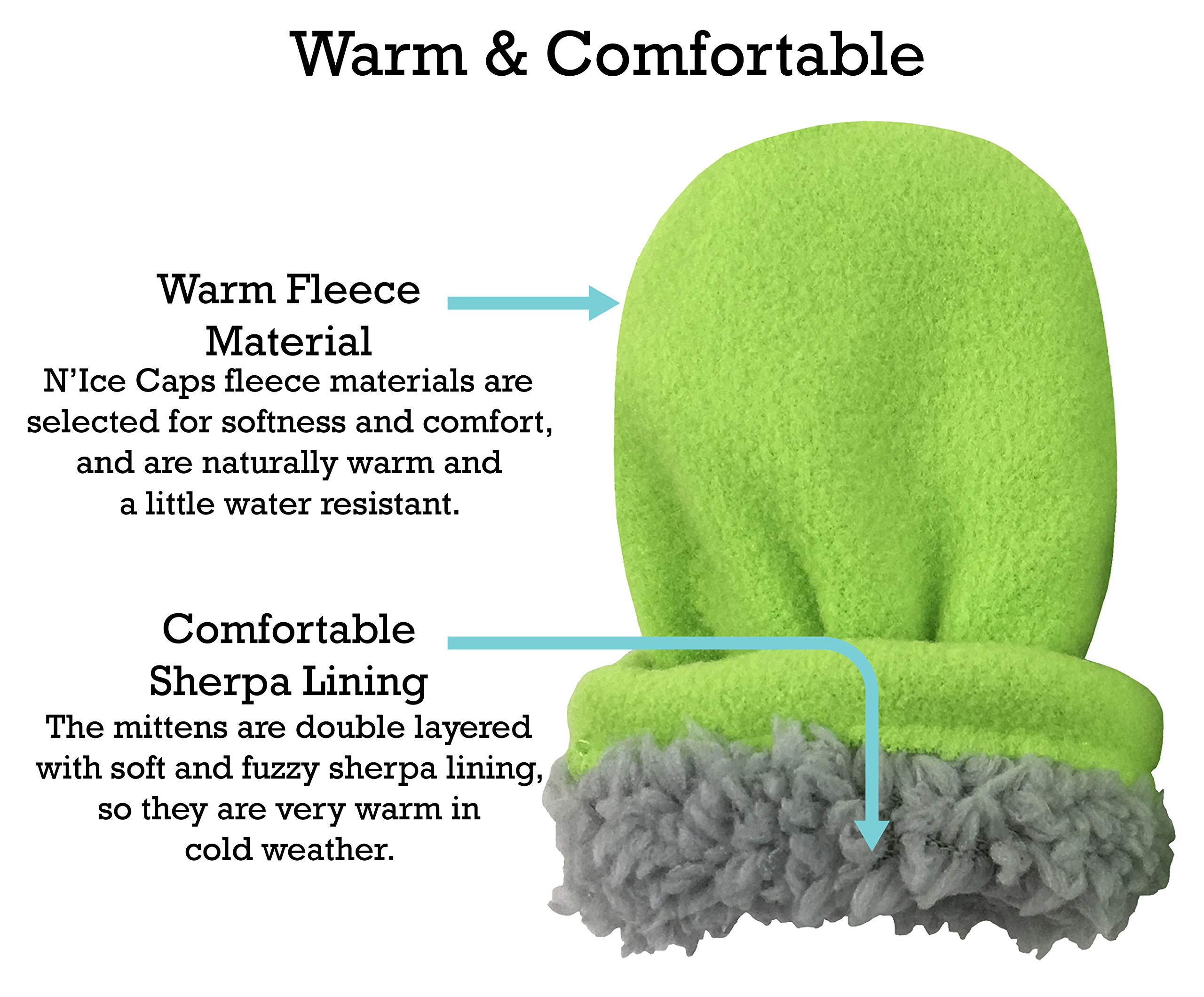 WARM AND COMFORTABLE SHERPA LINING: N'Ice Caps kids fleece materials are selected for softness and comfort and are naturally warm and a little water resistant. The mittens are all double layered with soft and fuzzy sherpa lining, so they are very warm in cold weather. These kidβs gloves are so soft and cozy, that even our fussy toddlers are happy to wear these fleece double layer mittens outdoors in the winter.