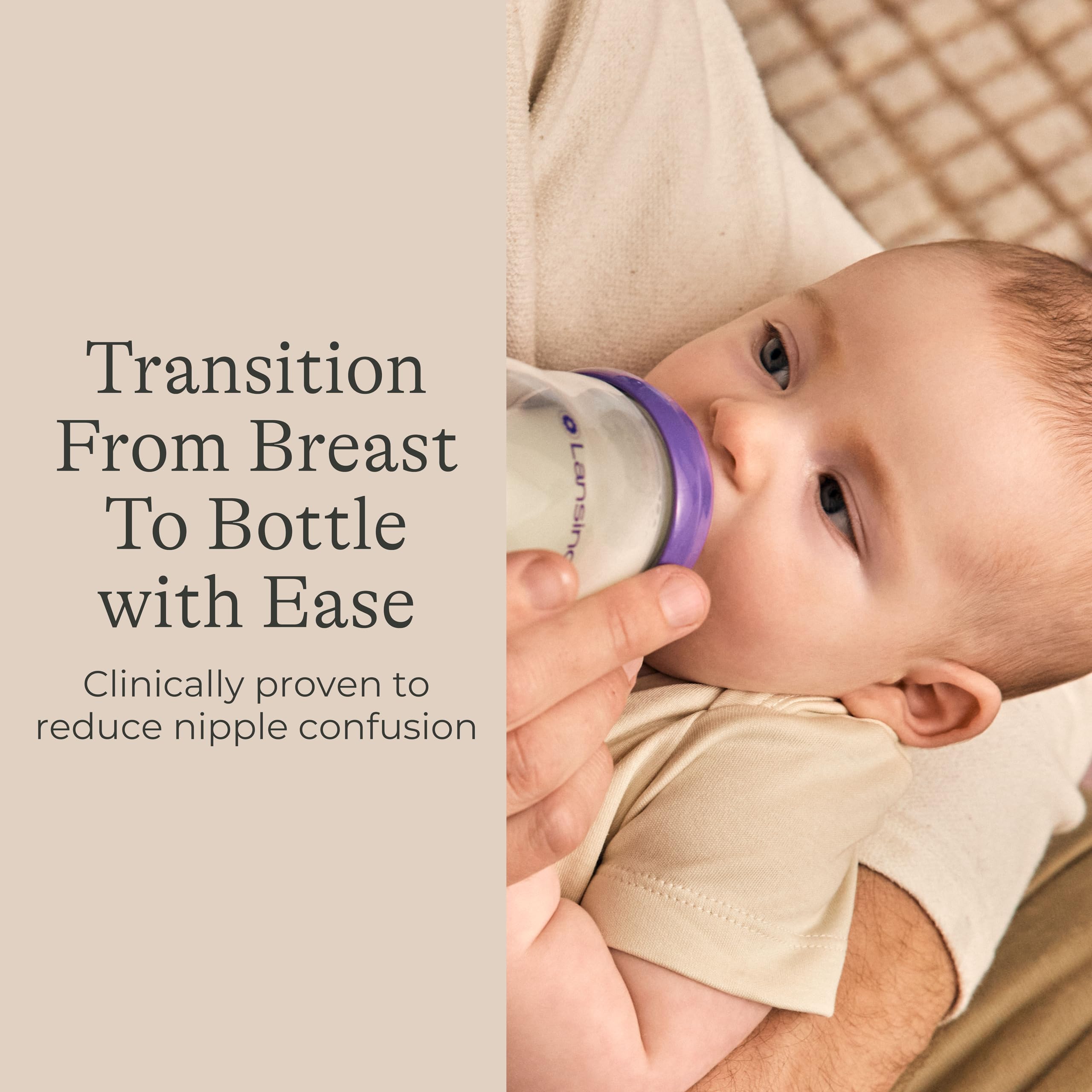 For every mom’s feeding journey – bottle feeding, breastfeeding, or both - Lansinoh's NaturalWave Feeding Bottles are designed for easy, comfortable feedings every time. Designed for faster flow, the 11-ounce size is just right for bigger appetites. Our ultra-soft and strong NaturalWave nipples feature a wide base and gradual slope that mold to your baby’s mouth, ensuring a secure latch that supports baby-led feeding. Clinically proven to reduce colic, our baby bottles have an advanced airflow system that minimizes air intake to help prevent gas, fussiness, and spit up for smoother, more harmonious feedings. Cleanup is a snap –– Lansinoh bottles are dishwasher-safe and have just three pieces (excluding cap) for easy cleaning and assembly, giving you more time to enjoy those special moments with your little one.