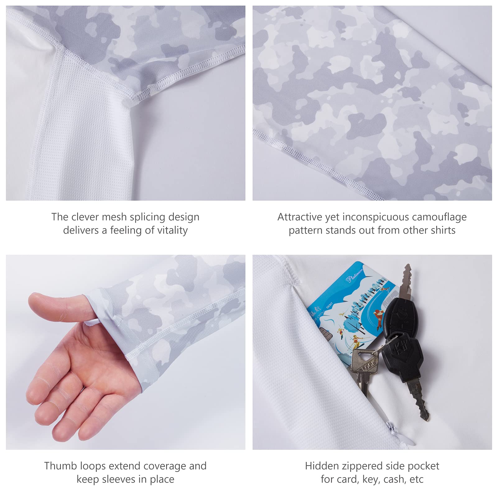 The streamlined hood provides greater sun protection over your neck and ears; The built-in thumbholes are designed to keep the sleeves in place; Hidden zippered side pocket for keeping your personal belongings like card, key, cash, etc
