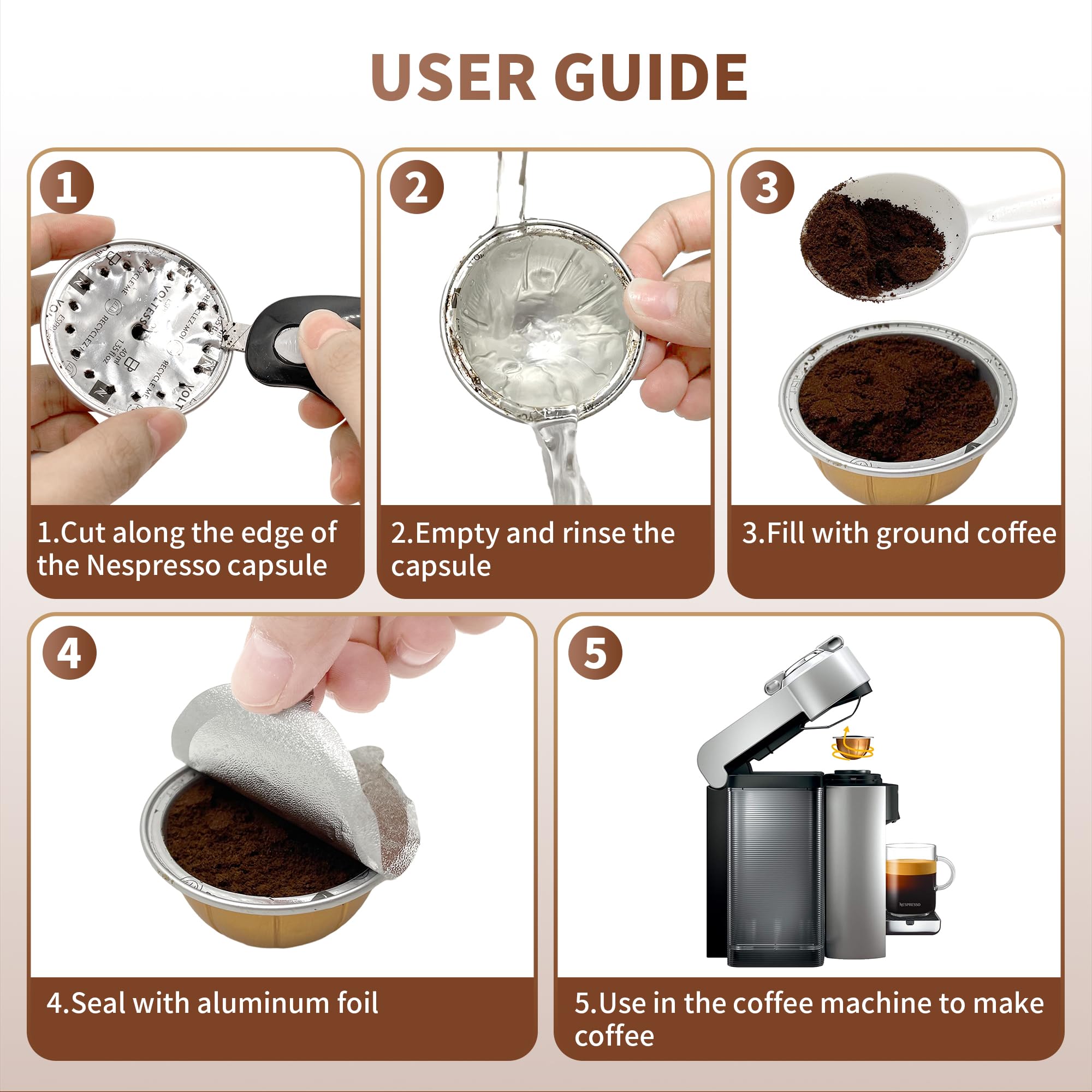 Easy to Use: Refilling your coffee pods with our reusable vertuo pods is quick. Simply add your preferred coffee, and use the foils to align along the edge of the capsule to create a new capsule.