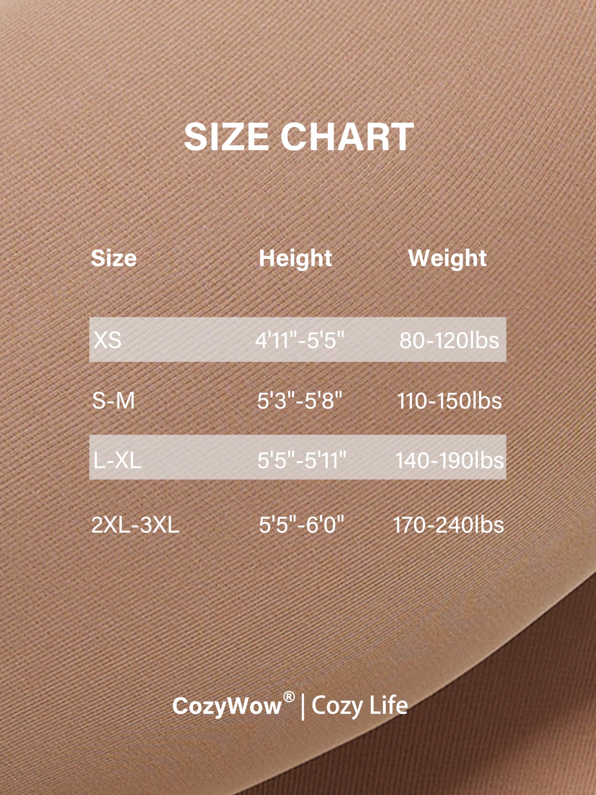 Size Recommended:XS: Height 4'11"-5'5" , Weight 80-120lbs. S-M: Height 5'3"-5'8", Weight 110-150lbs. L-XL: Height 5'5"-5'11", Weight 140-190lbs. 2XL-3XL: Height 5'5"-6', Weight 170-240lbs. Our stockings' design ensure elegance and comfort for every body type.