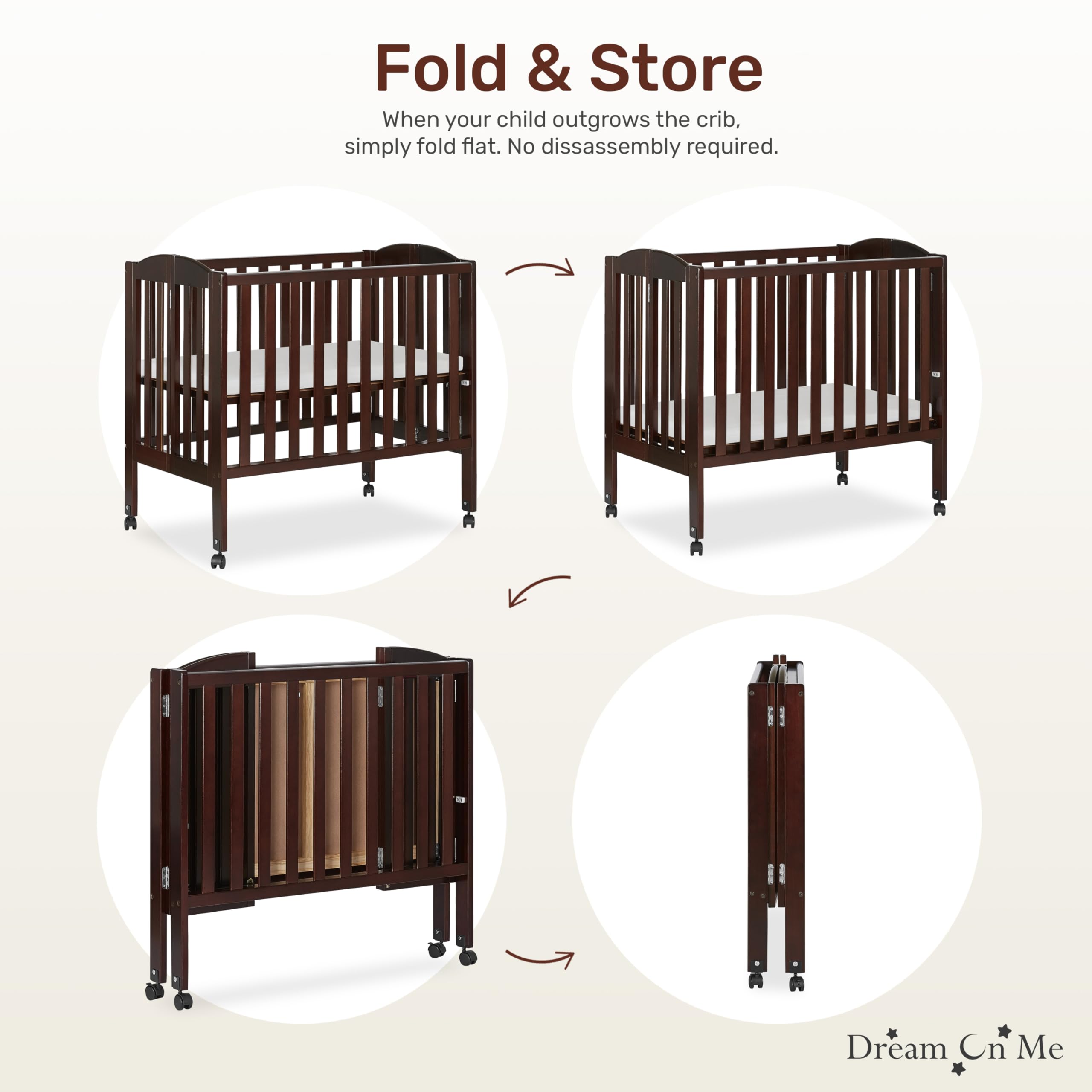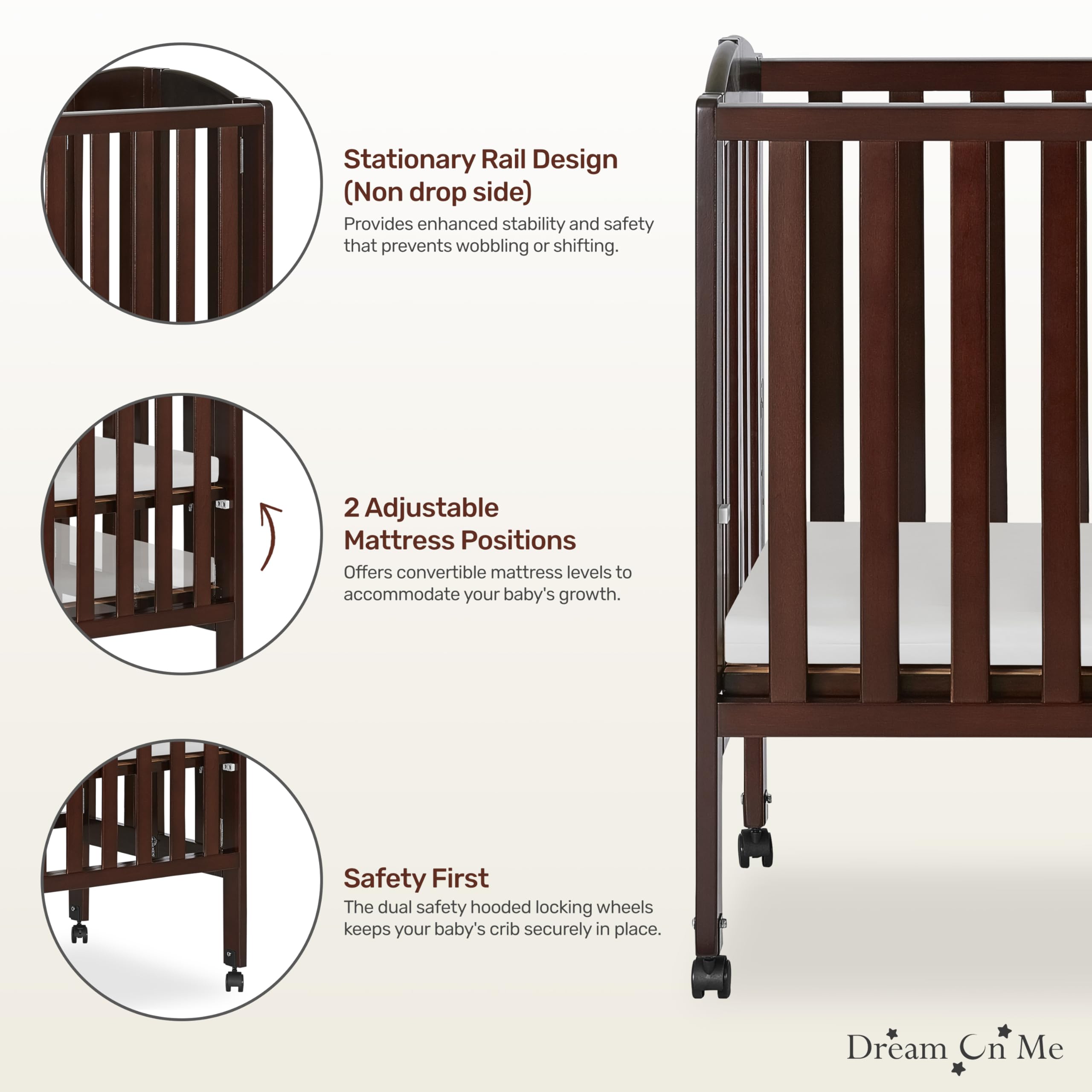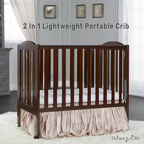 Product Description Sleek, compact, and thoughtfully designed, the Dream On Me 2-in-1 Portable Mini Crib brings modern style and practical convenience into any nursery or shared space. Its clean lines, smooth finish, and contemporary look ensure it blends seamlessly with a variety of décor styles, while its smaller footprint makes it the perfect choice for apartments, grandparents’ homes, or daycare centers. This versatile crib does more than just look good—it’s designed to adapt. The 2-in-1 functionality allows it to transition from a crib to a playpen, giving your little one a safe and reliable space to sleep or play. And when flexibility matters most, families can rely on our Patented Folding Mechanism (U.S. Patent #6817046 / #8479328 B2), which folds flat in seconds for stress-free storage and travel. Built from sustainable New Zealand pinewood, this mini crib combines natural strength with timeless appeal. It sits on **four smooth-rolling wheels—two locking and two non-locking—**so you can move it easily between rooms and lock it safely in place when needed. Parents can also feel confident knowing this crib is GREENGUARD Gold certified and meets ASTM and CPSC safety standards. It has been rigorously tested for over 10,000 chemical emissions and VOCs and finished with a non-toxic, lead- and phthalate-safe process—ensuring a healthy environment for your baby to sleep, play, and grow. Designed to grow with your child, the crib features two adjustable mattress height settings for newborn to infant stages. It also comes with a 1" compliant mattress pad, giving your little one a cozy and secure sleep space from the start. Measuring 40″ L × 26″ W × 38″ H, the crib offers comfort in a compact size, making it an ideal solution for smaller living spaces without sacrificing safety or convenience. The Dream On Me 2-in-1 Portable Mini Crib is where design meets practicality—beautifully styled, safety-certified, and crafted to give families portability, durability, and peace of mind. From the Manufacturer The Dream On Me, 2-in-1 portable folding crib, features a United States Patented rail system for ease in converting crib to playpen with one hand. The unique hinges allow the crib to fold flat for compact storage or travel. Included is the stationary (non drop side) rail design which provides the utmost in product safety. Made of solid Pine and having a beautiful Non-toxic finish, this portable crib is one of the most convenient portable cribs on the market. 1" Mattress pad and all tools for easy assembly included.