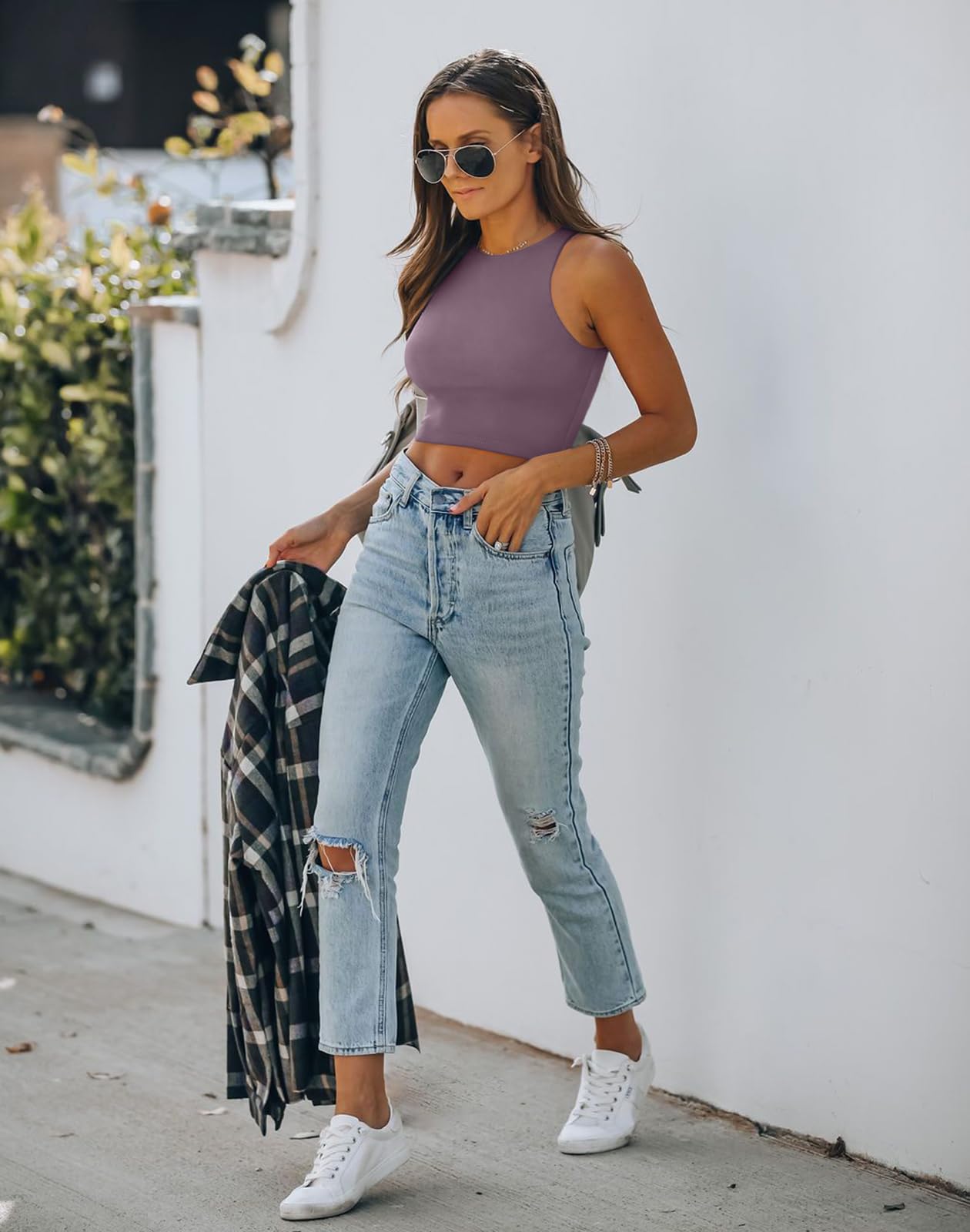 🌸This Trendy crop tank top is quite cute for teen girls and fashion women ladies, Features with high neck,halter neck,double line,racer back,cropped length,solid,tight slim fit,basic style which is bloggers favorite.