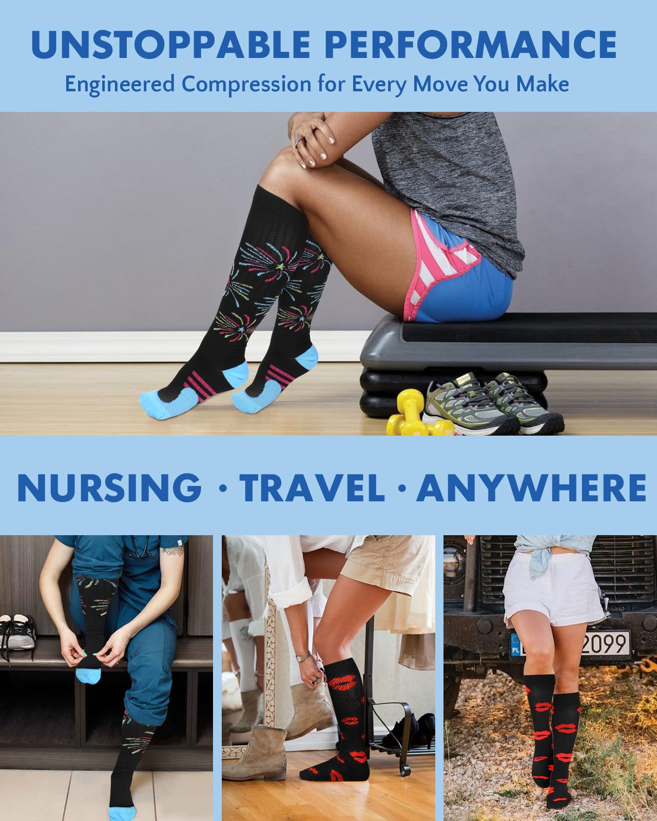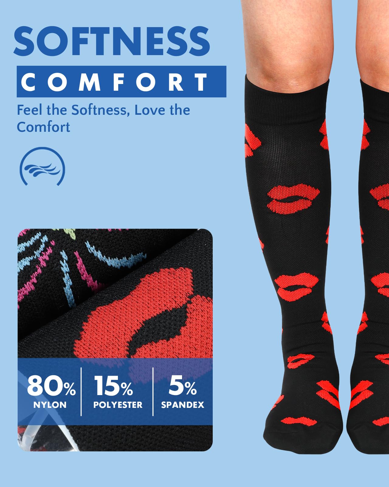 Size & Material: Crafted with premium polyester and rubber, these Black Red Lips Fireworks compression socks offer a fit and durable flat-bottom construction. Designed for women, with jacquard weave, they provide 15-20 mmHg compression for optimal support. Easy to care for machine wash & hand wash and built to last