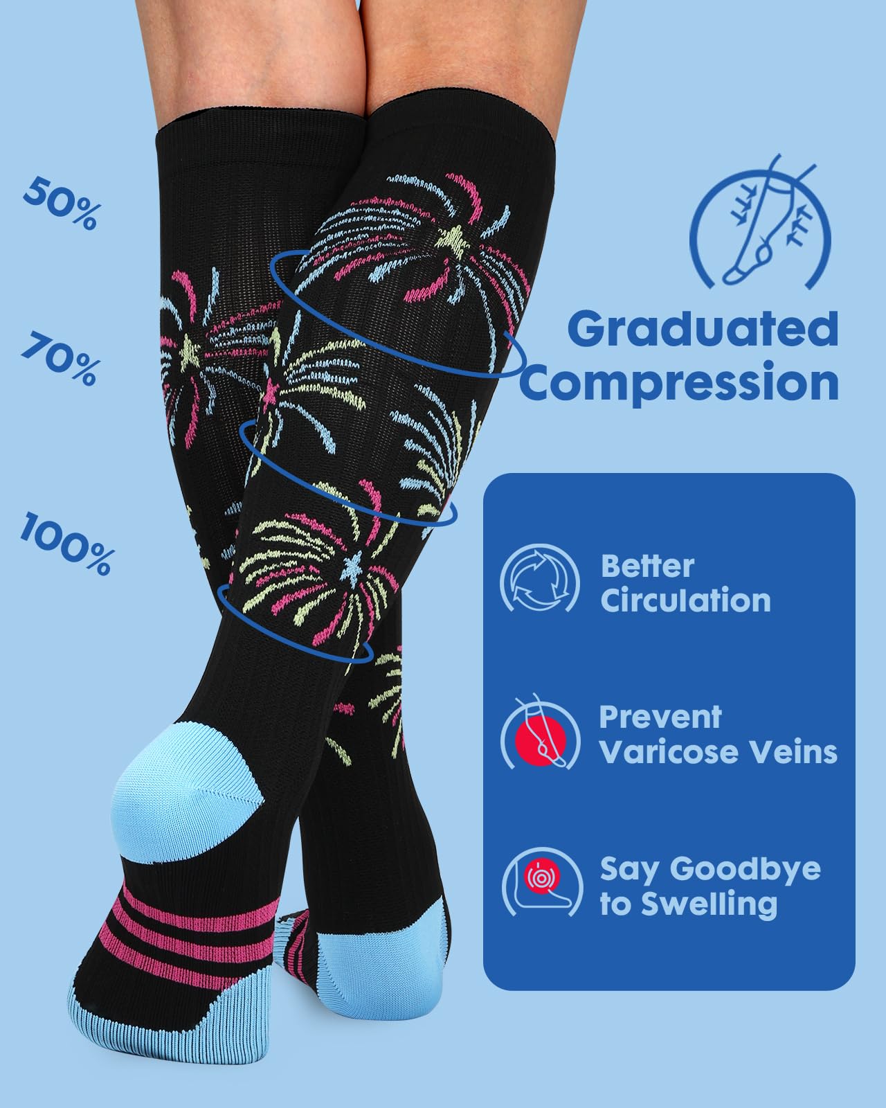 High Performance: These socks are perfect for reducing swelling and enhancing circulation. Whether you're running, standing, or recovering, the targeted compression offers muscle support and helps alleviate fatigue