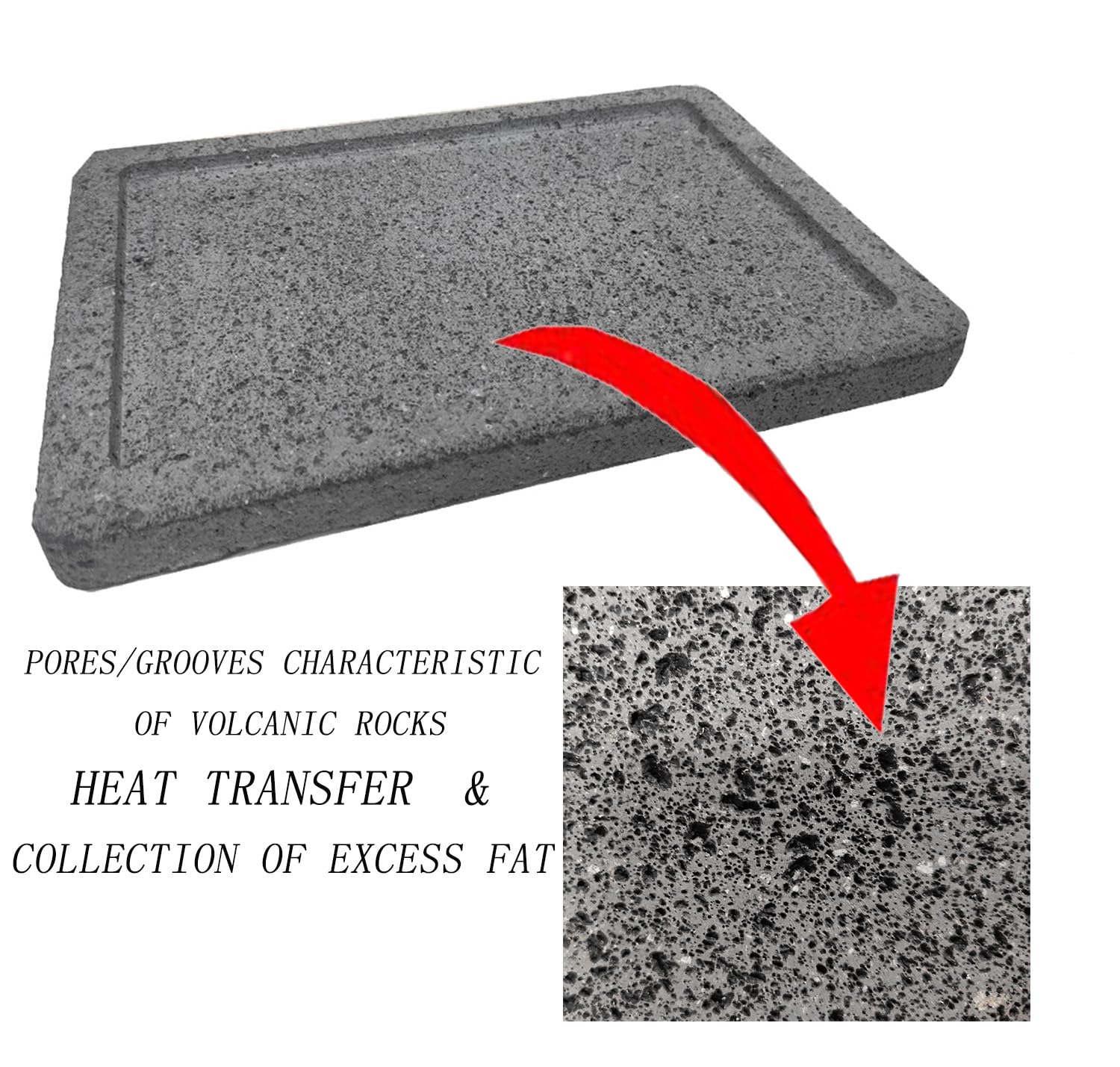 Heat transfer characteristic slot:The heat is transferred to the food through the small pores unique to the volcanic rock.Evenly heated, natural and healthy.In addition, during use, excess fat can be collected through these special holes/grooves