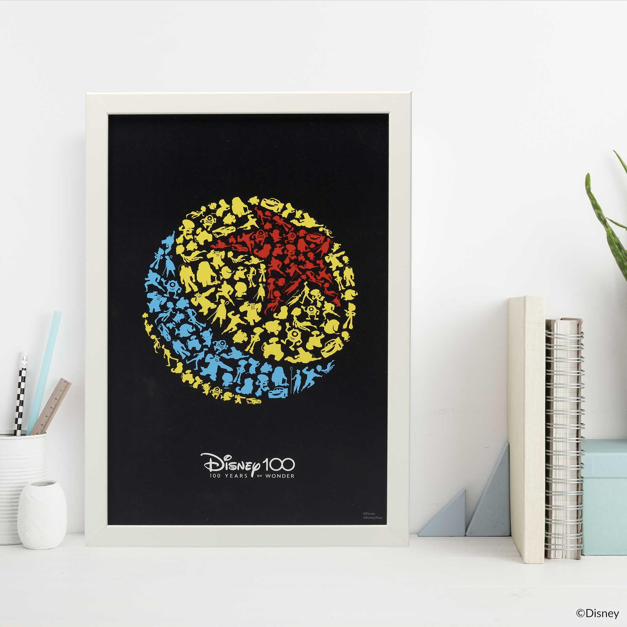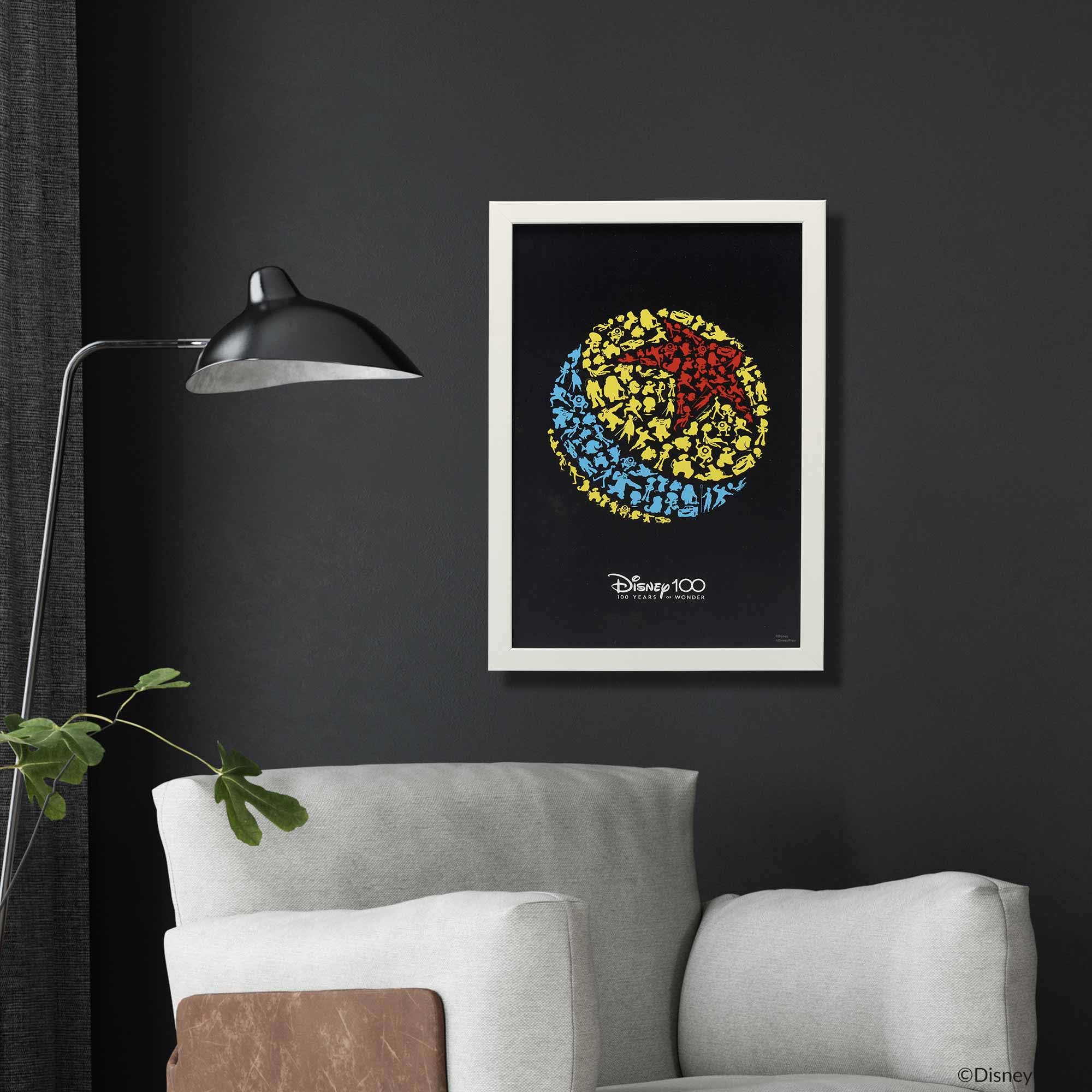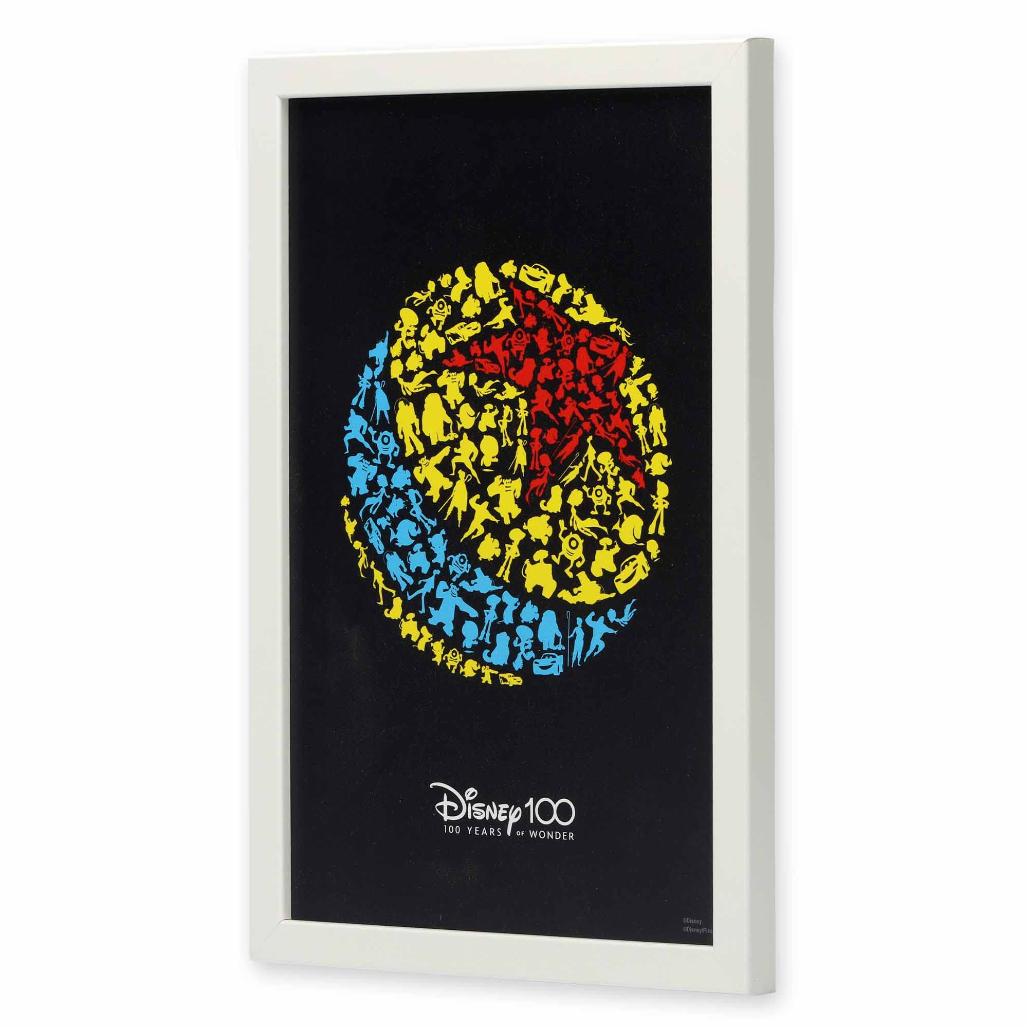 Framed Wood Wall Decor: Featuring a black frame, a white mat, a charcoal gray background, a colorful beach ball made up of countless beloved characters' silhouettes, and text that reads, "Disney 100 - 100 Years of Wonder," this wall decor is truly a must-have tribute for fans of all ages.