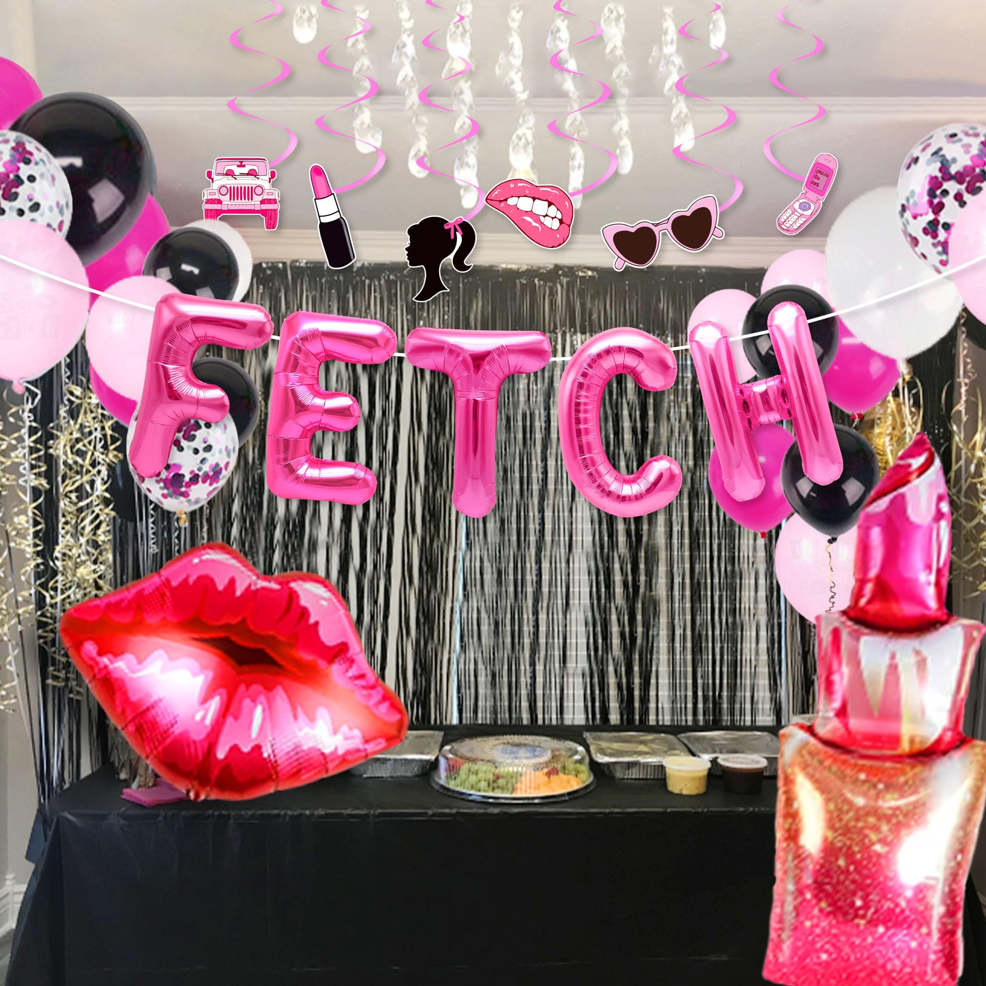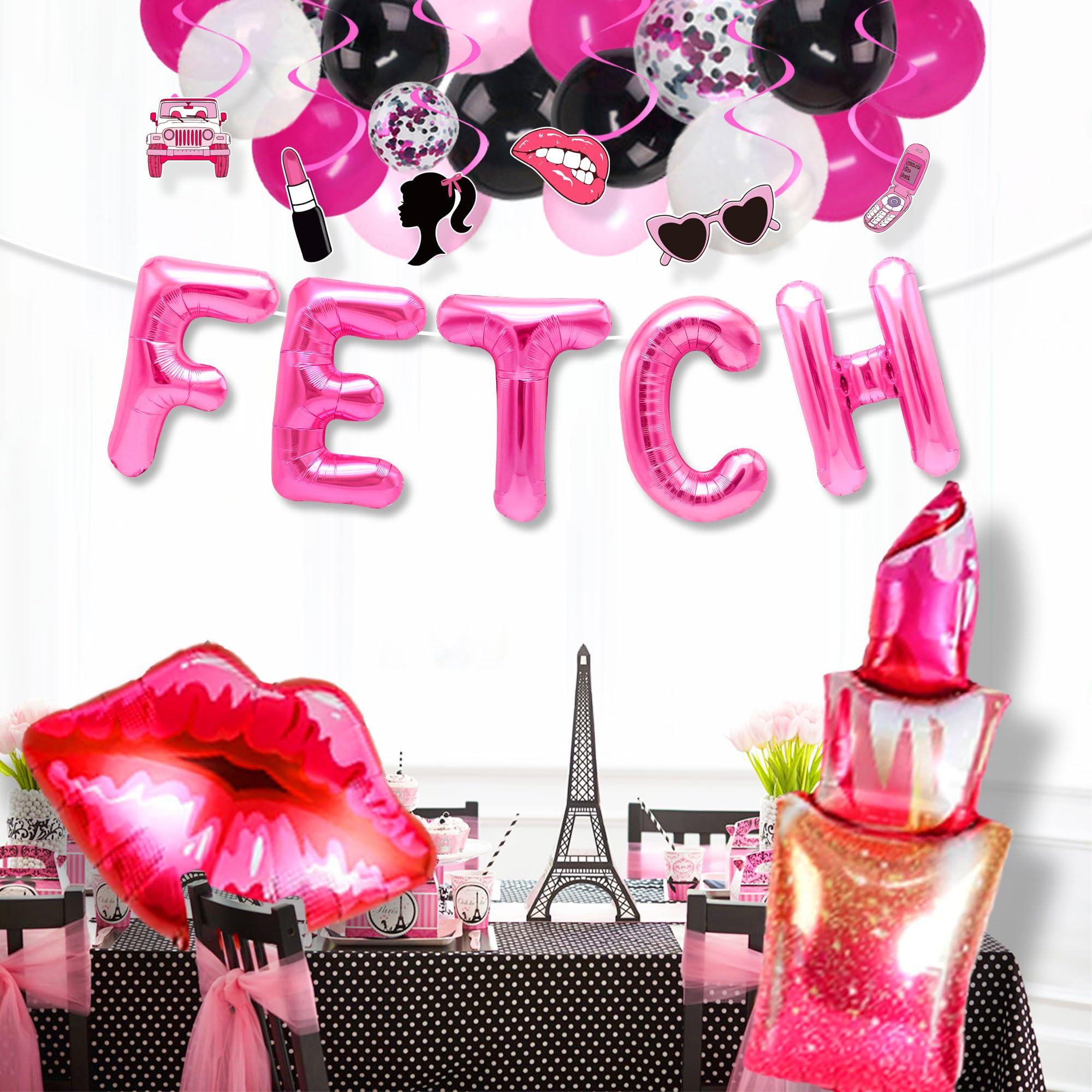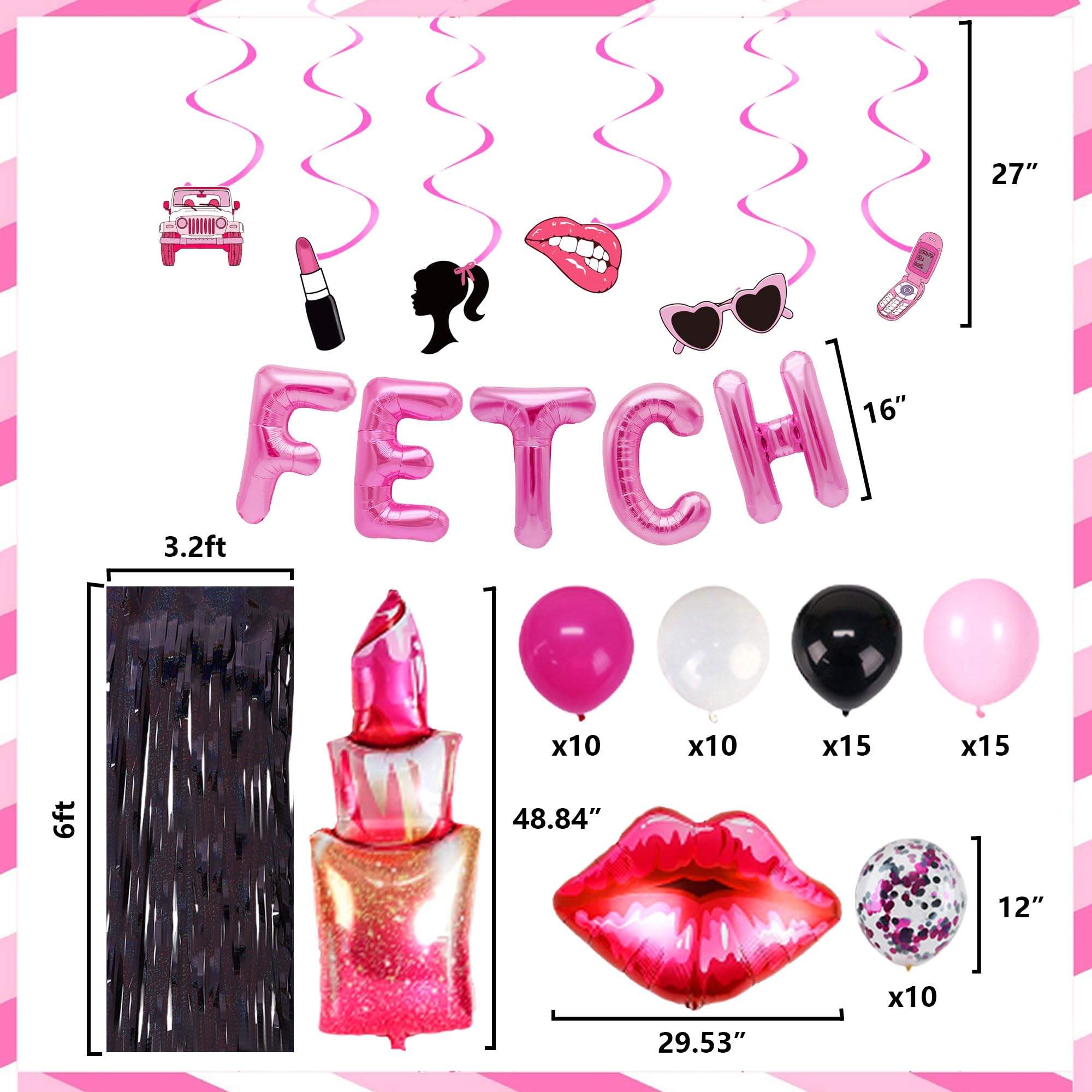 You will get: 1 x fetch balloon, 6 x mean girl party decoration, 1x lip balloon, 1 x lipstick balloon, 1 x black rain curtain, 60 x latex balloons( detail please refer to the pictures)