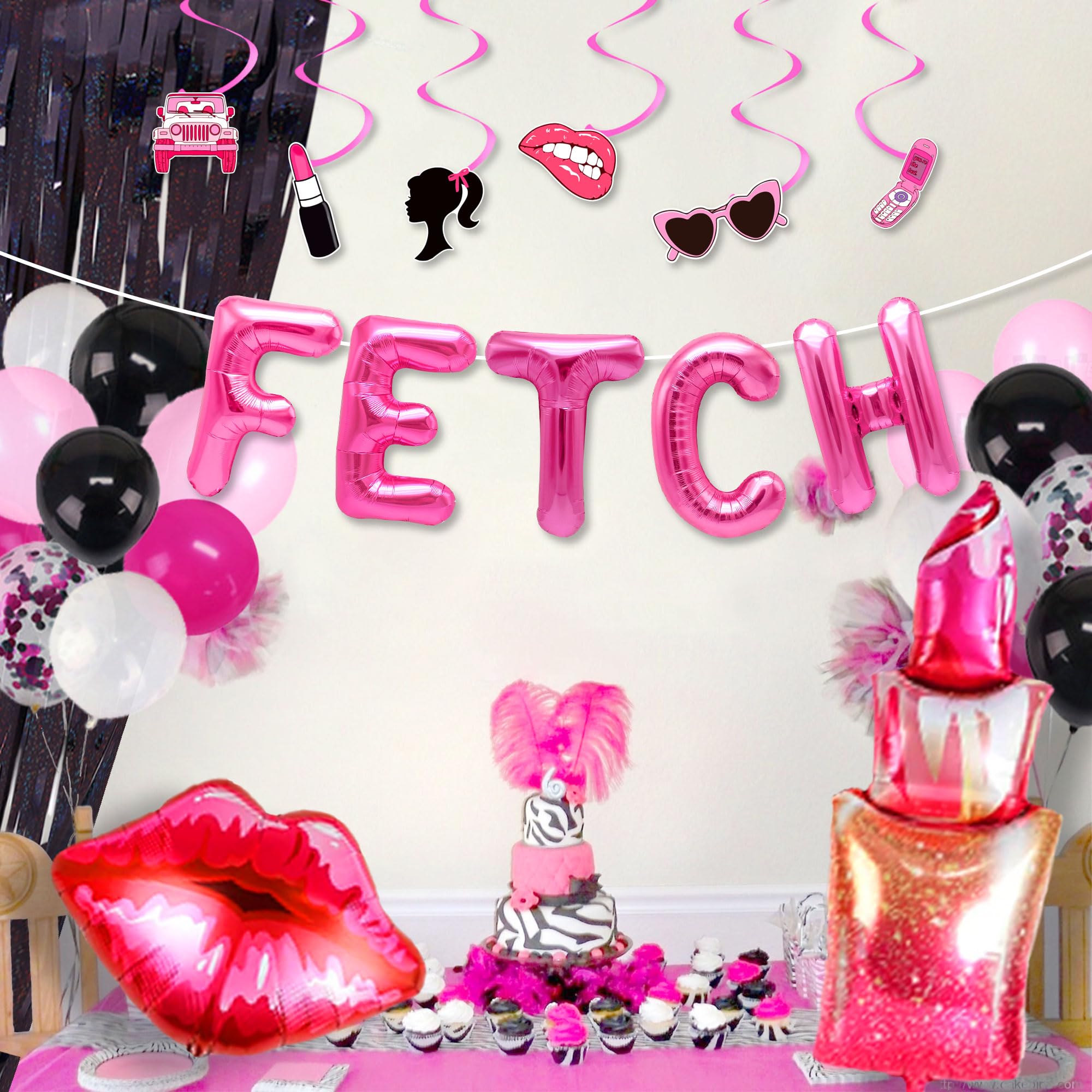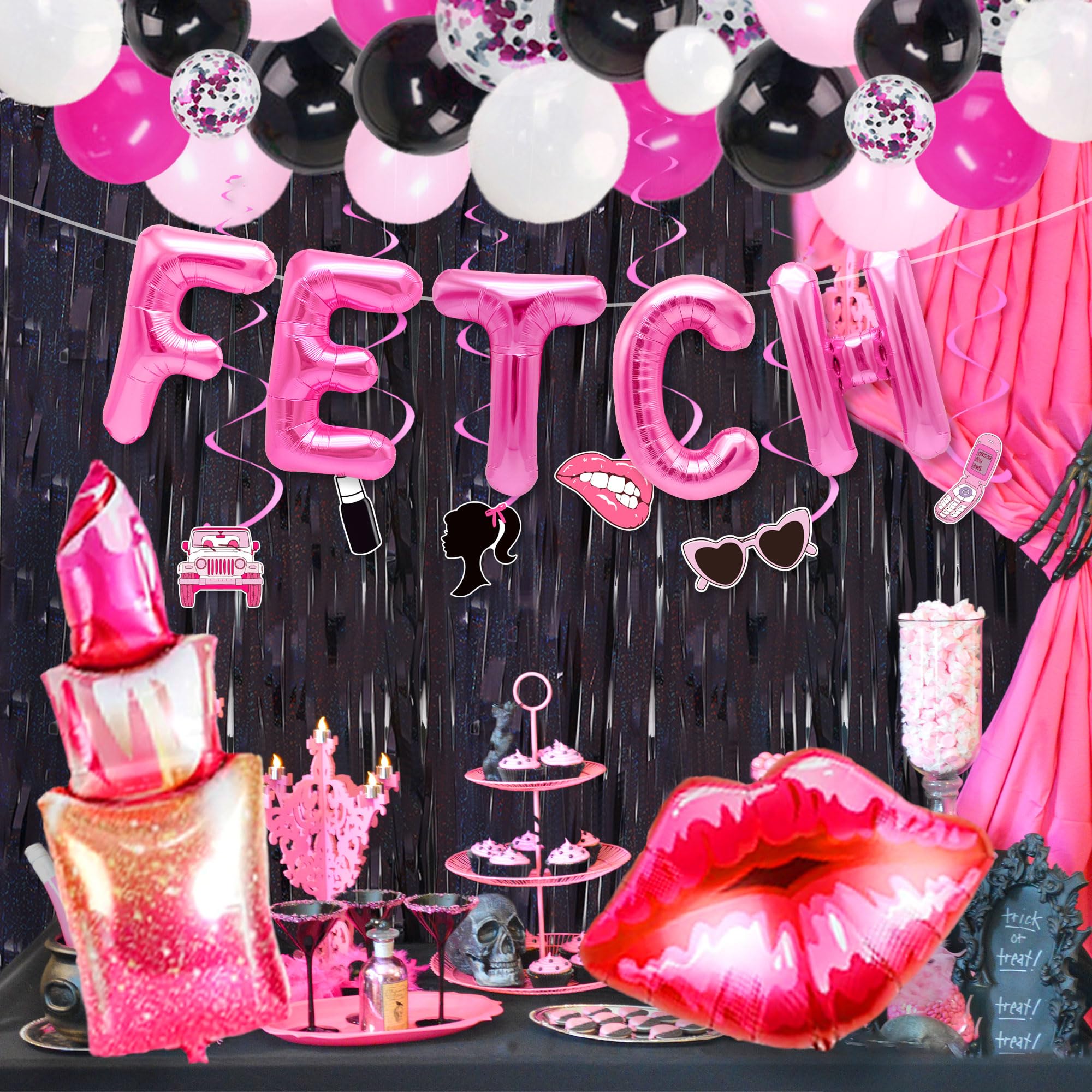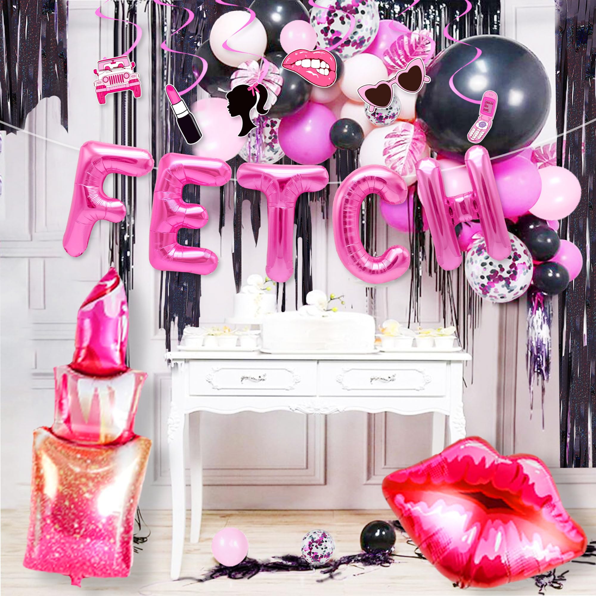You will get: 1 x fetch balloon, 6 x mean girl party decoration, 1x lip balloon, 1 x lipstick balloon, 1 x black rain curtain, 60 x latex balloons( detail please refer to the pictures)