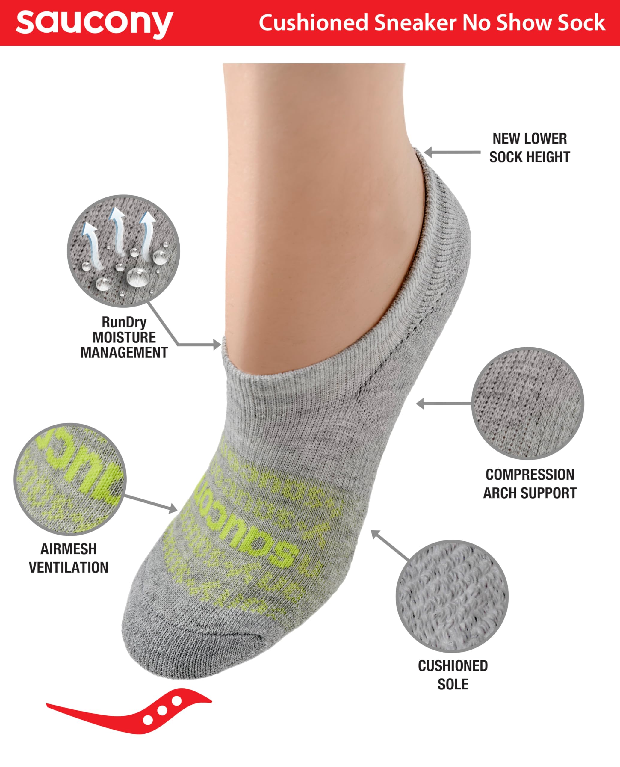 Description Saucony women's performance no show sock is a perfect combination of comfort and support. Great for the toughest training sessions. Features arch support, air mesh venting, and cushioned sole for lasting comfort. Run for Good - Saucony was founded way back in 1898. Ever since, we have been loyal to the sport, building goodness into every product and inviting millions around the world to run with us. At Saucony, we exist for runners, Runners inspire us, bringing us new idea, force us to be better, they drive our design and engineering. They keep us competitive. They keep us hungry. They keep us honest. This focus and passion fuels us as we strive to create the best running shoes and apparel on the planet. We leave work each day knowing we’ve done everything to make runners live just a little better.