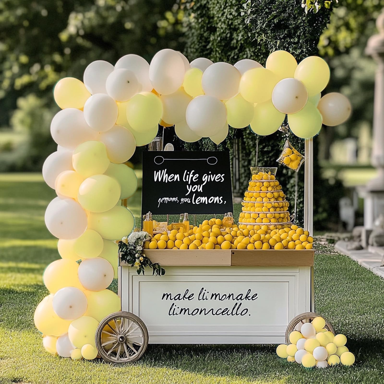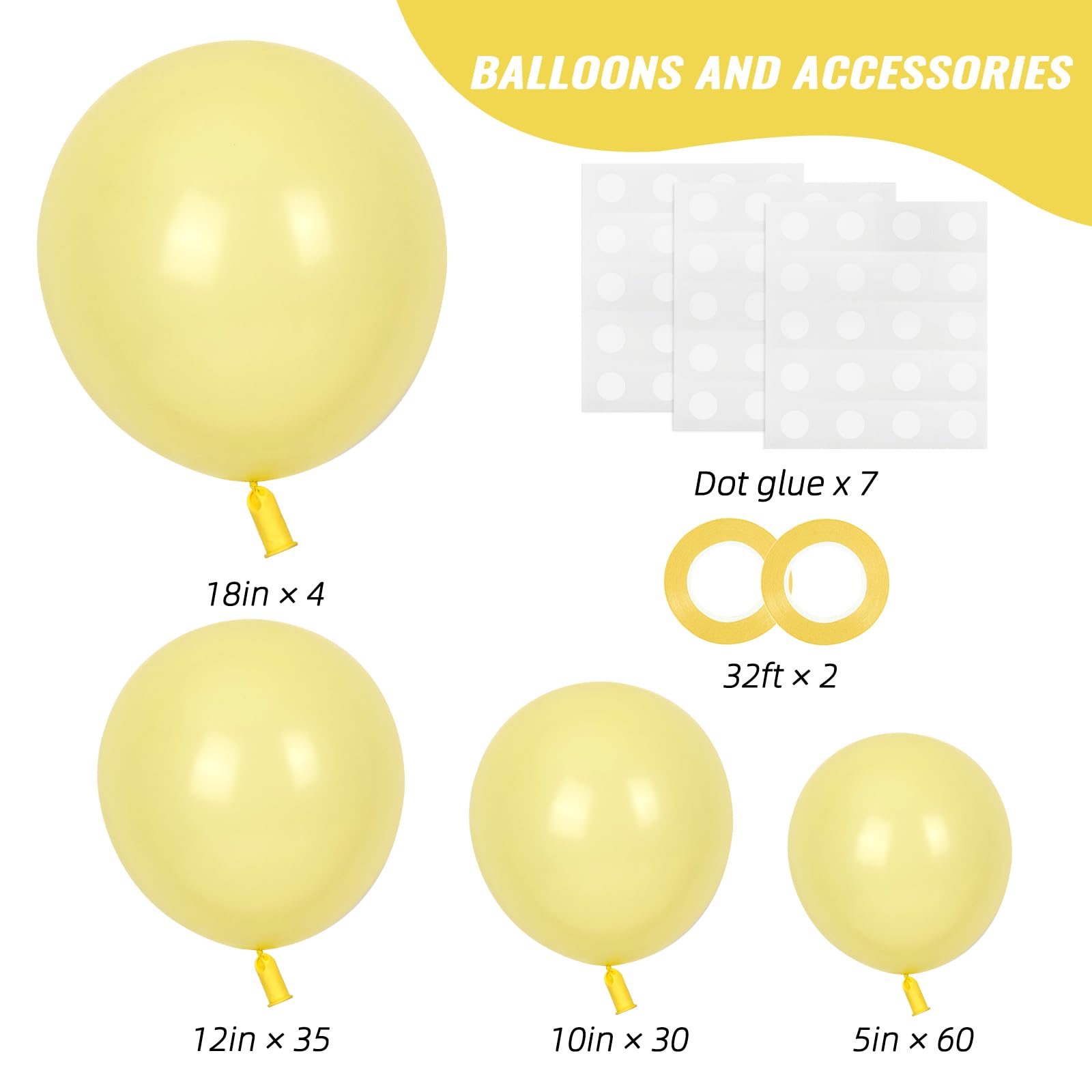 PASTEL YELLOW BALLOONS KIT: Includes 129 pastel yellow balloons - 18inch 4pcs, 12inch 35pcs, 10inch 30pcs, 5inch 60pcs and 7 pieces of glue, 2 rolls of ribbon of the same color. Balloons with different sizes can meet your different needs.