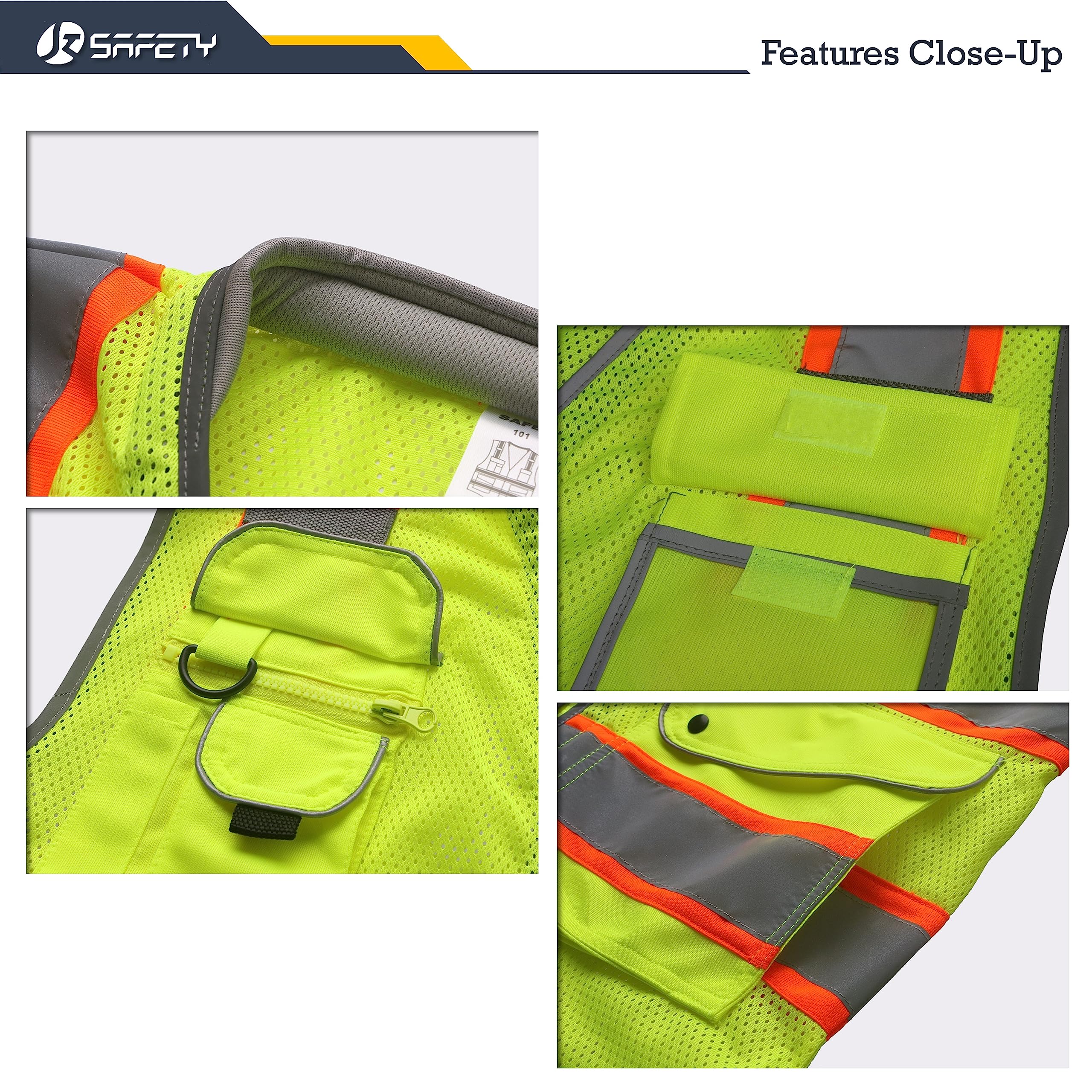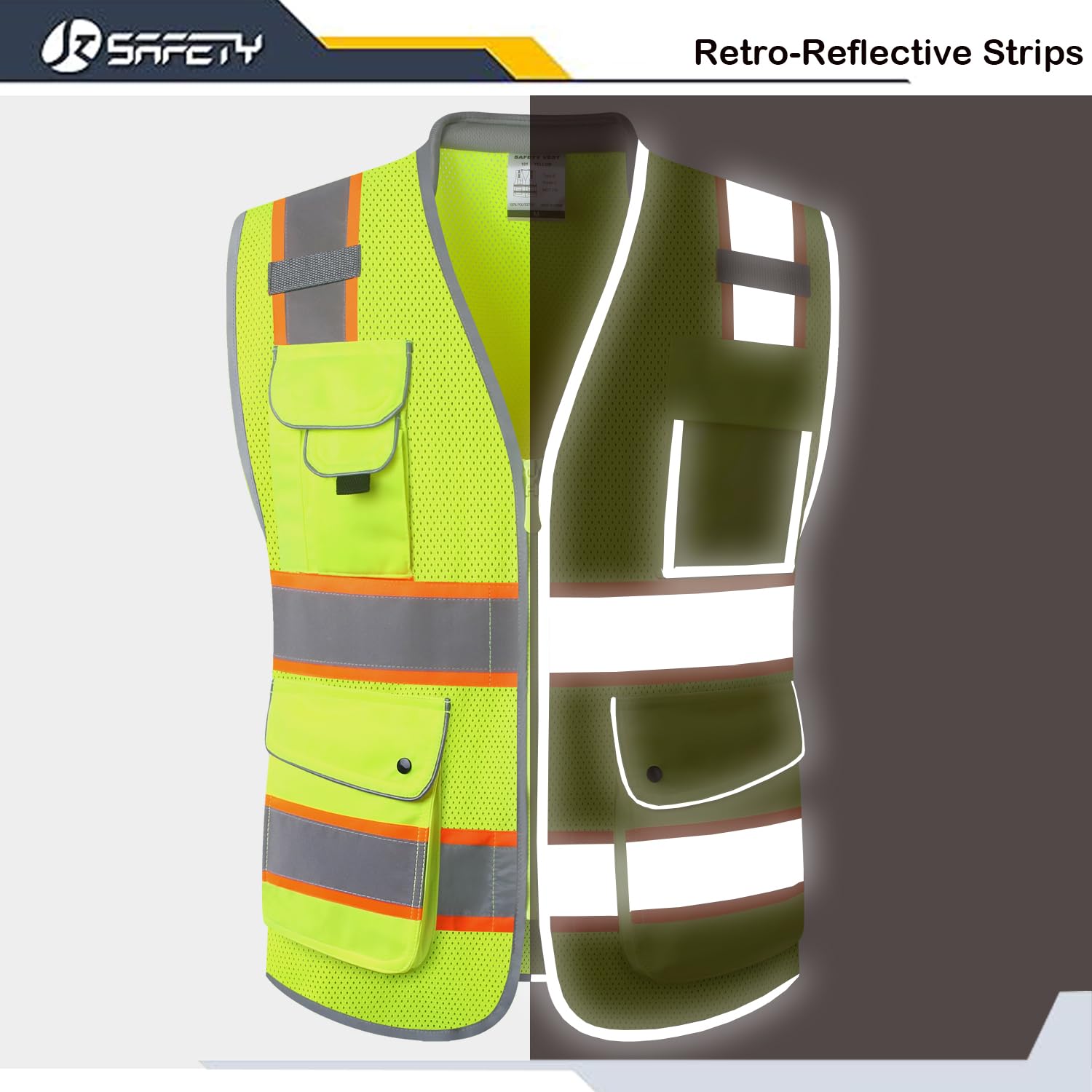 A total of four 2-inch wide high reflective tapes outlined by extended fluorescent color strips are used to maximize visibility. These strips are certified by a laboratory for their reflectiveness and compliance with ANSI and OSHA safety standards. They cover the shoulders, chest, and back, glowing when in contact with any light sources and making you visible to others at your workplace.