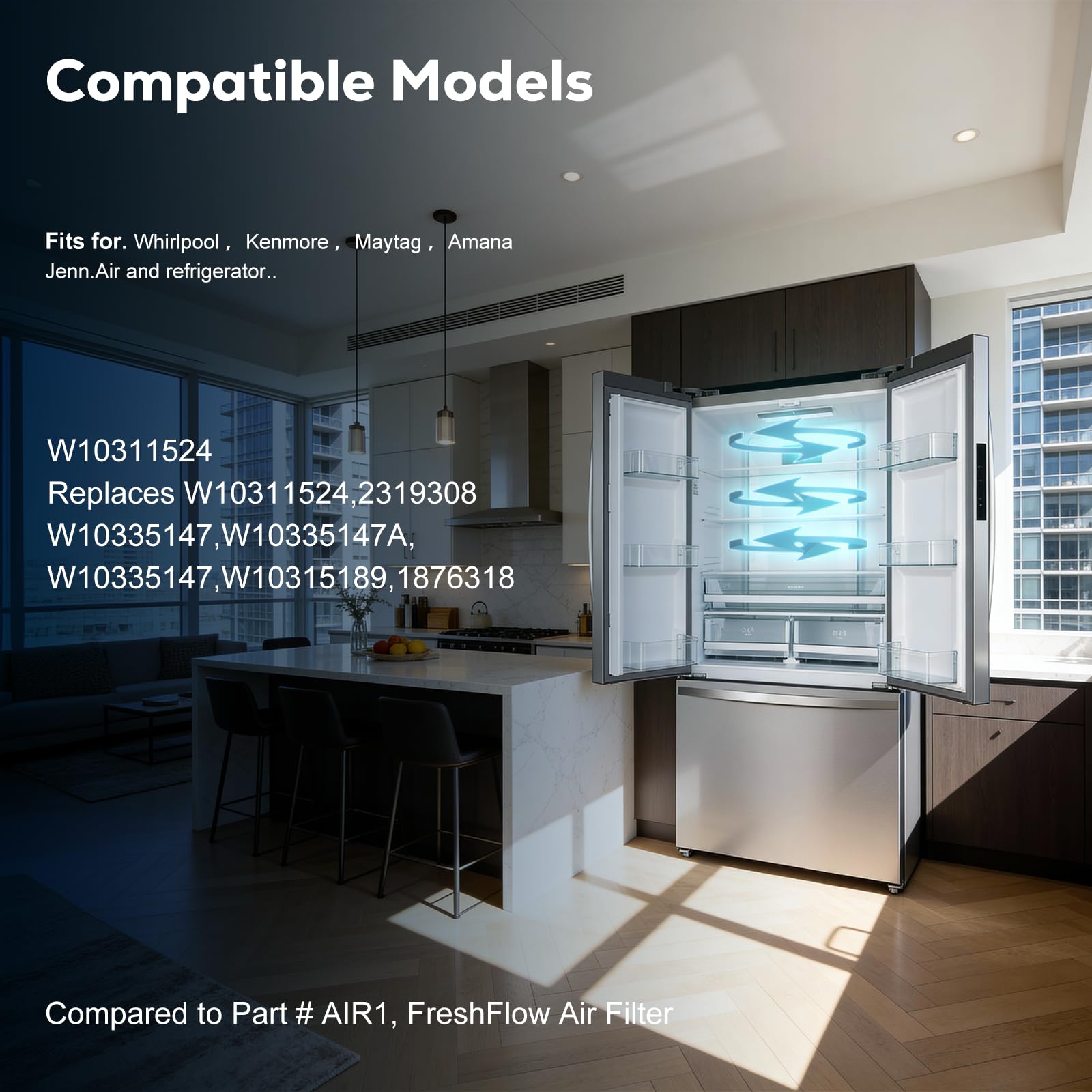 PERFECT FIT - W10311524 air filter is specifically designed replacement for Whirlpool, Kenmore, Maytag, Amana and Jenn.Air refrigerator. W10311524 directly replaces part number W10311524, 2319308, W10335147, W10335147A, W10335147, W10315189, 1876318. Compared to Part # AIR1, FreshFlow Air Filter. Warm tips: Doesn't include the indicator pack (Contact us if you are not clear the models, and we are here to help within 24 hours)